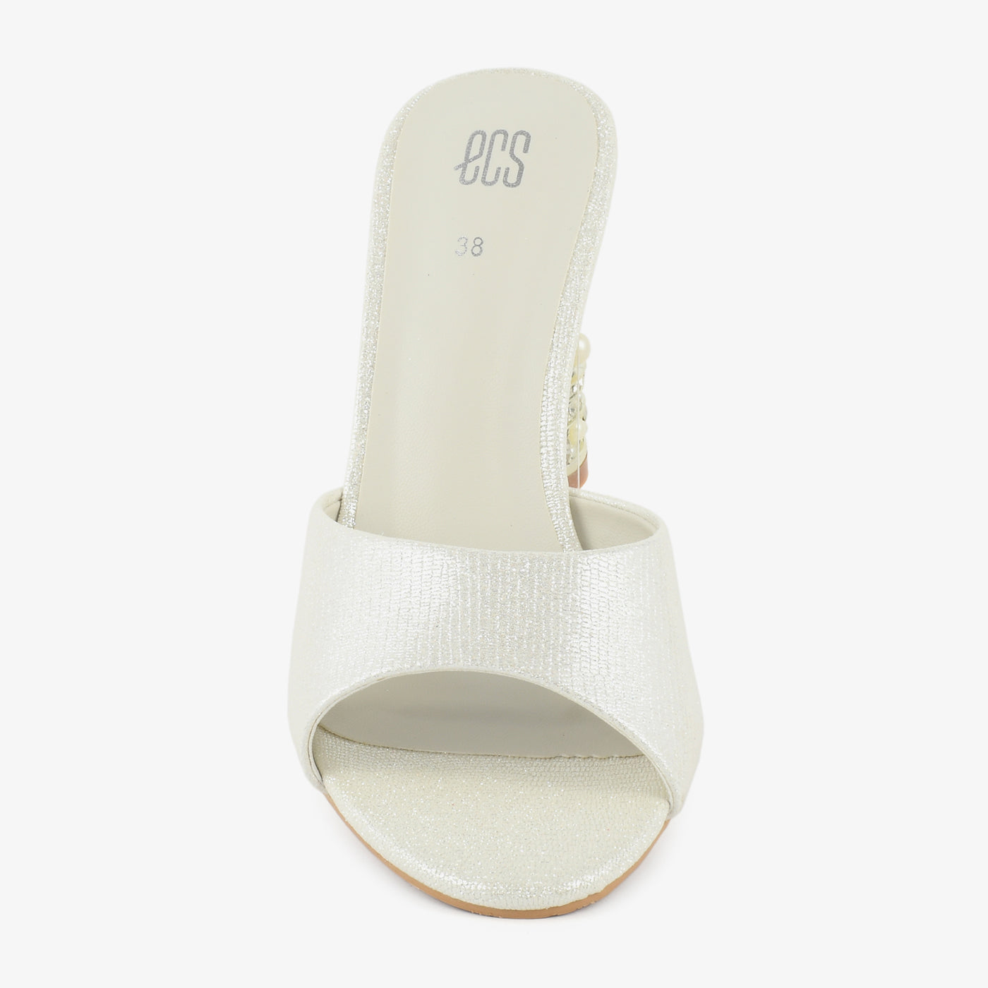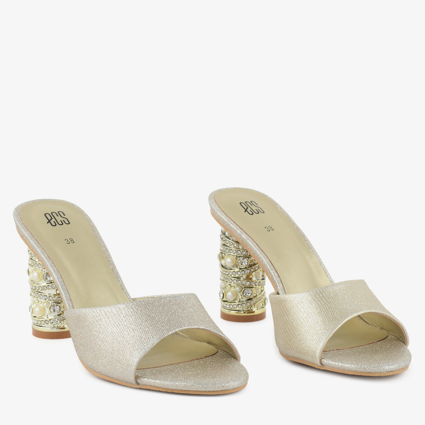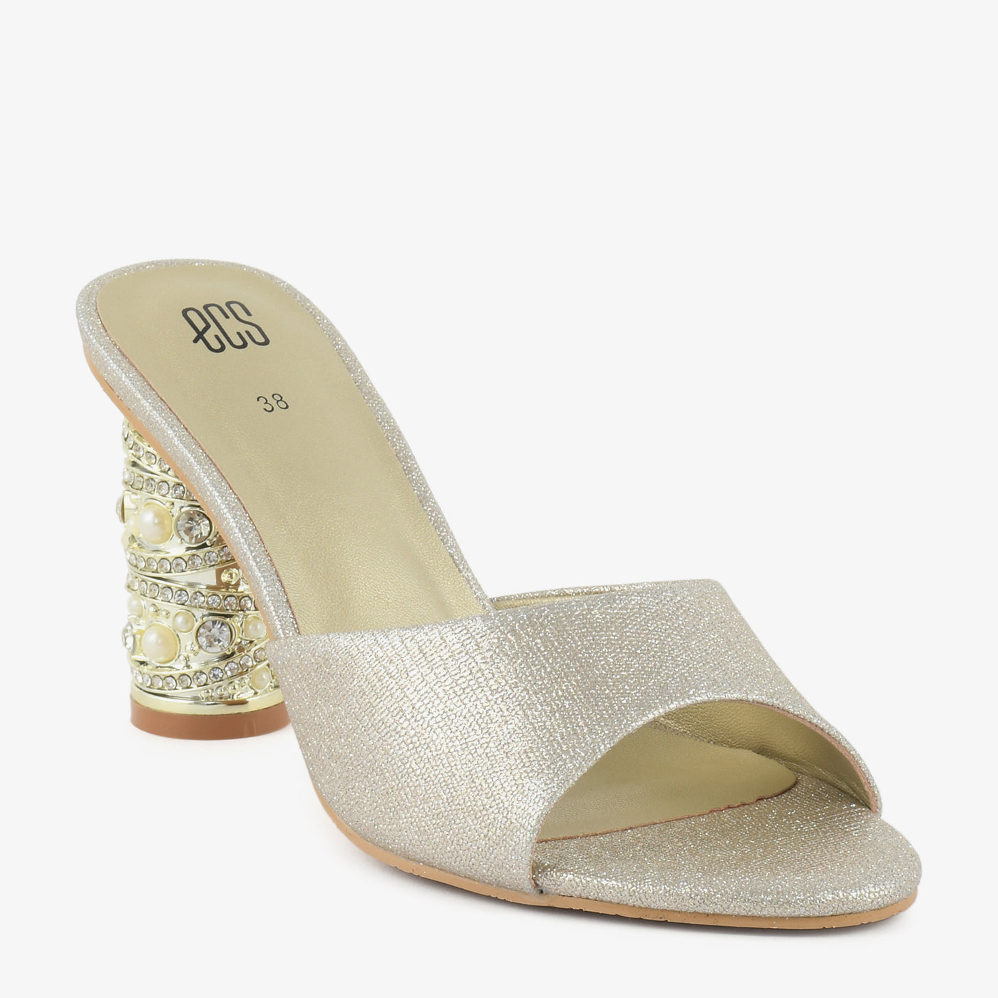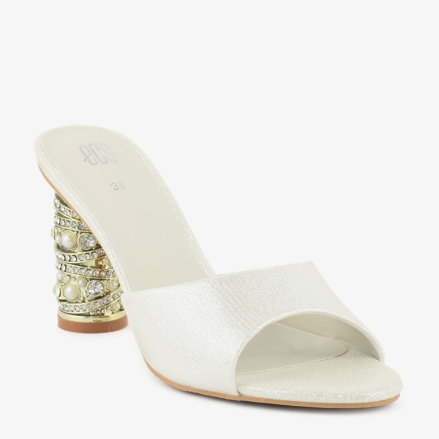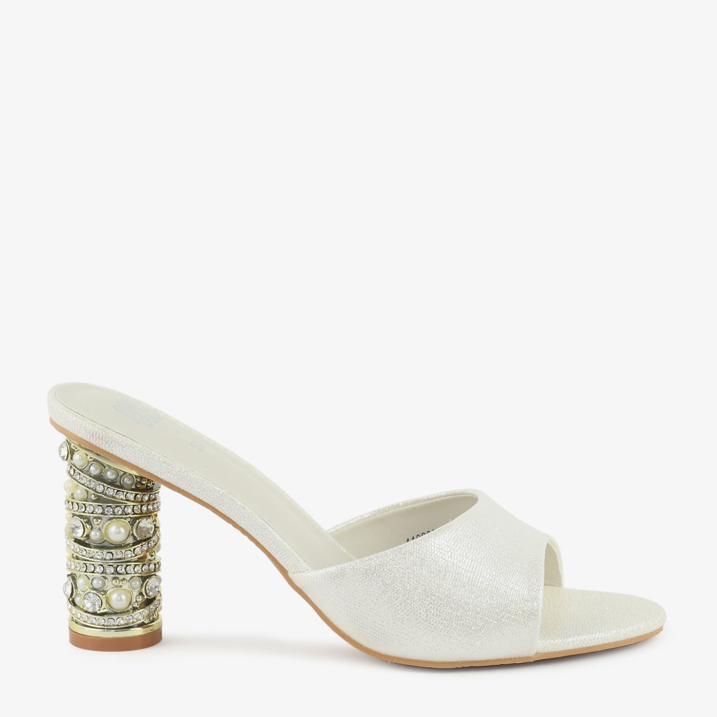 This elegant heel features a sleek slip-on design highlighted by a statement cylindrical heel adorned with decorative accents that add a luxurious touch. The smooth front strap offers a refined look while the cushioned insole ensures comfort for extended wear. Designed to balance style and stability, this heel is ideal for special occasions and evening events.