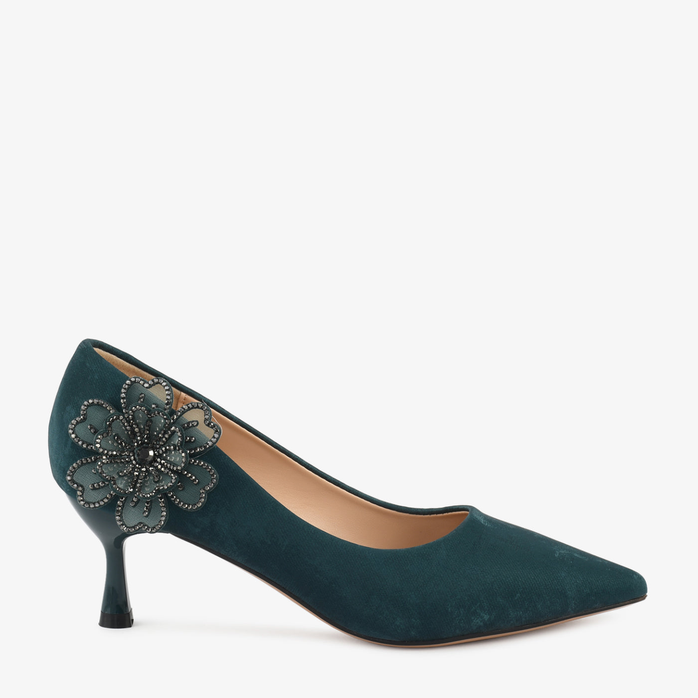 A stunning statement coat shoe featuring an intricate floral beaded motif on the side. This delicate embellishment adds feminine charm and regal sophistication. Designed for festive occasions, it offers a...