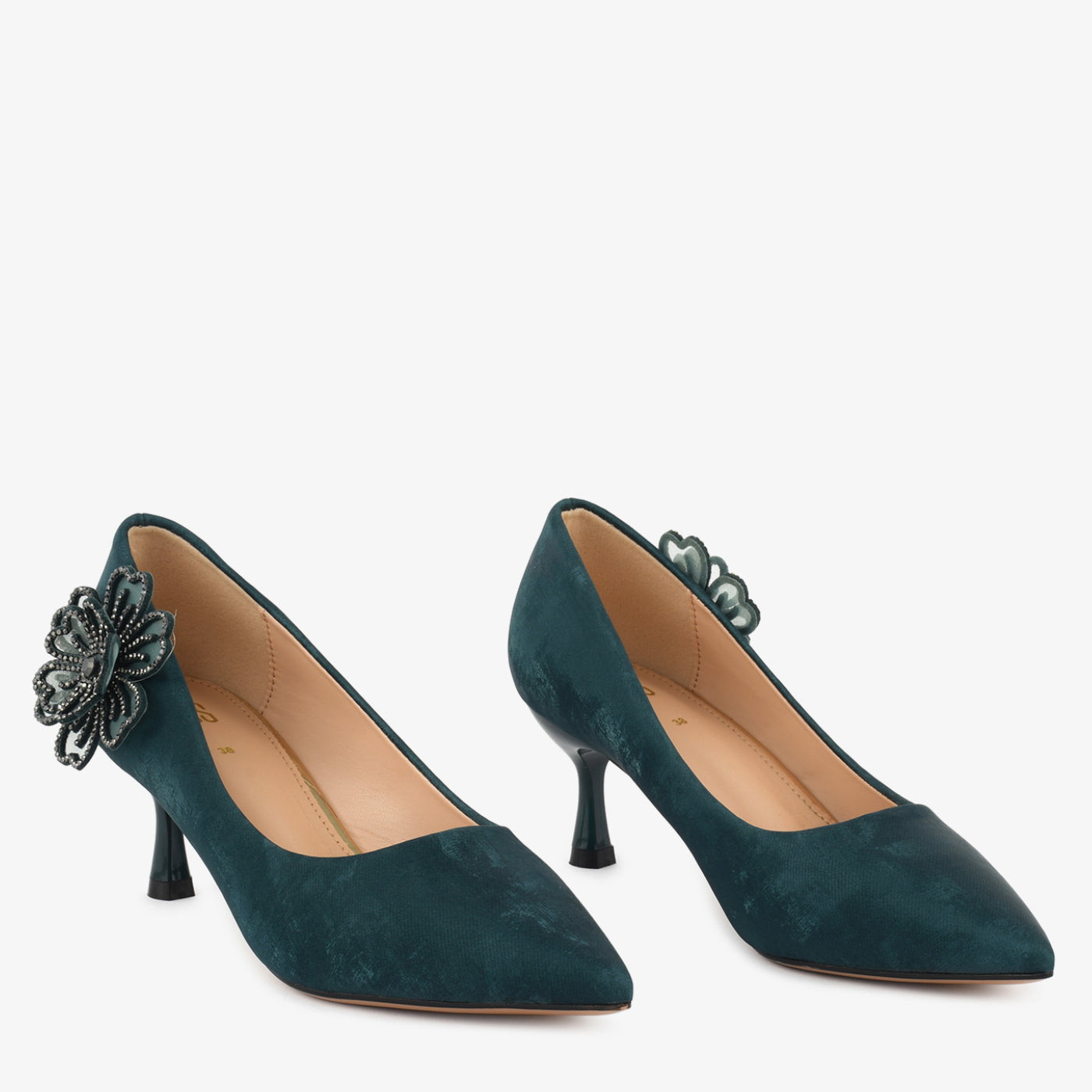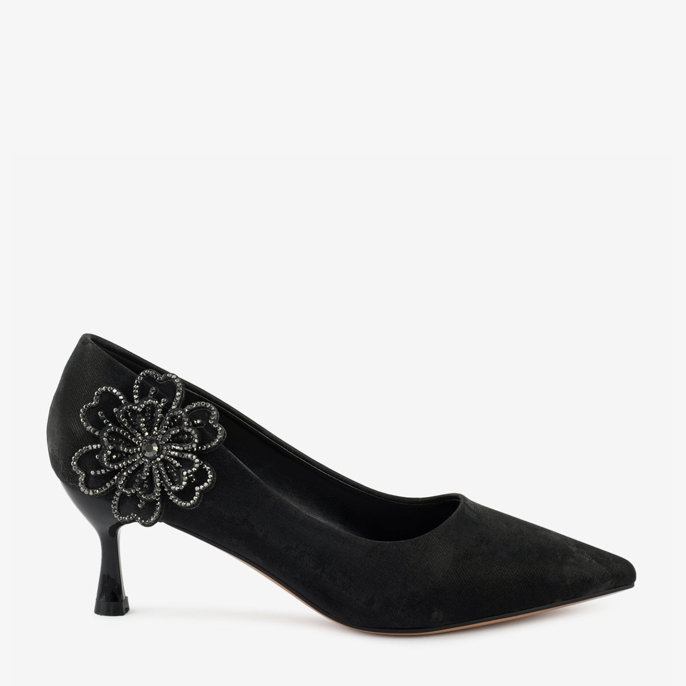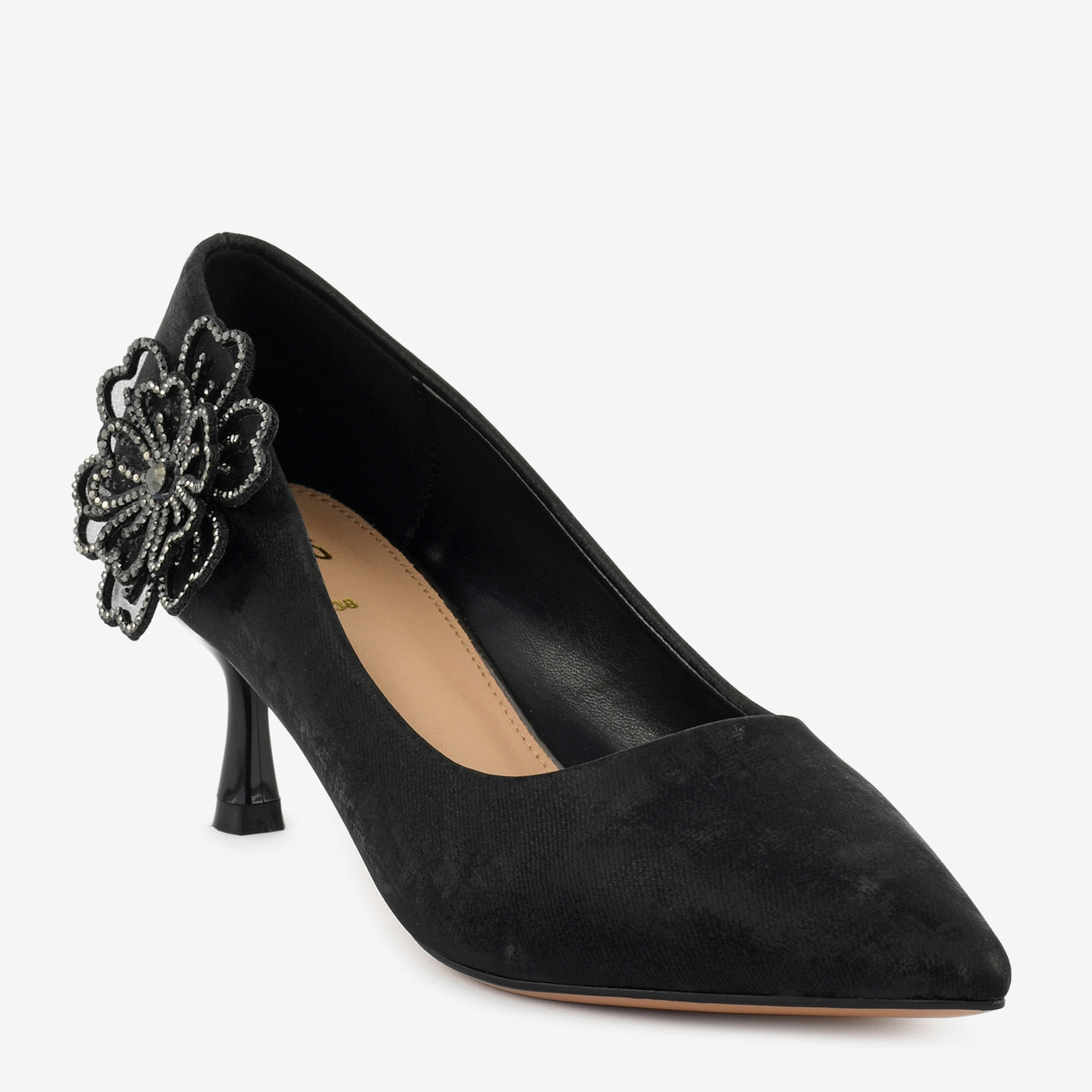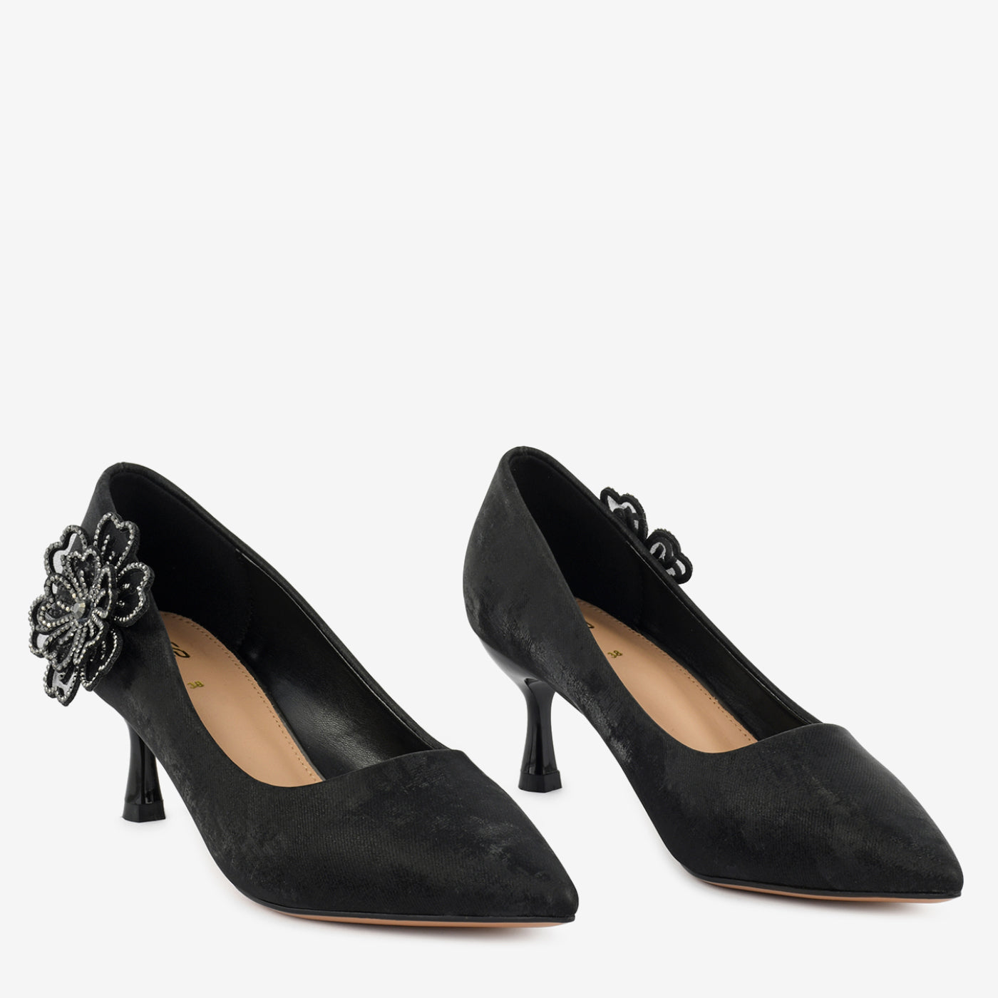 A stunning statement coat shoe featuring an intricate floral beaded motif on the side. This delicate embellishment adds feminine charm and regal sophistication. Designed for festive occasions, it offers a sleek pointed shape and soft inner cushioning. Ideal for elegant modest styling.