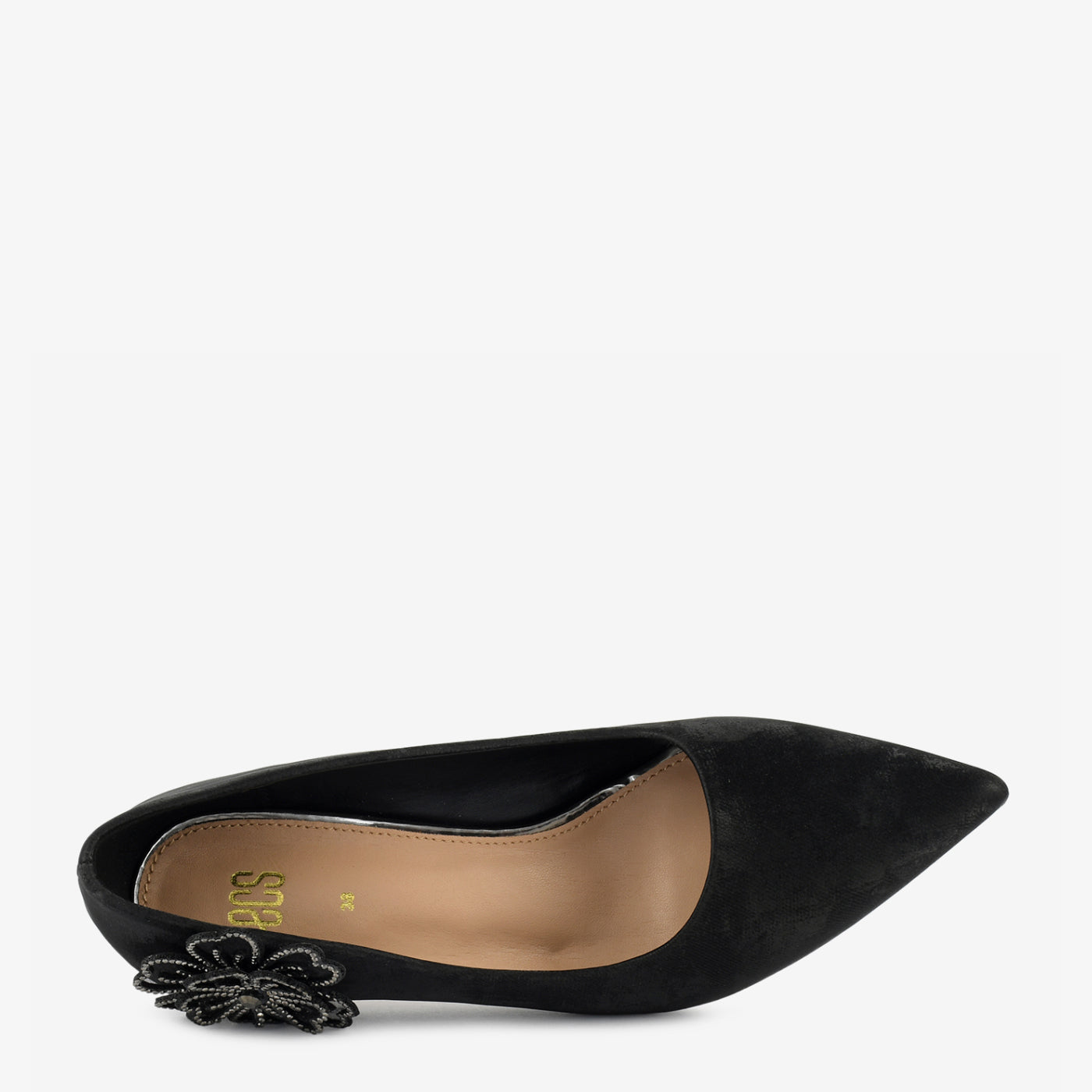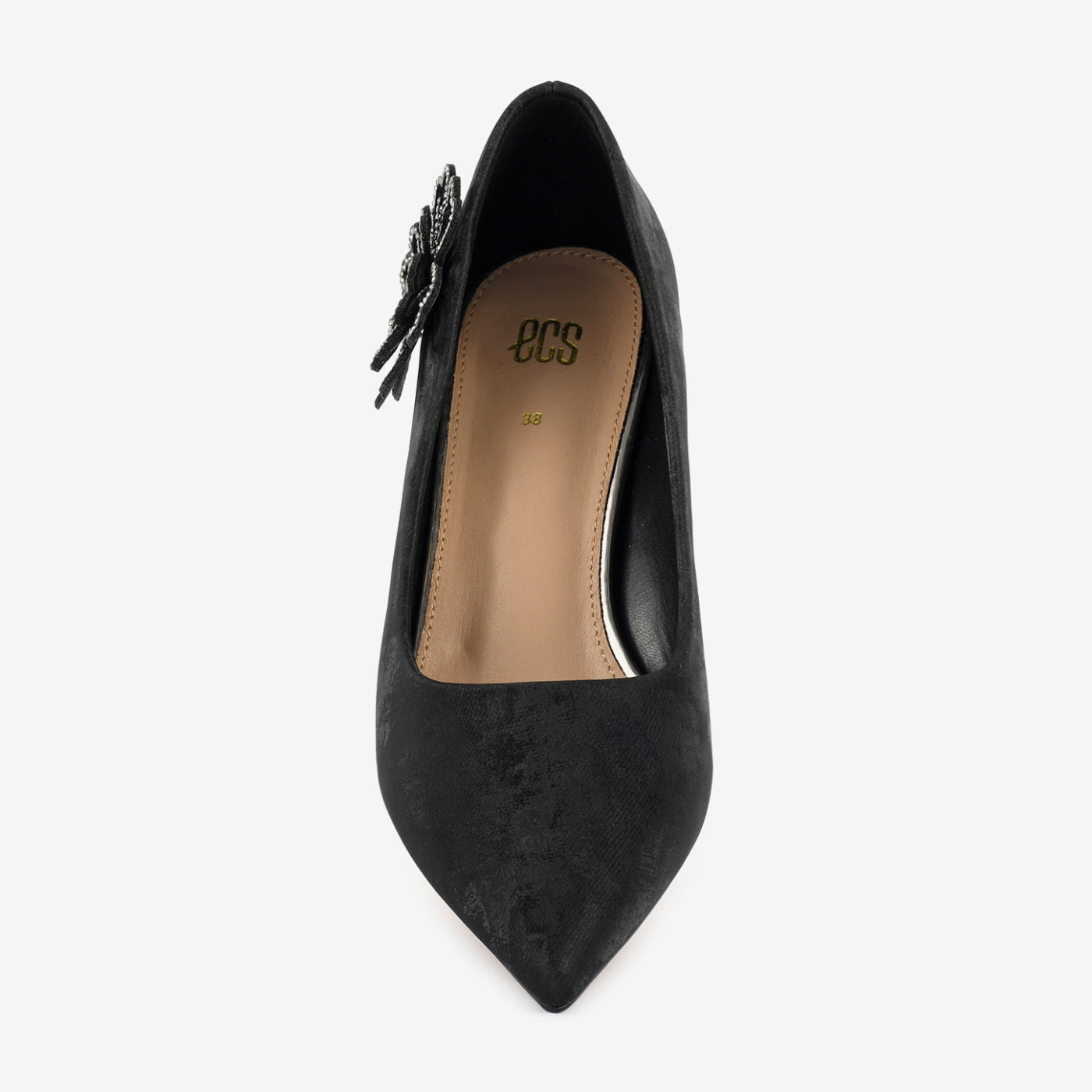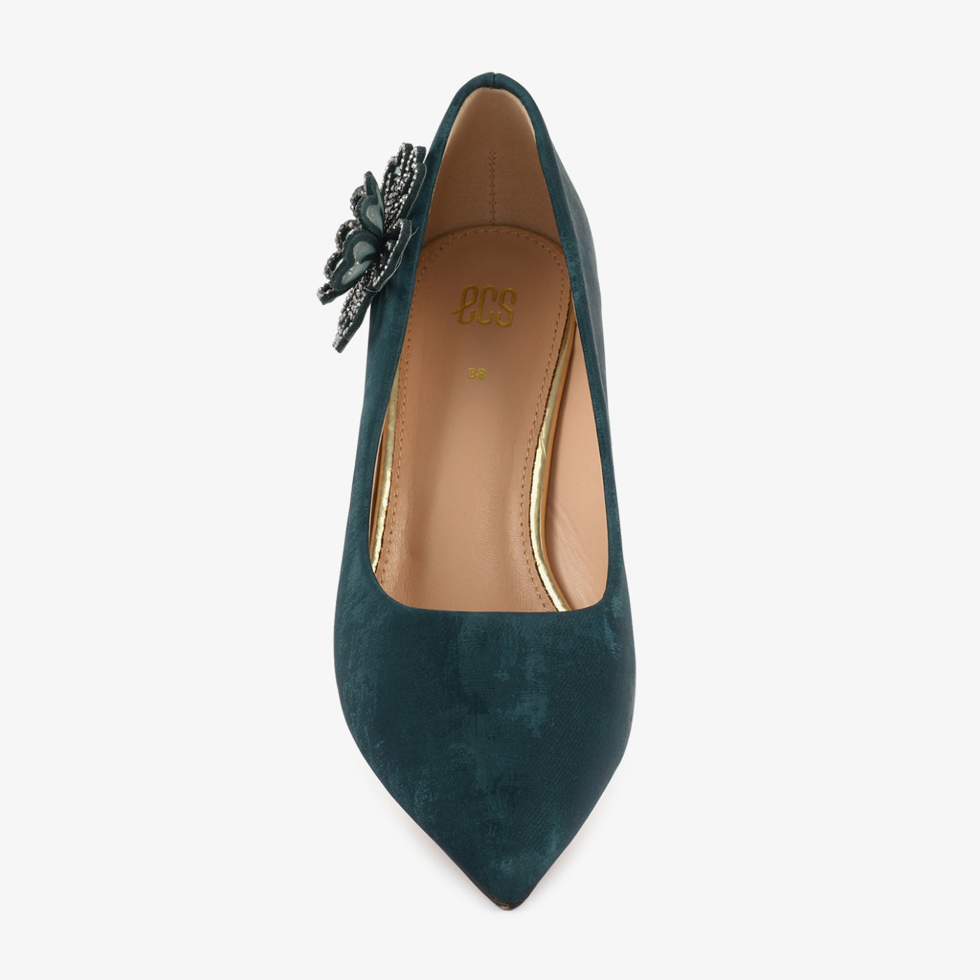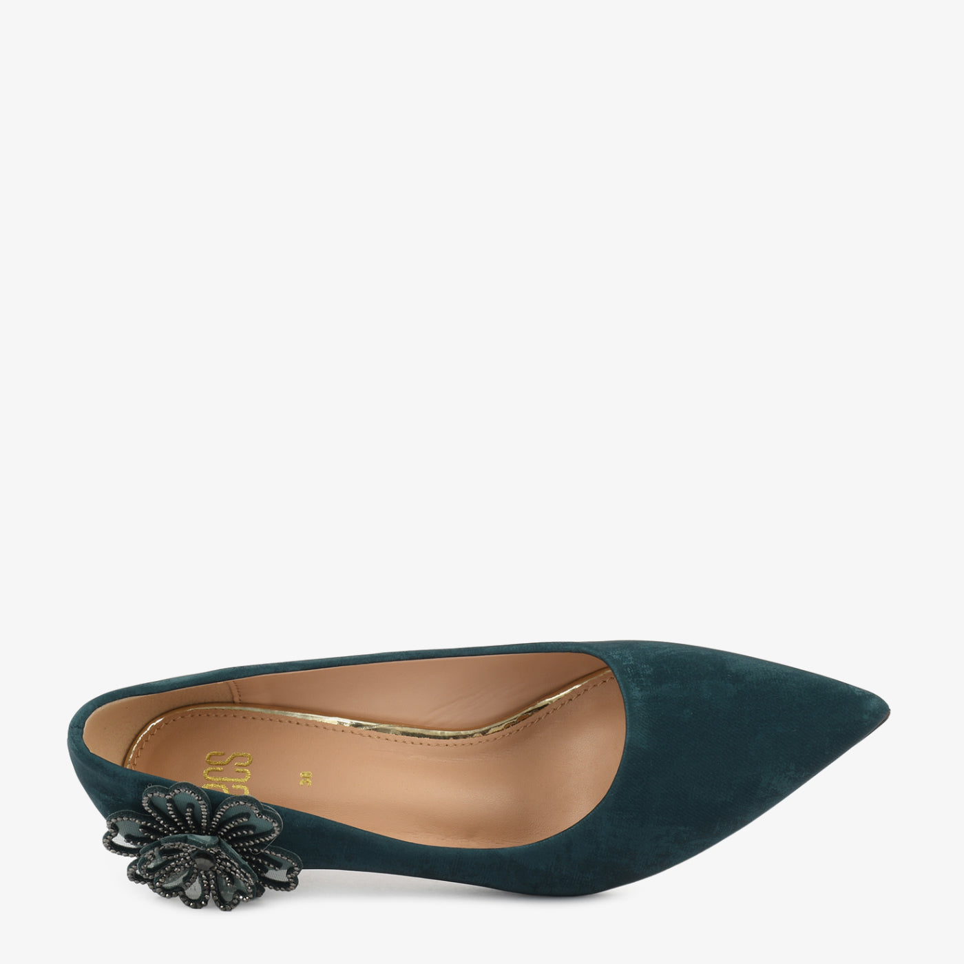 A stunning statement coat shoe featuring an intricate floral beaded motif on the side. This delicate embellishment adds feminine charm and regal sophistication. Designed for festive occasions, it offers a sleek pointed shape and soft inner cushioning. Ideal for elegant modest styling.