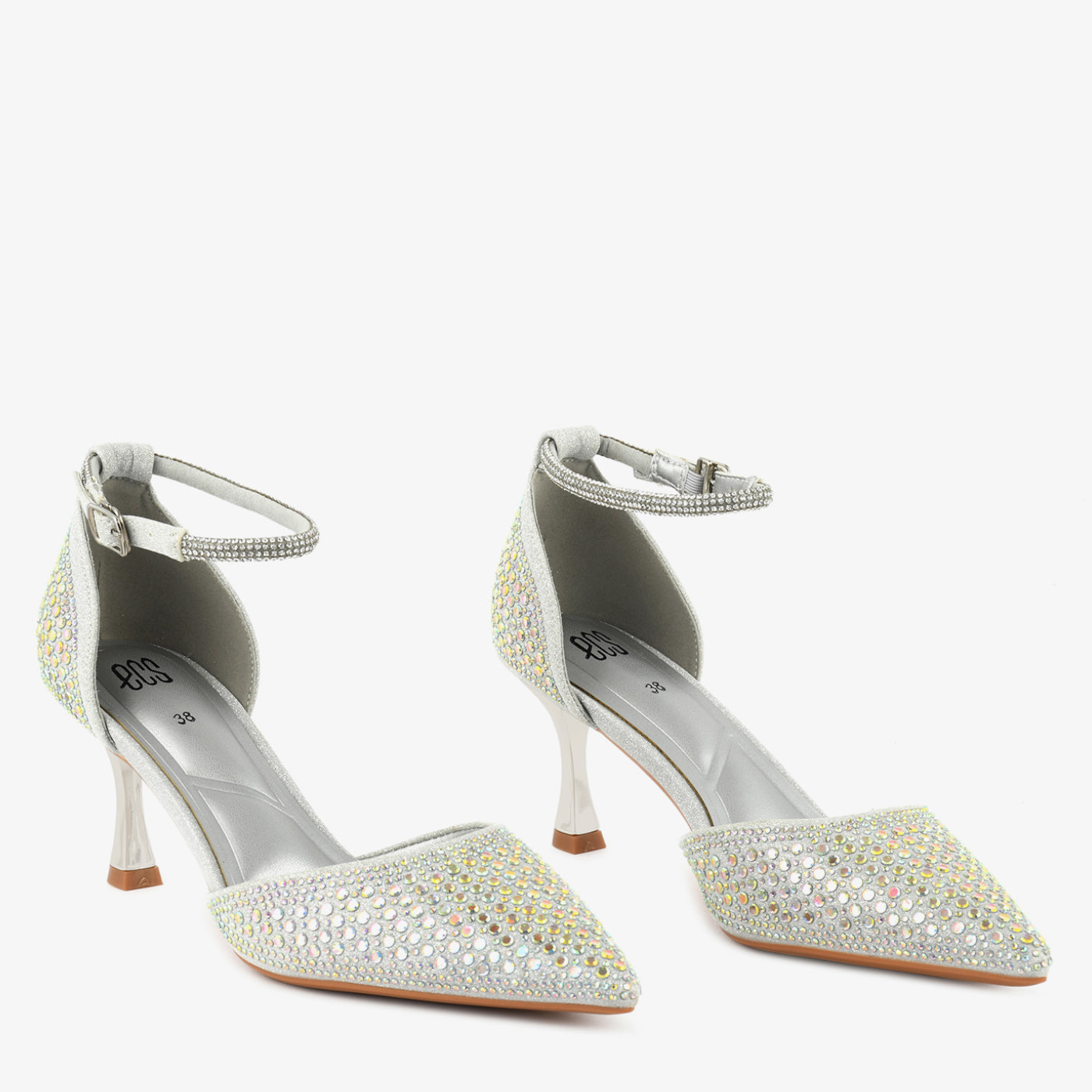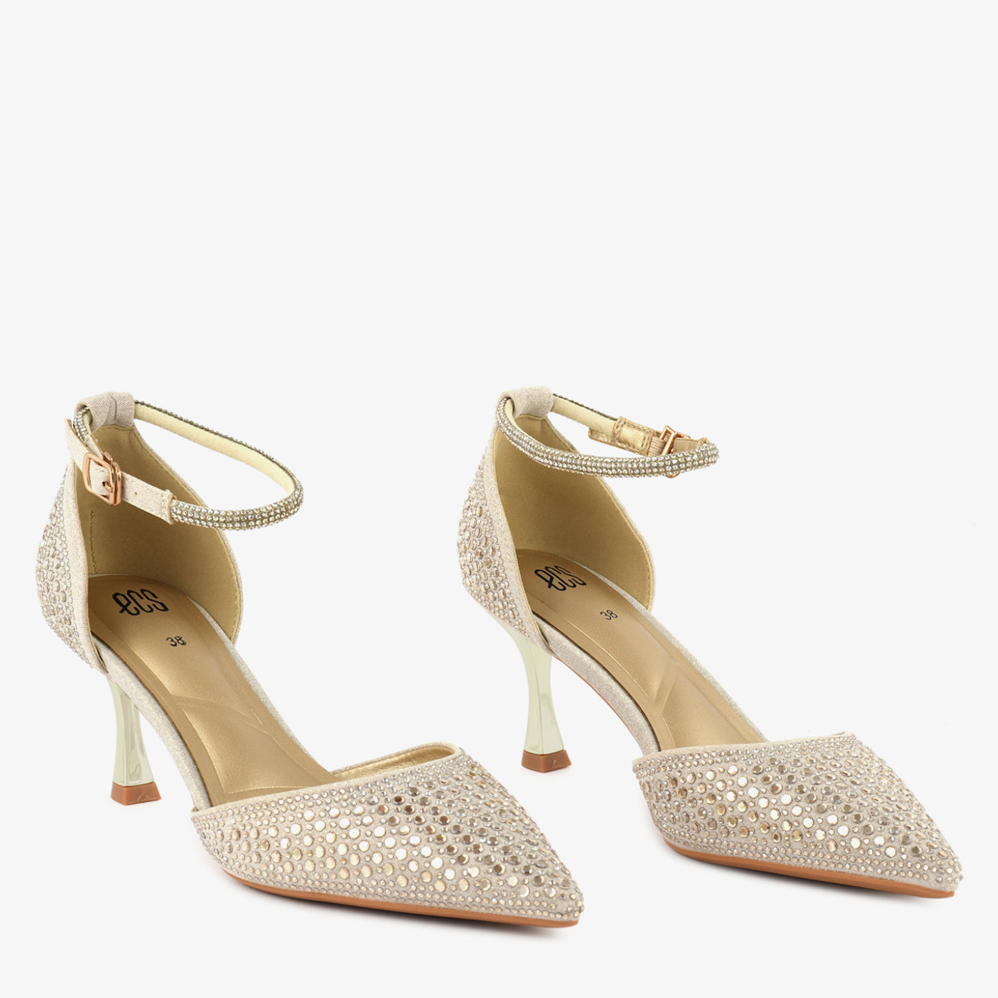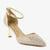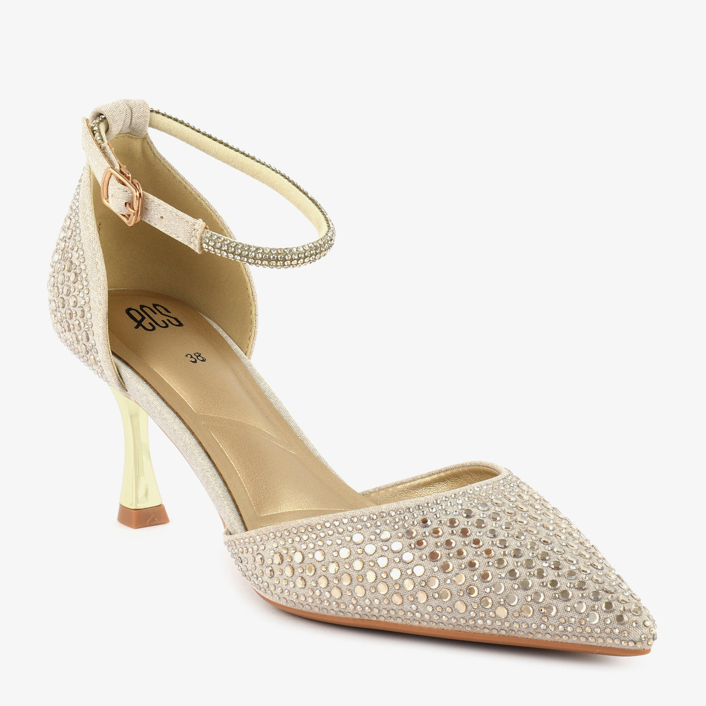Luminous and poised, this pointed-toe heel brings a refined glow to any look. The crystal-embellished surface and delicate ankle strap add polished elegance. Designed to make evening wear feel effortlessly elevated.
