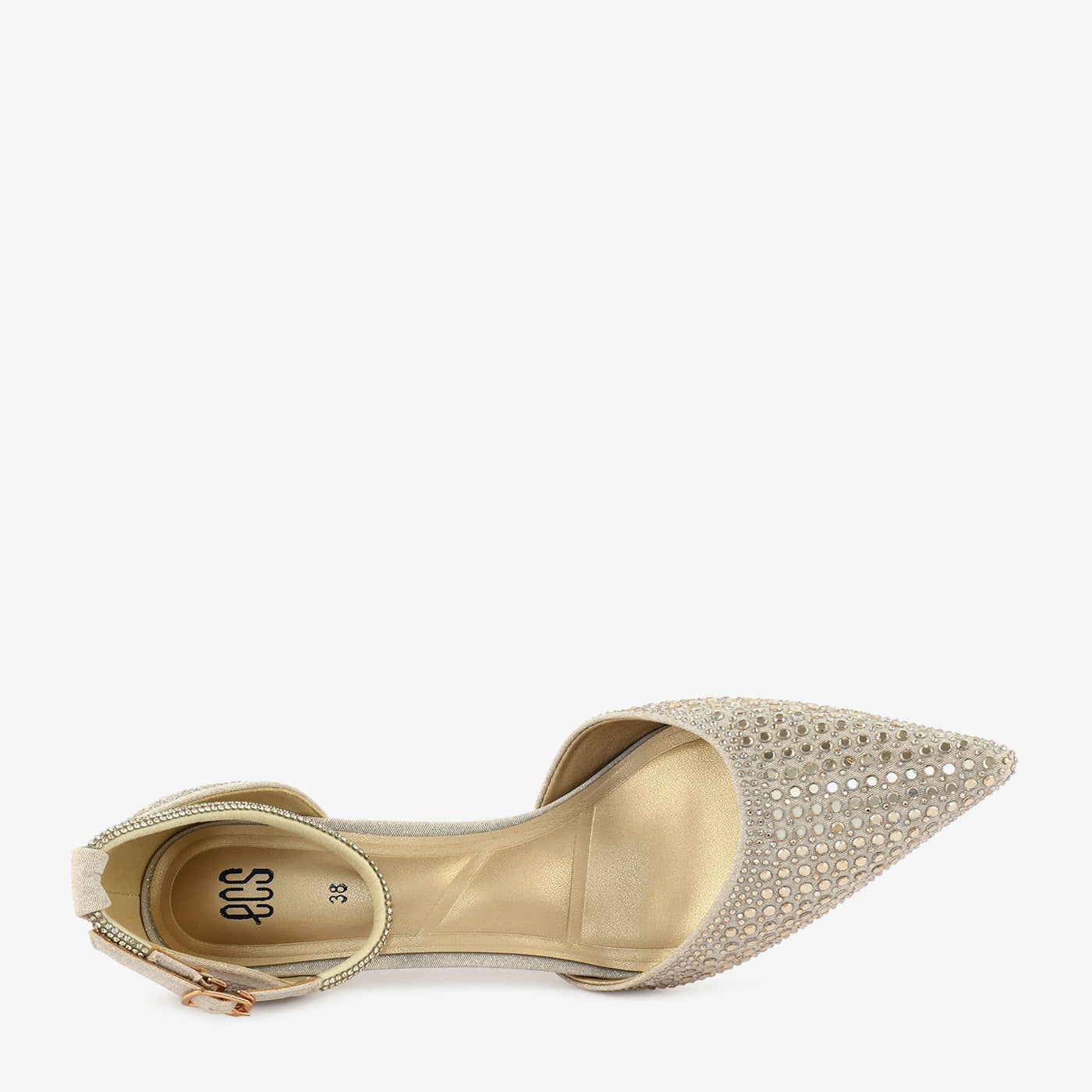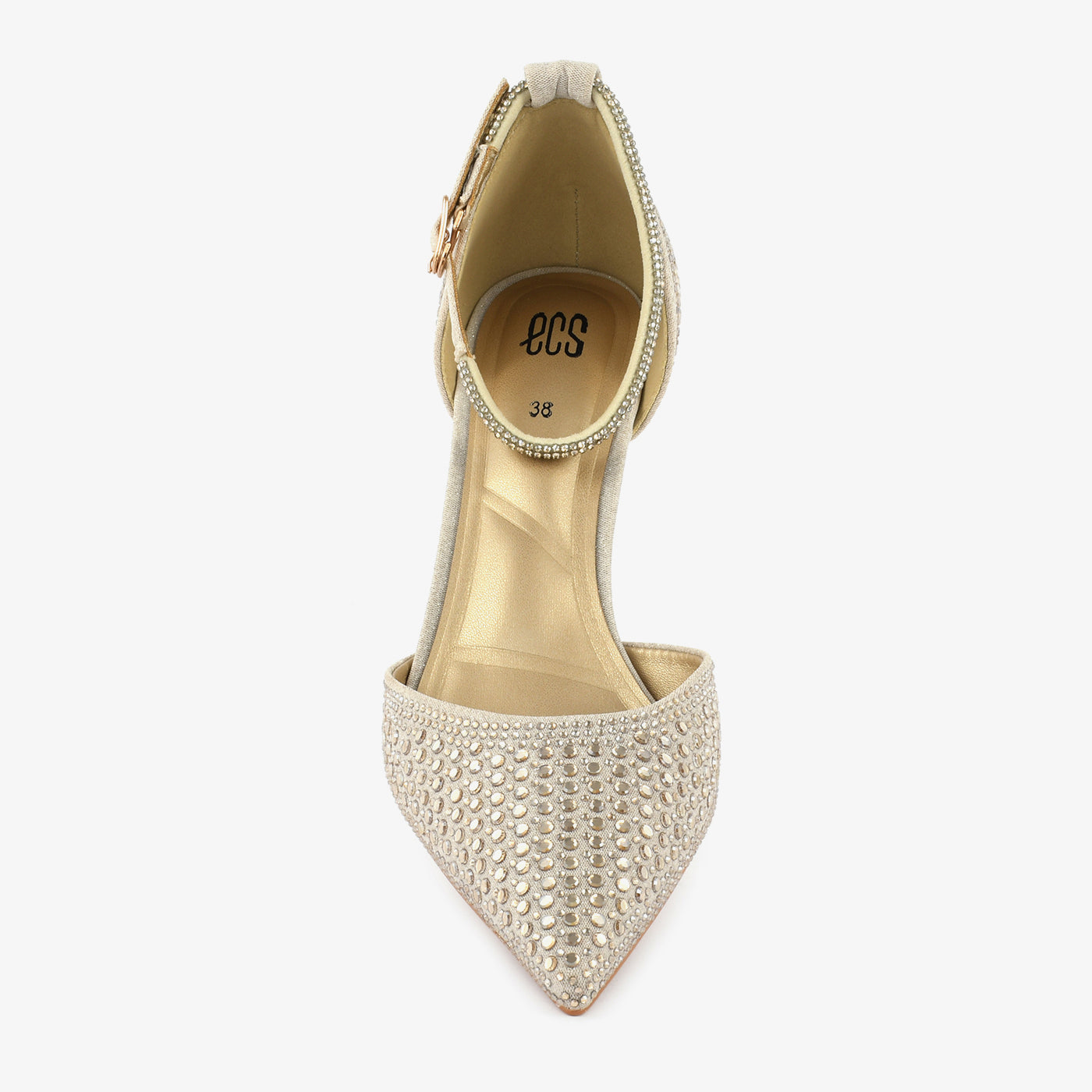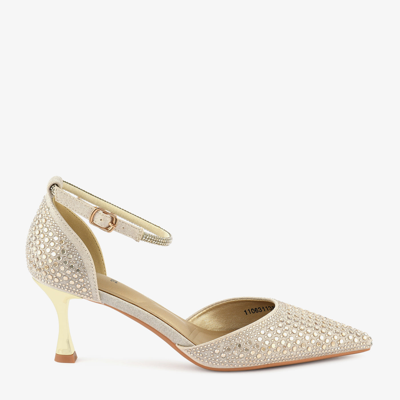 Luminous and poised, this pointed-toe heel brings a refined glow to any look. The crystal-embellished surface and delicate ankle strap add polished elegance. Designed to make evening wear feel effortlessly elevated.