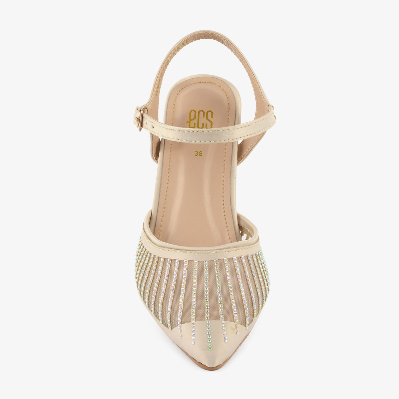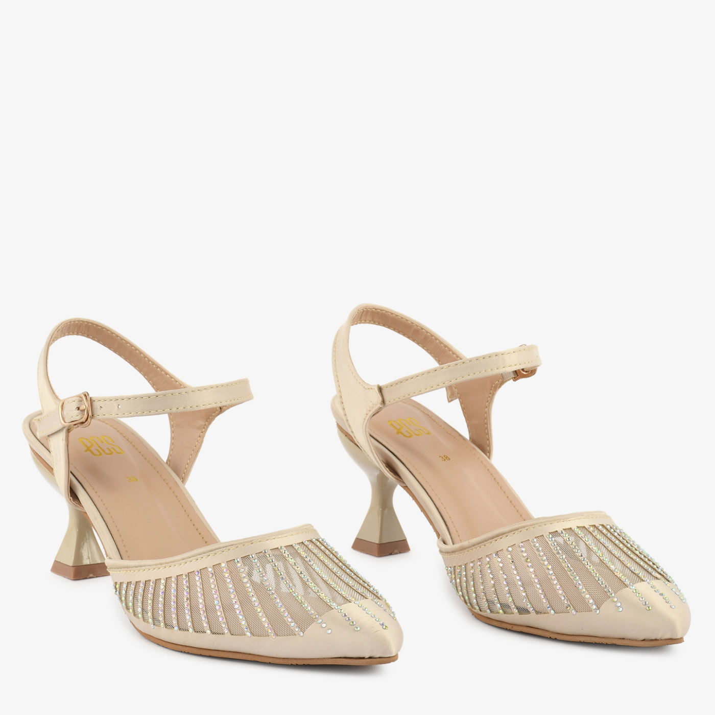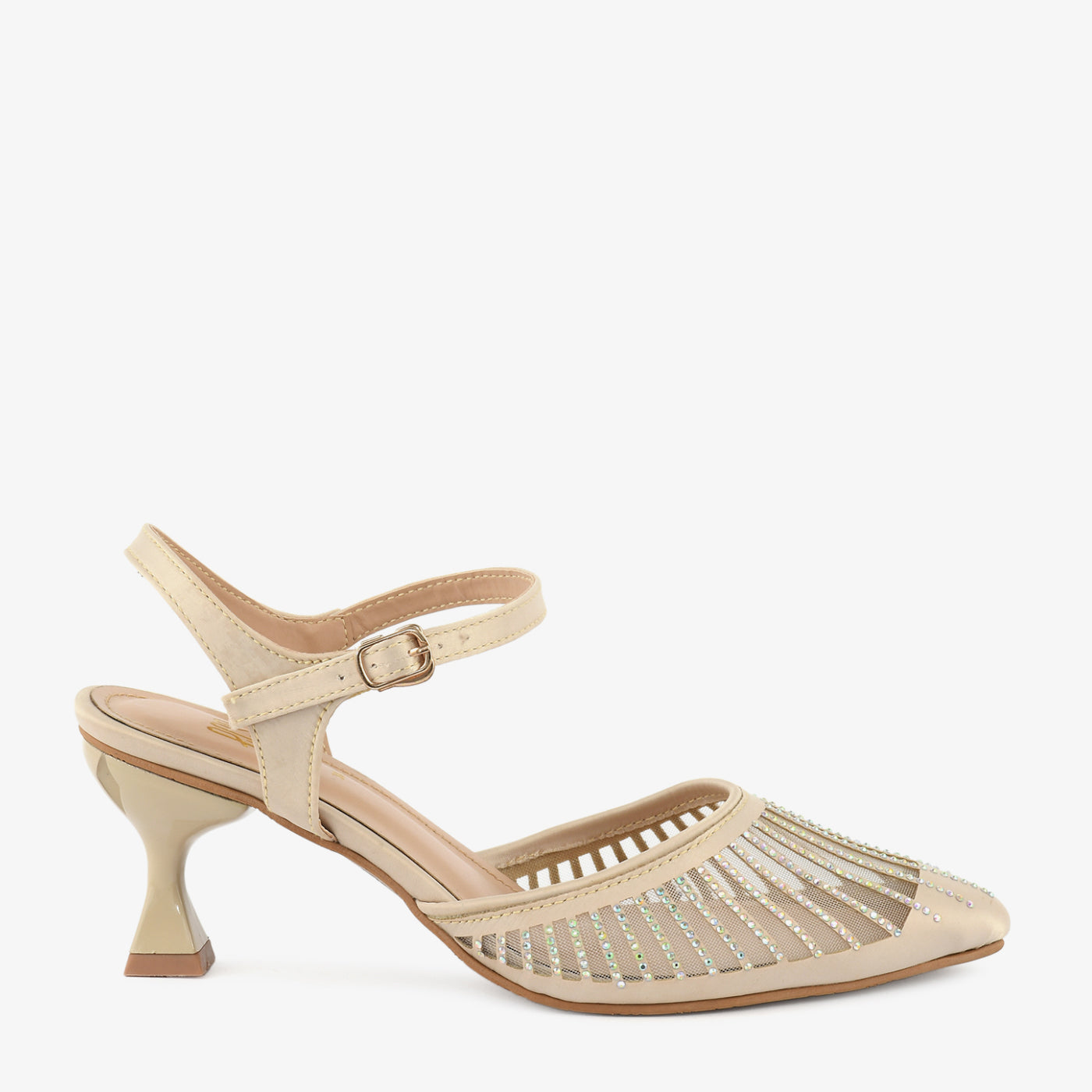 Elegant and refined, this pair features delicate mesh detailing and crystal lines. The ankle strap adds support, while the block heel ensures stability. A beautiful blend of comfort and class for festive occasions and formal wear.
