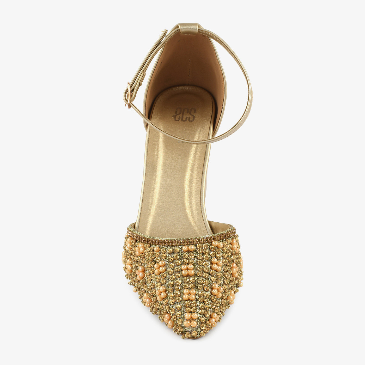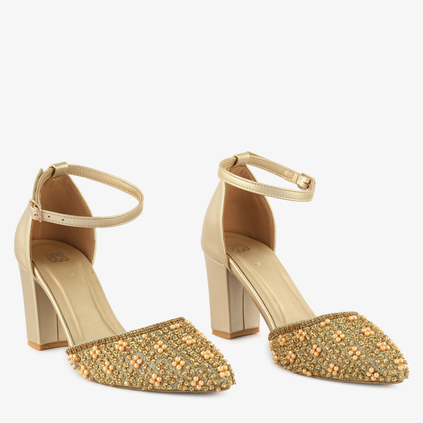 An ornate heel designed for grand occasions, combining pearl-studded embroidery with a sturdy block base. The ankle strap ensures a secure fit, while the intricate embellishments bring a statement glow. Elegant, balanced, and celebration-ready.