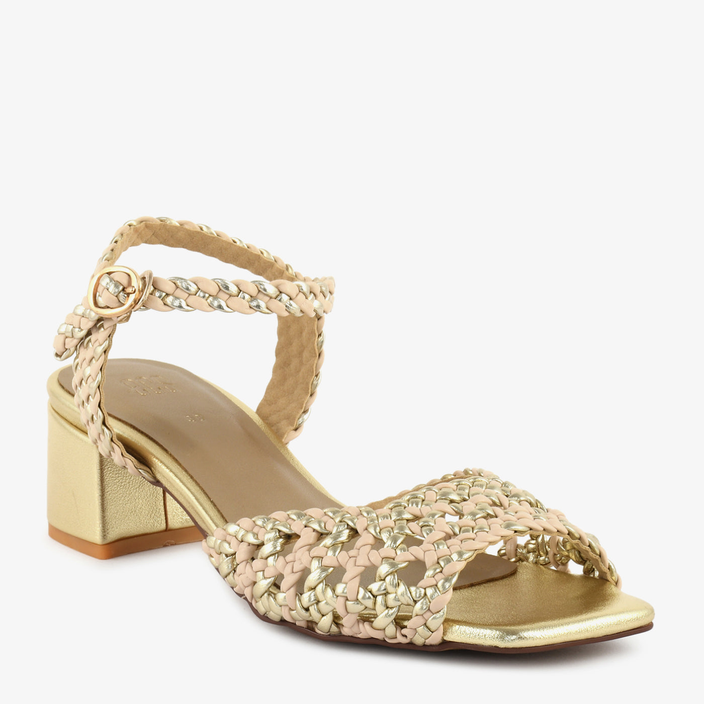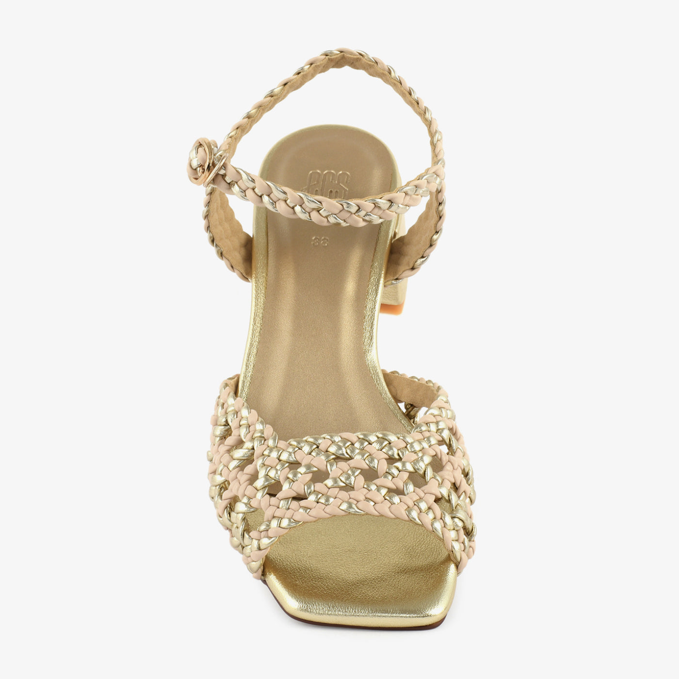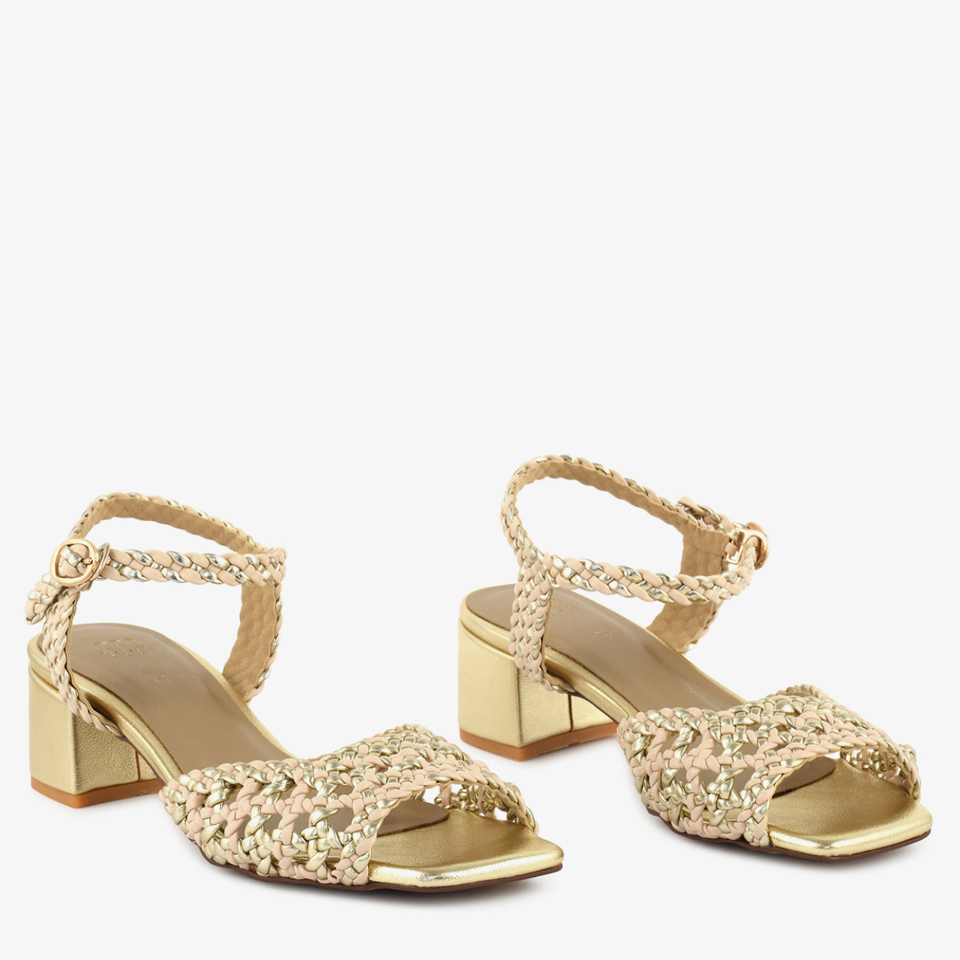 A block heel sandal constructed entirely from intricately woven braided straps, giving the upper a rich textural quality that stands apart from conventional smooth-finish designs. The wide braided vamp strap sits across the forefoot while a slim braided ankle strap with a gold-tone buckle closure secures the fit at the heel. A metallic block heel grounds the design with a polished finish that complements the woven upper. The square open-toe silhouette adds a structured, contemporary feel to the overall look. Lightweight and well-cushioned underfoot, this sandal transitions comfortably from daytime events to festive evening occasions.