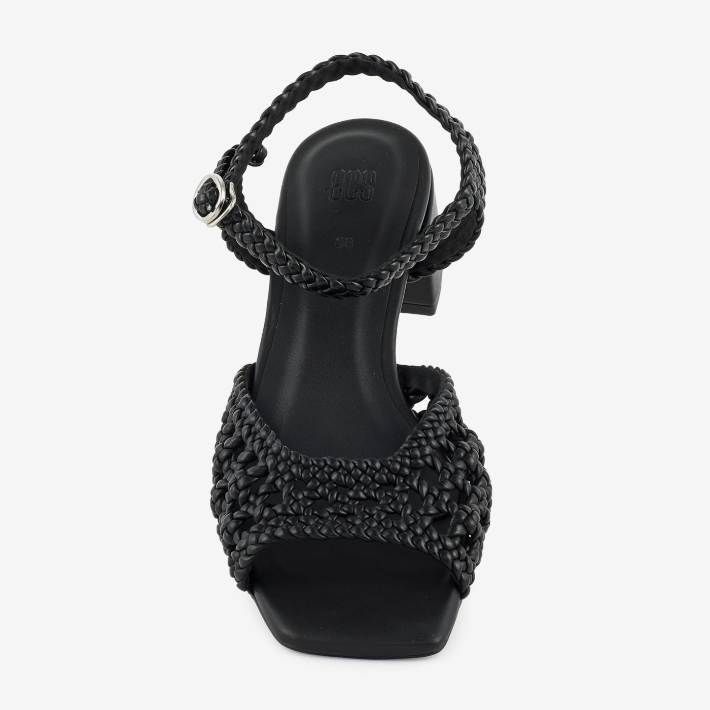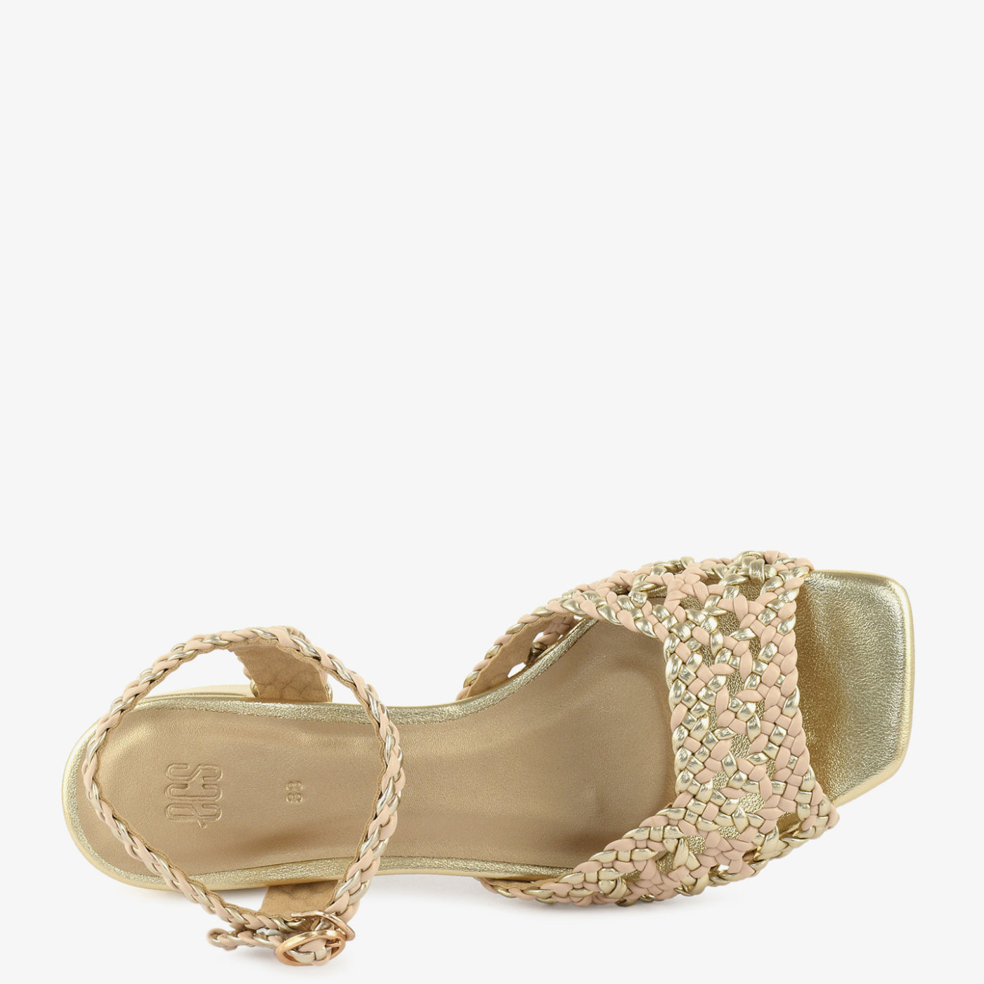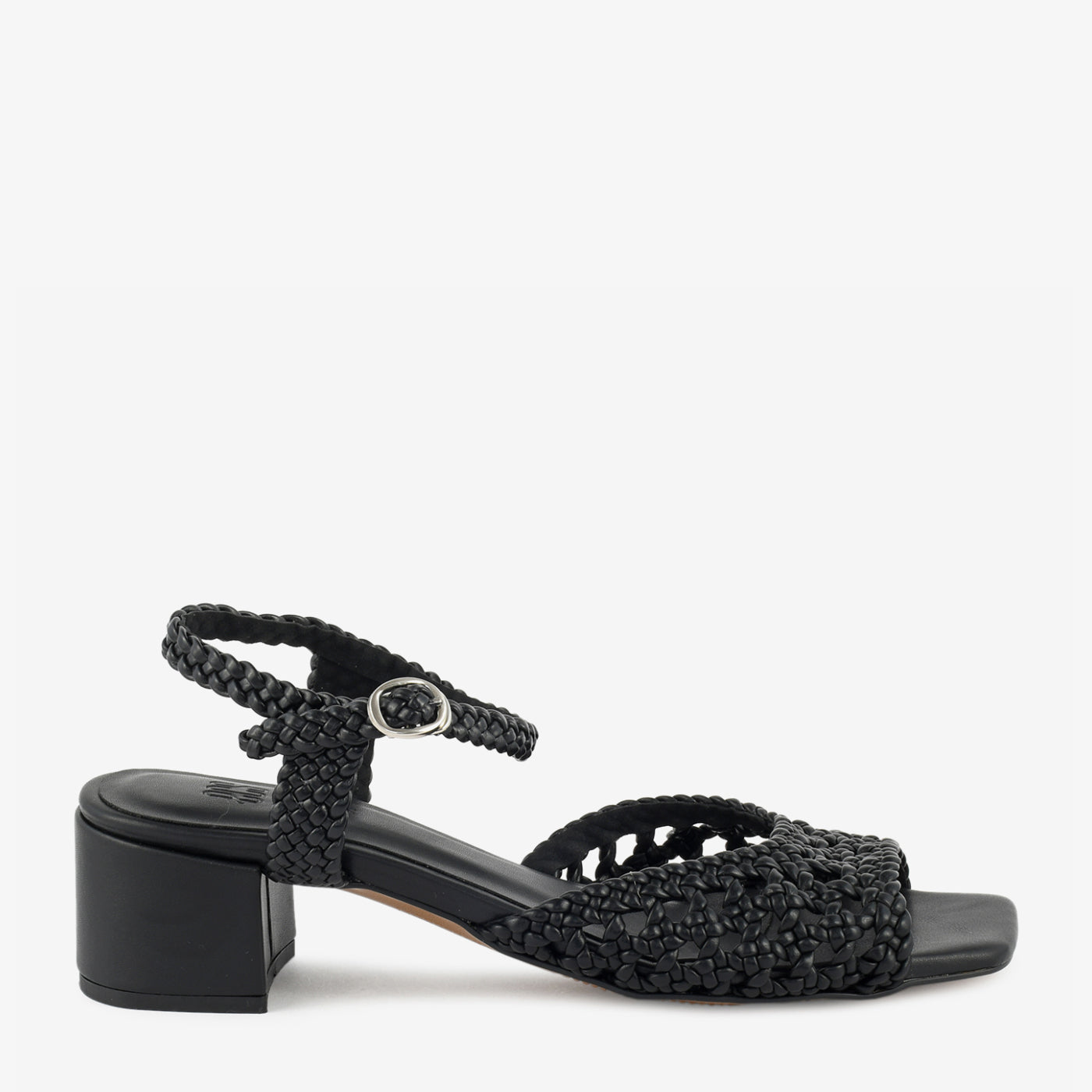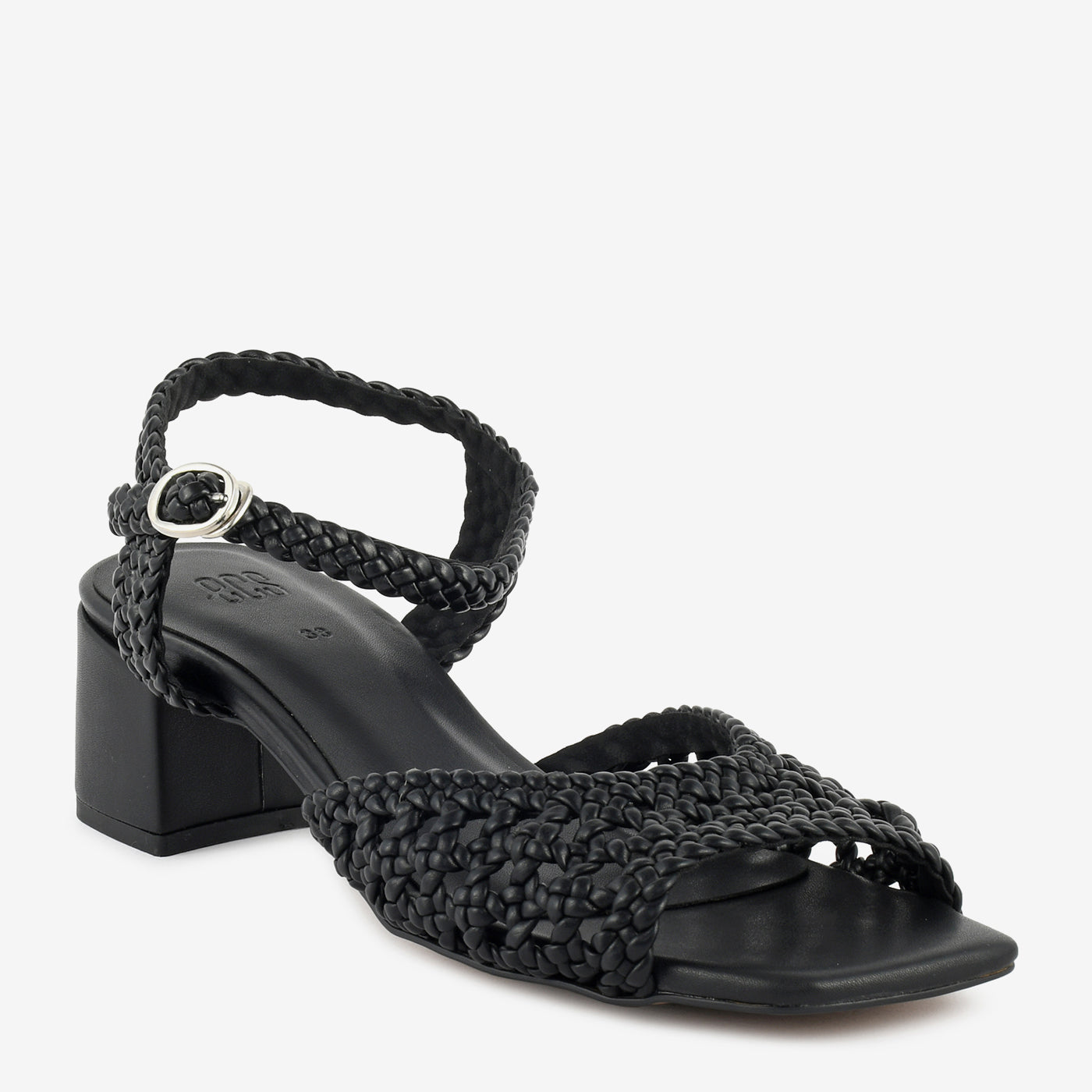 A block heel sandal constructed entirely from intricately woven braided straps, giving the upper a rich textural quality that stands apart from conventional smooth-finish designs. The wide braided vamp strap sits across the forefoot while a slim braided ankle strap with a gold-tone buckle closure secures the fit at the heel. A metallic block heel grounds the design with a polished finish that complements the woven upper. The square open-toe silhouette adds a structured, contemporary feel to the overall look. Lightweight and well-cushioned underfoot, this sandal transitions comfortably from daytime events to festive evening occasions.