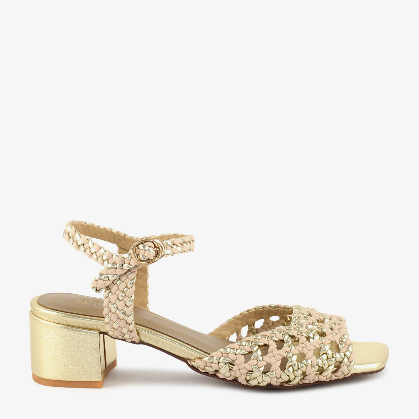 - Design: Wide woven vamp strap sandal with slim braided ankle strap, gold-tone buckle, and metallic block heel