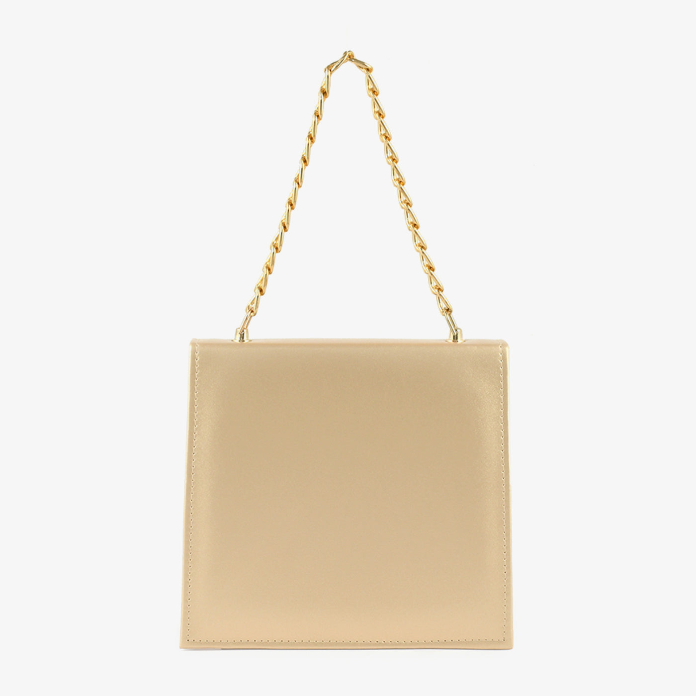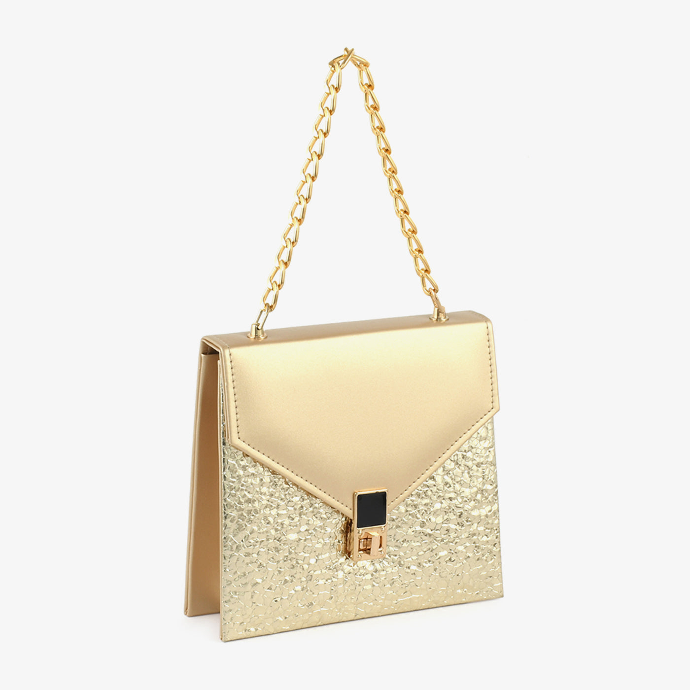 Elevate your evening ensemble with this elegant women's bag. It features a sleek, square silhouette with a smooth, black texture. A gold-toned chain strap and a matching clasp add a touch of sophistication.