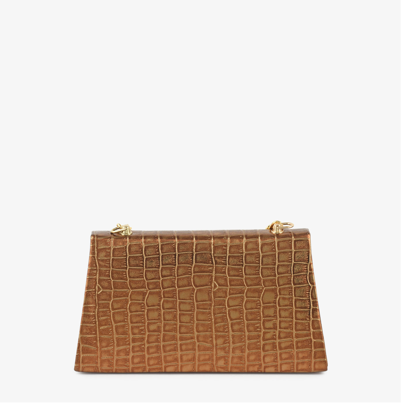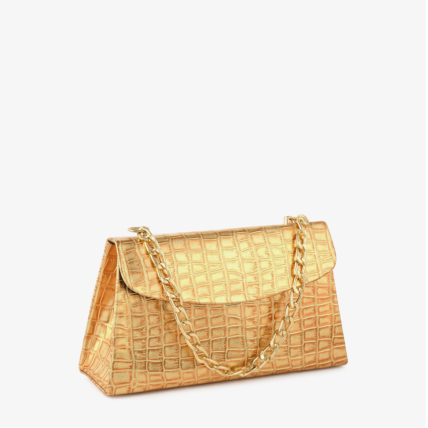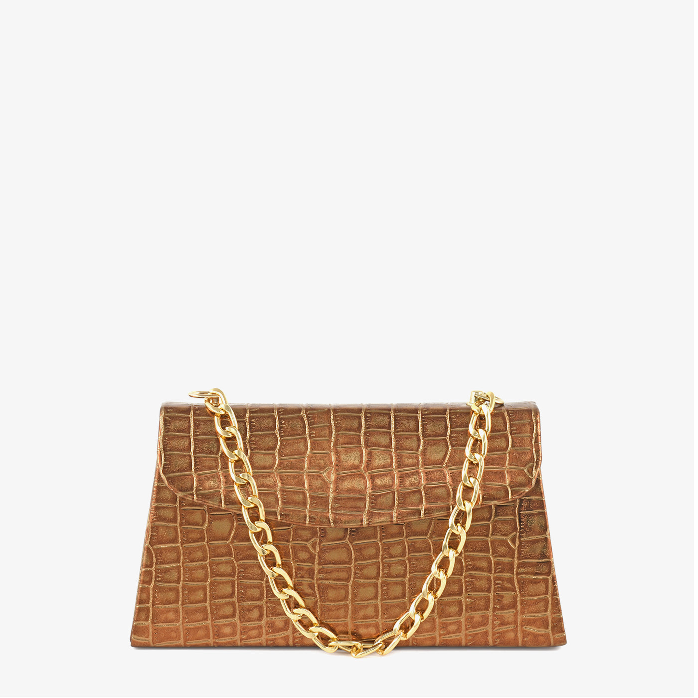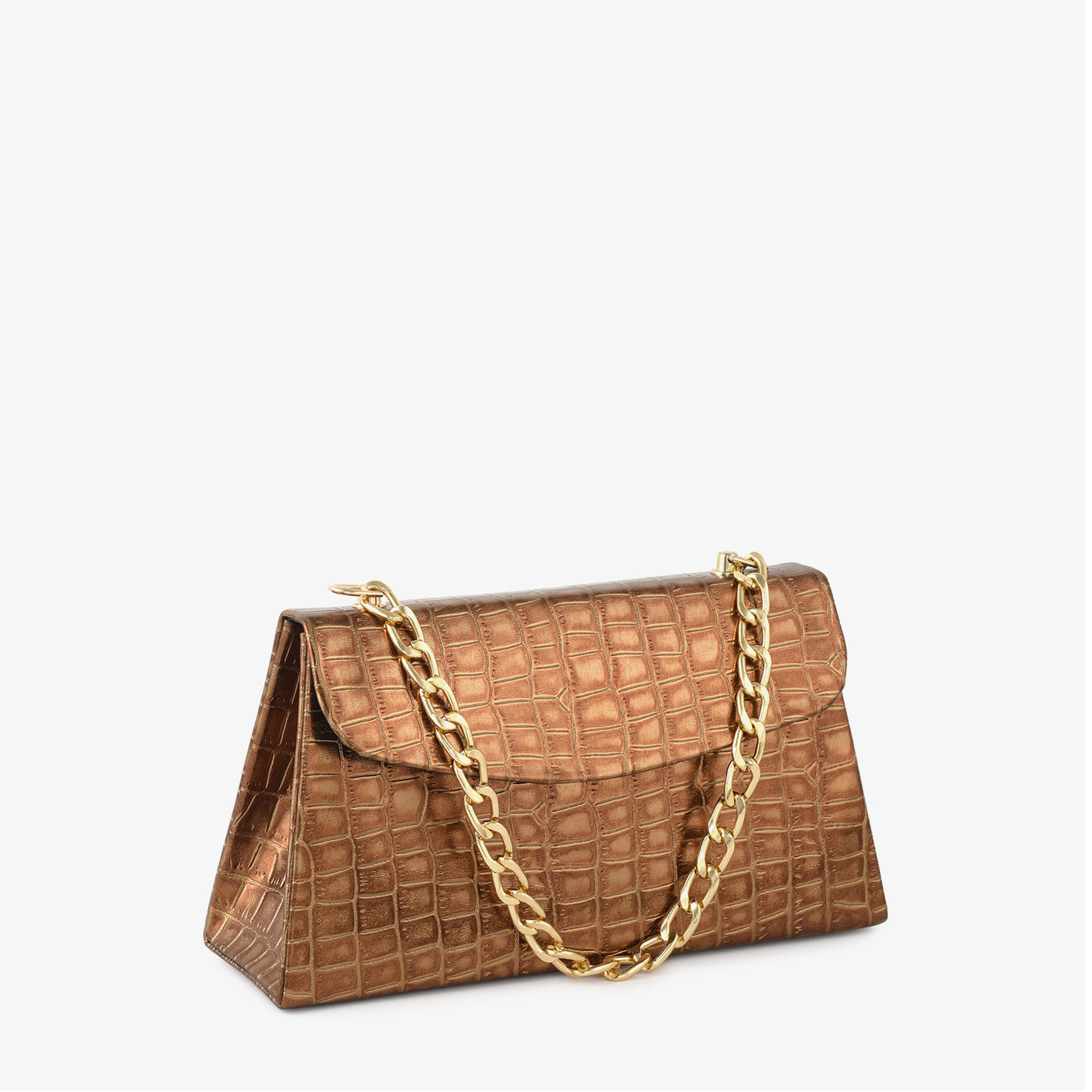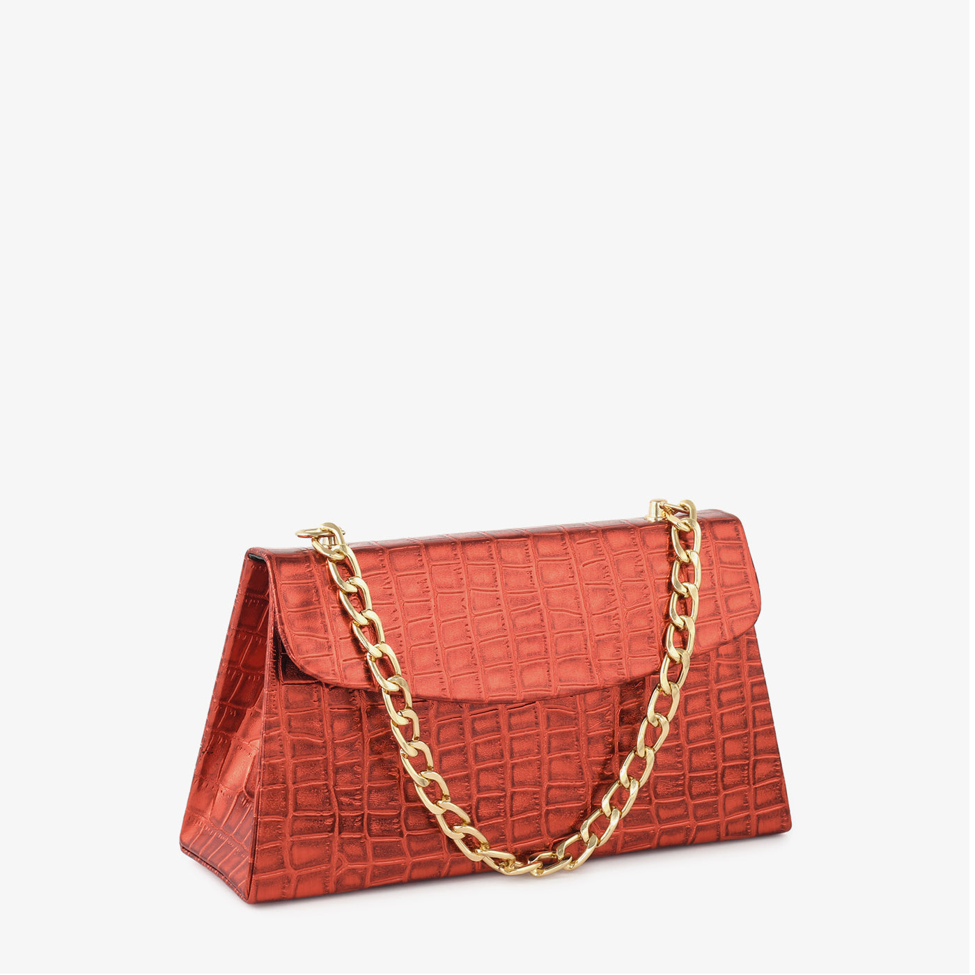 A sleek and structured handbag crafted with a crocodile-patterned finish for a polished statement look. Its firm shape ensures your essentials stay organized while maintaining a sophisticated aesthetic. The bold chain strap enhances its modern appeal, making it an excellent choice for both day and evening routines. Compact yet impactful, it delivers style with confidence.
