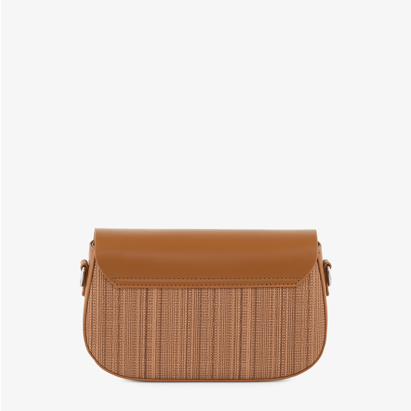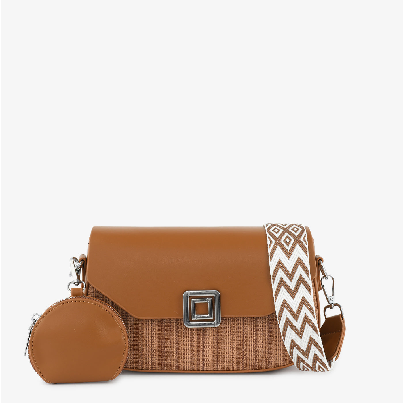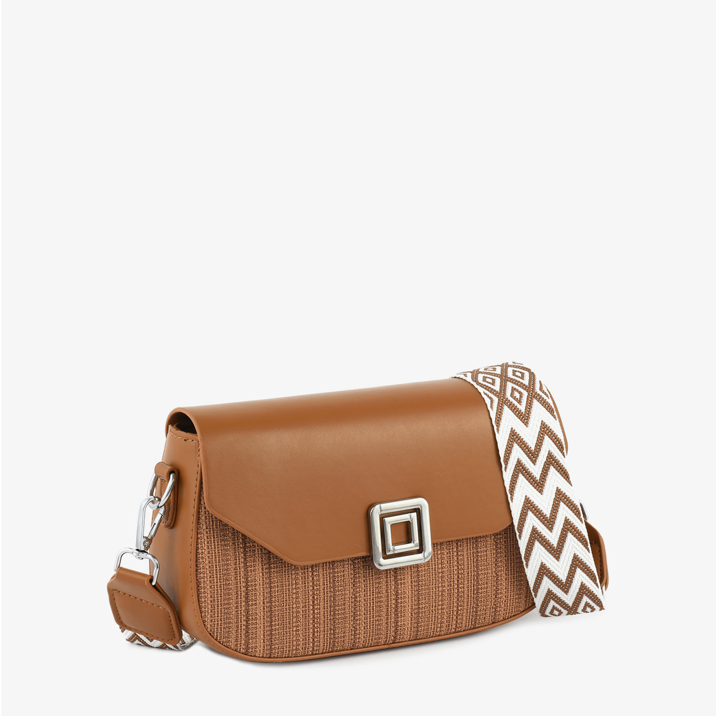 A chic crossbody handbag blending a woven texture with a smooth flap and an artistic patterned strap. Compact yet stylish, it’s ideal for day-to-night wear.