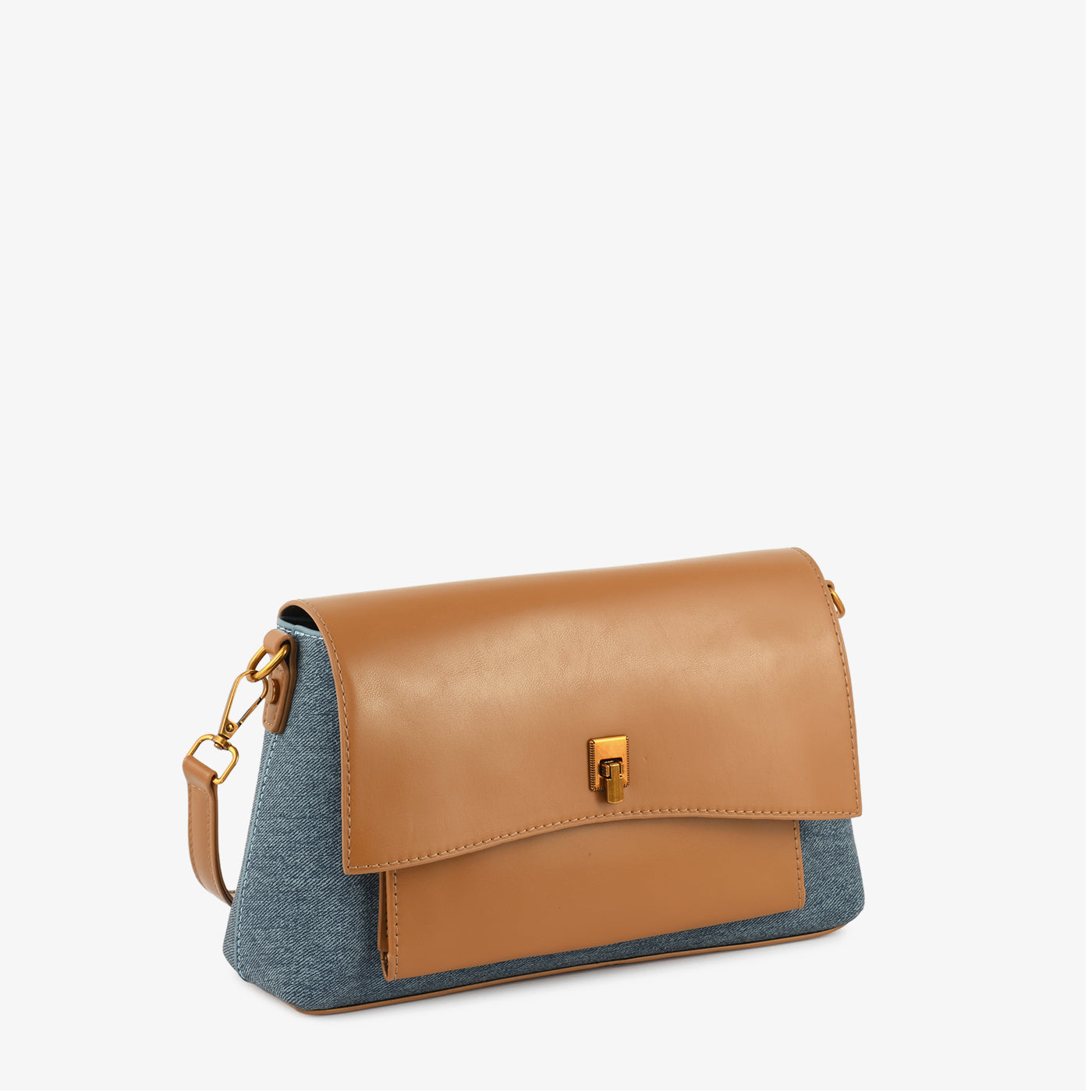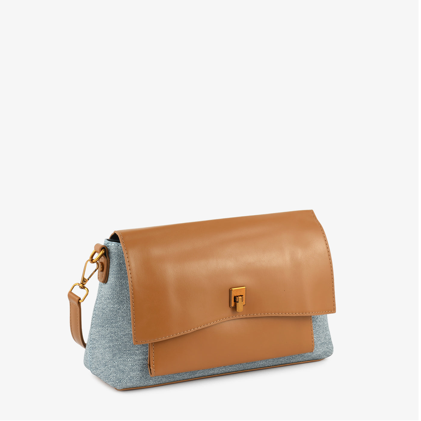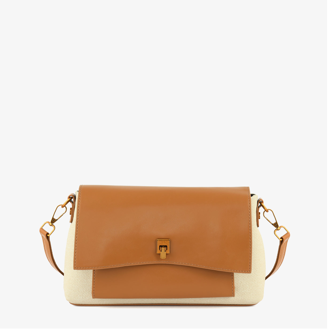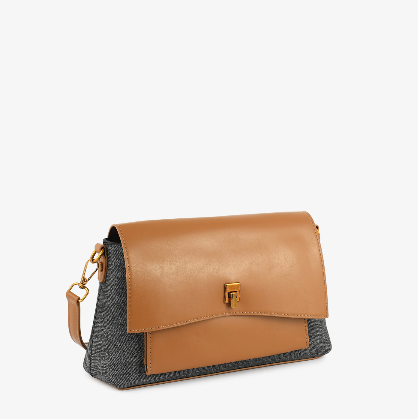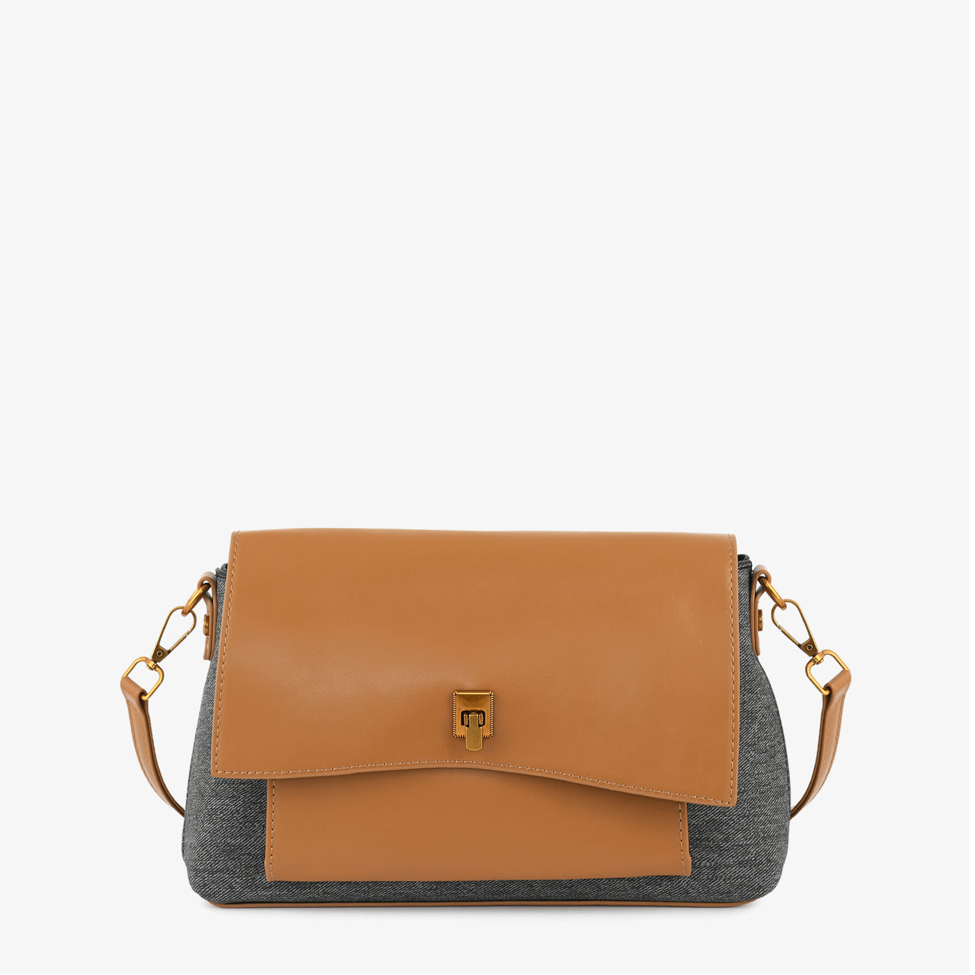 A modern handbag combining sleek faux leather with a soft fabric base for a contemporary look. Its flap-over design and spacious interior make it perfect for both daily use and light travel. Lightweight yet refined, it blends practicality with minimalistic charm.