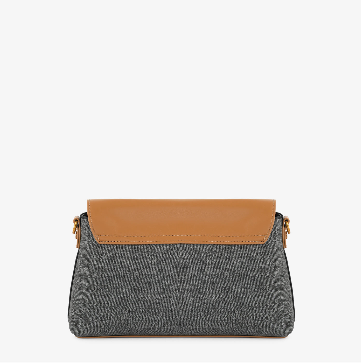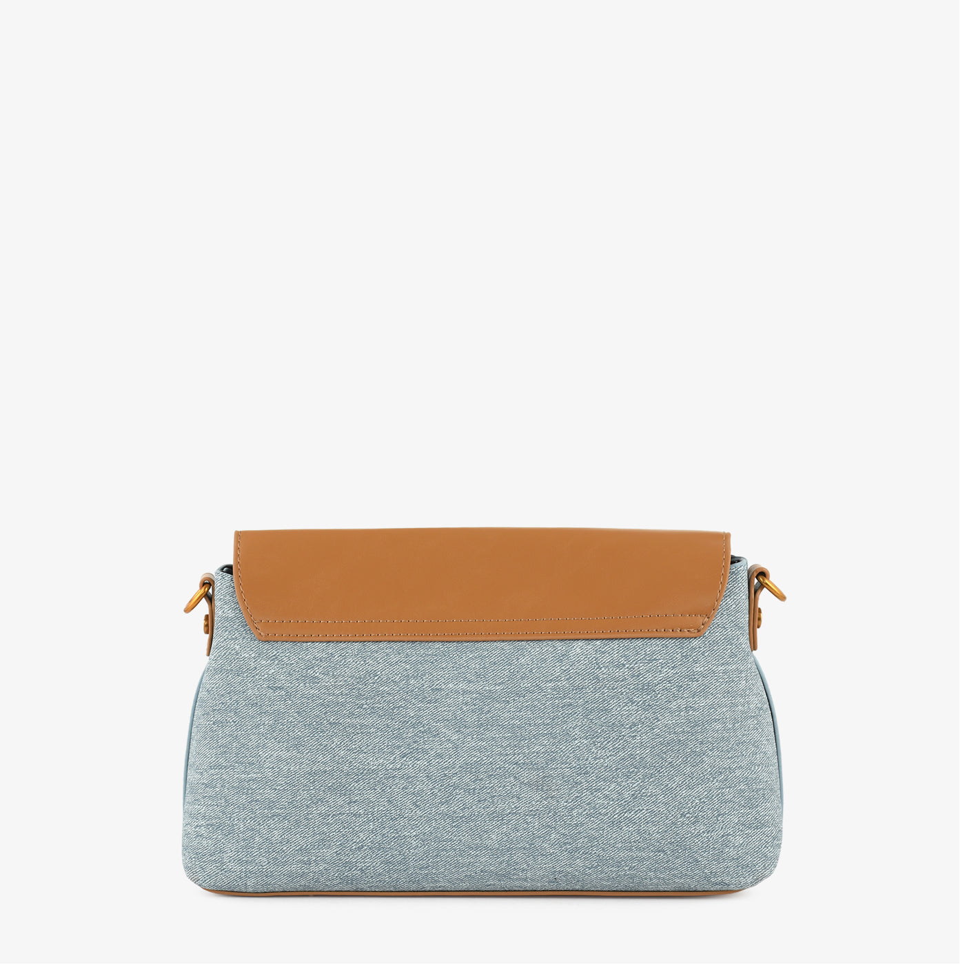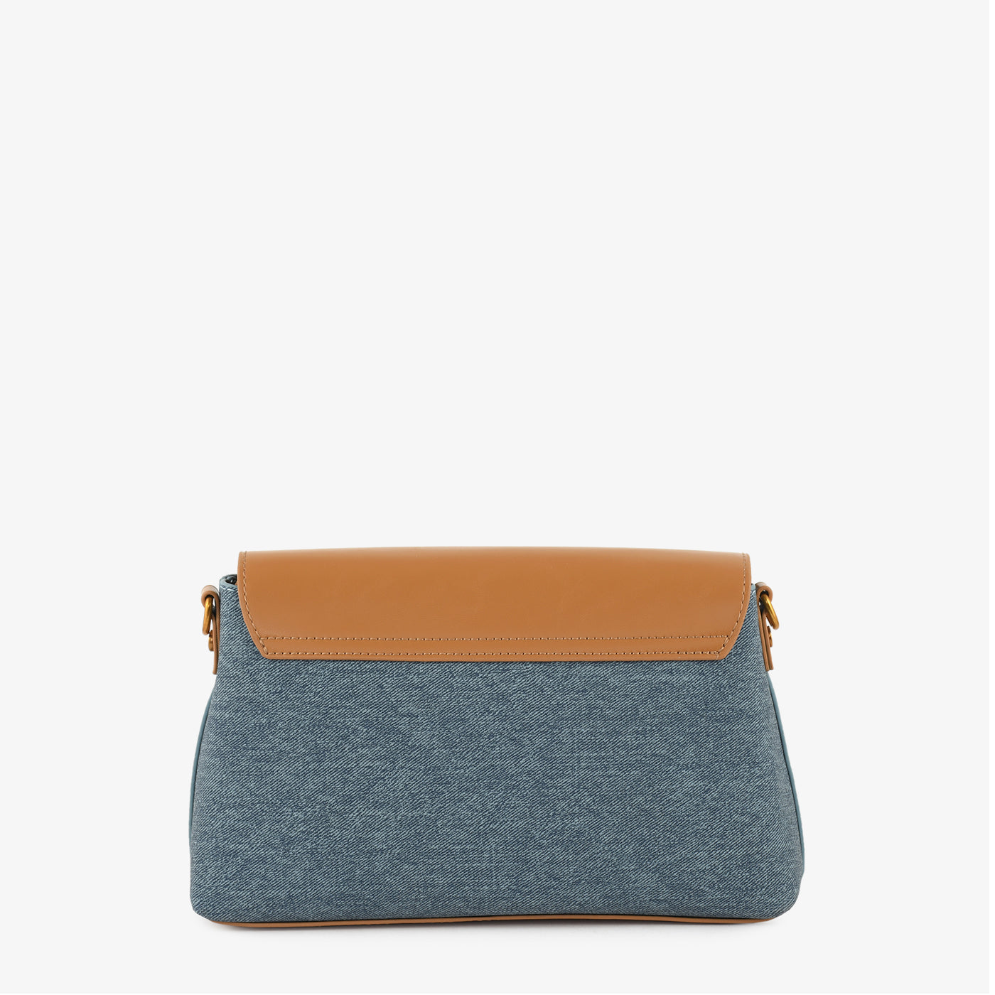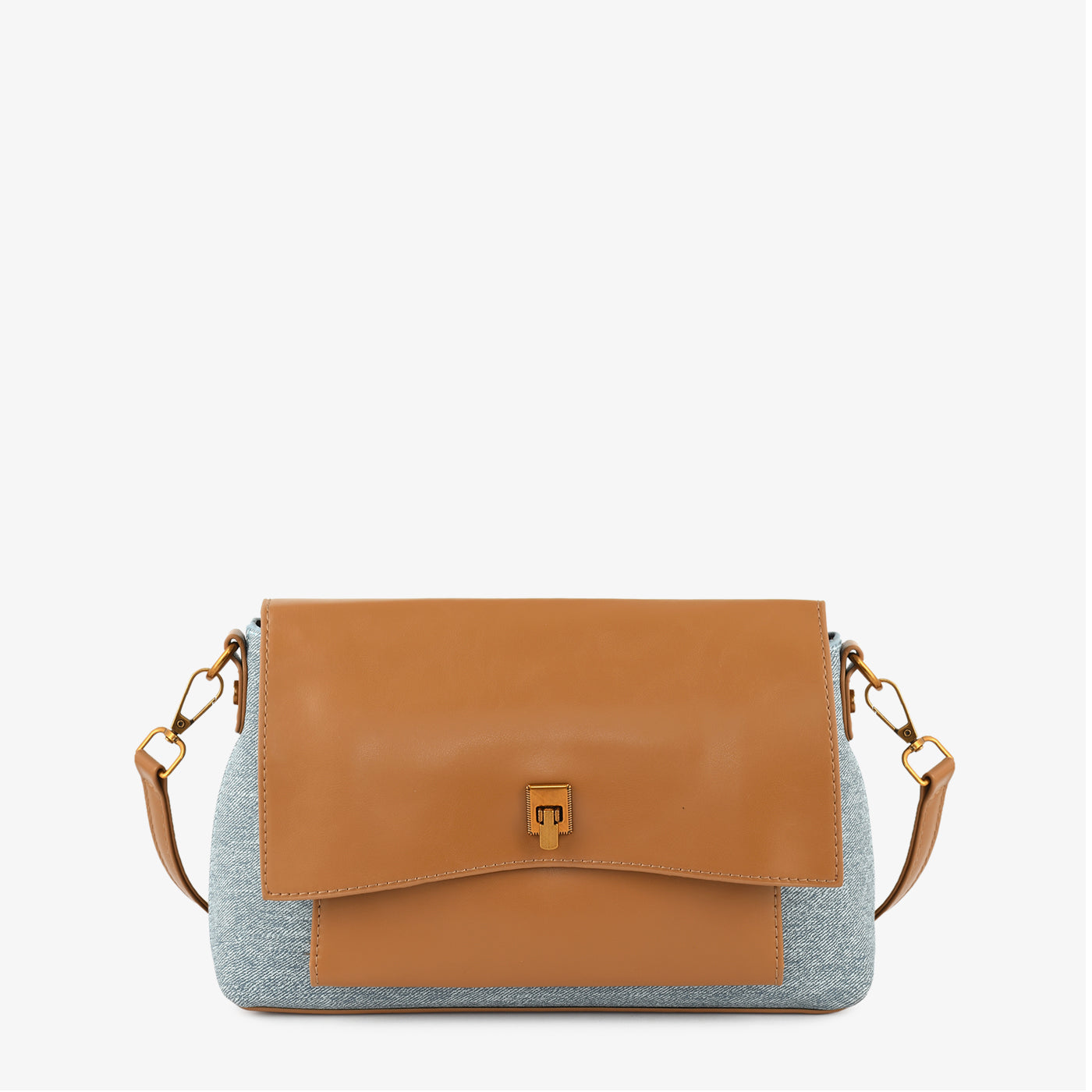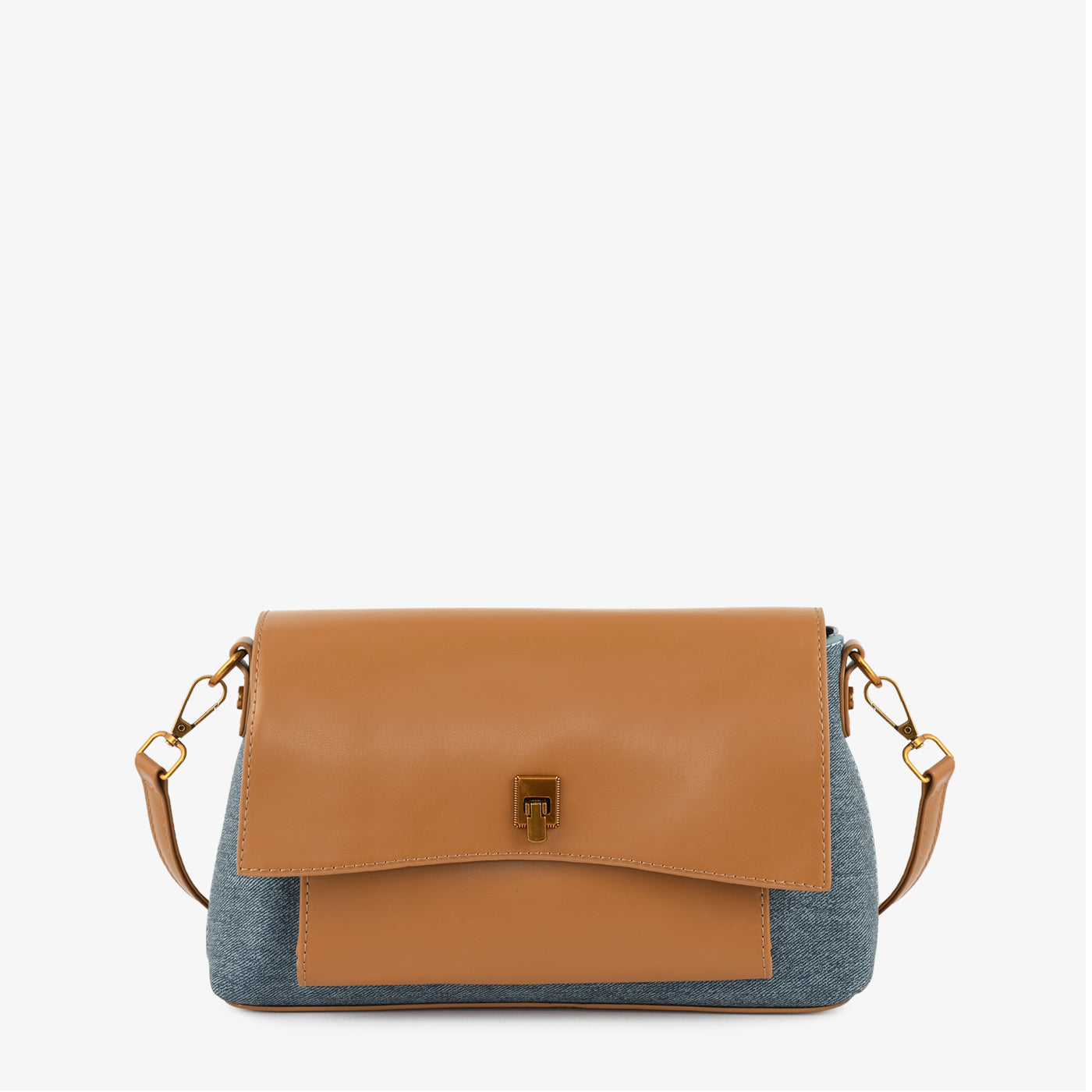 A modern handbag combining sleek faux leather with a soft fabric base for a contemporary look. Its flap-over design and spacious interior make it perfect for both daily use and light travel. Lightweight yet refined, it blends practicality with minimalistic charm.