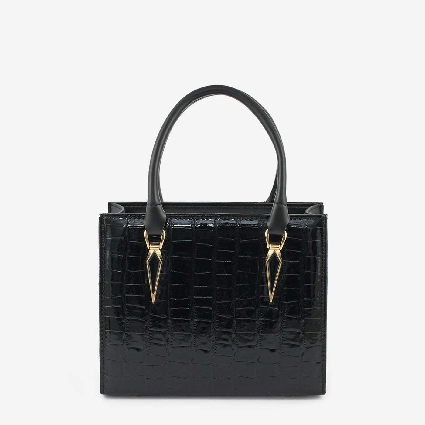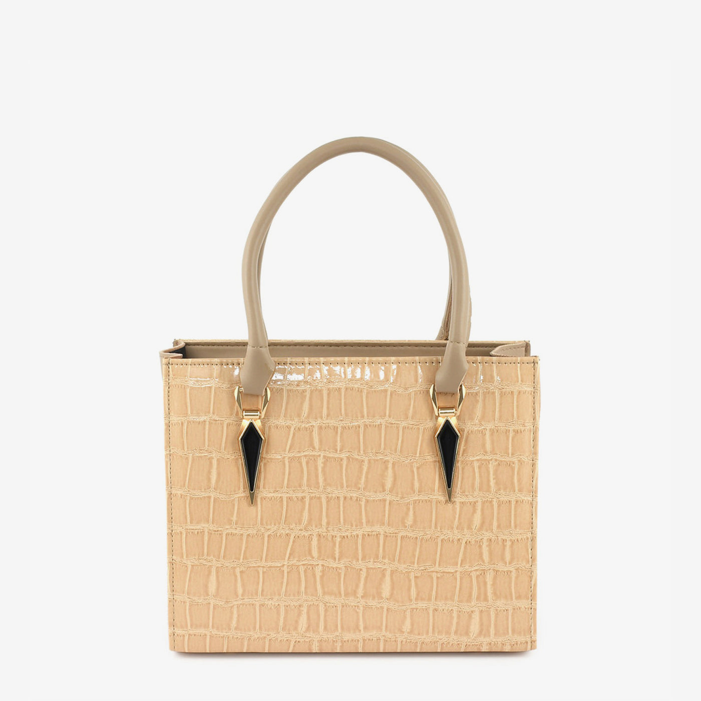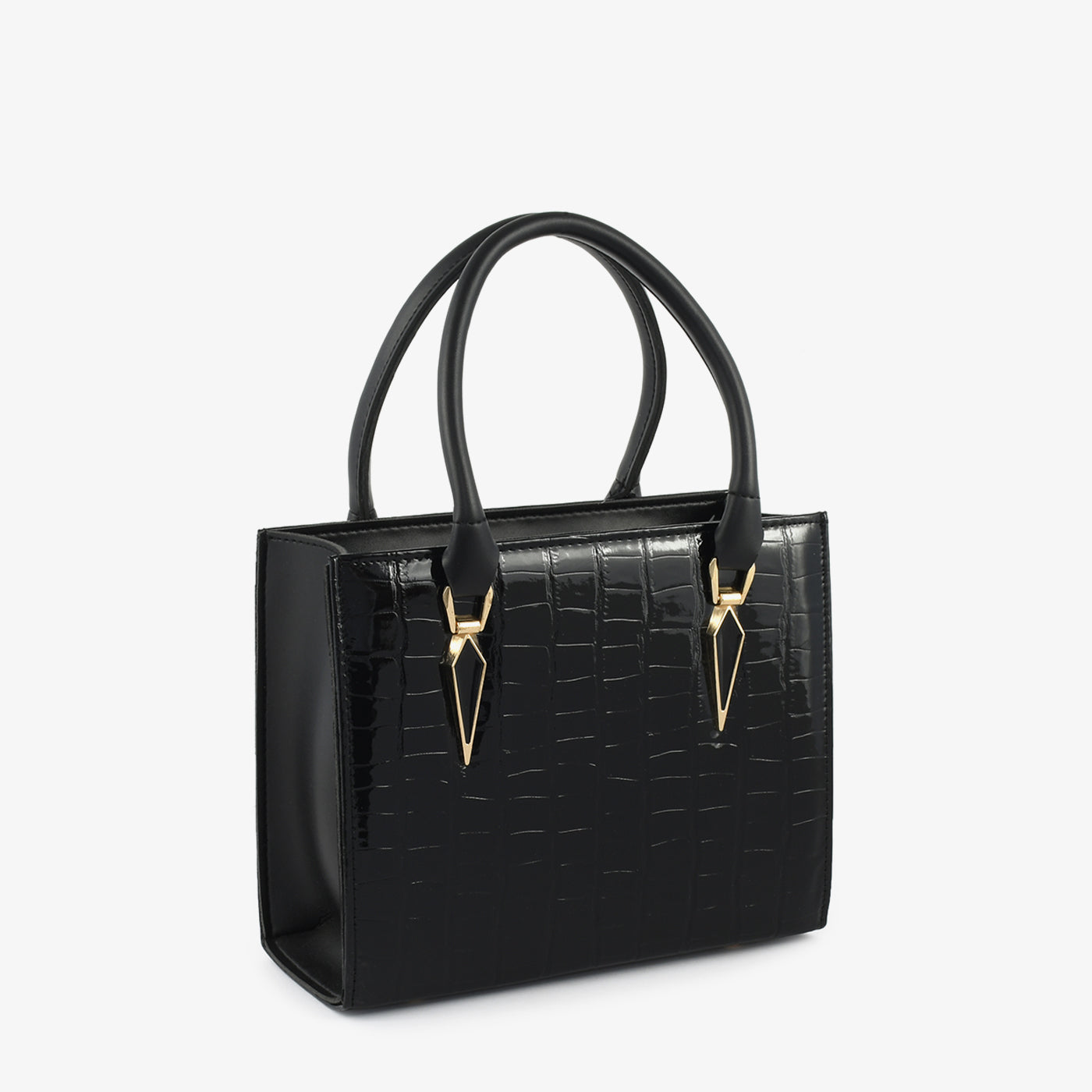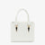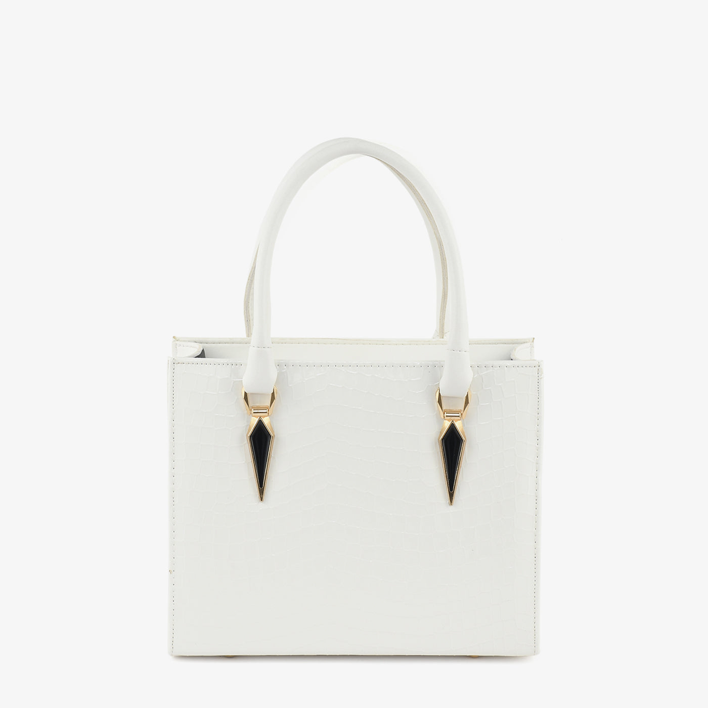 Sophisticated and sleek, the "Arctic Luxe" handbag features a white textured finish with elegant black-and-gold hardware details. A modern staple for work meetings or evening events.