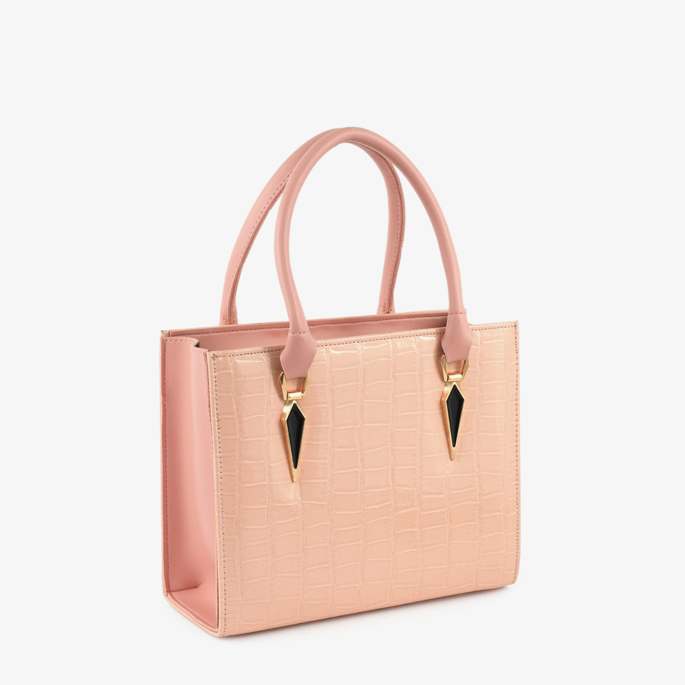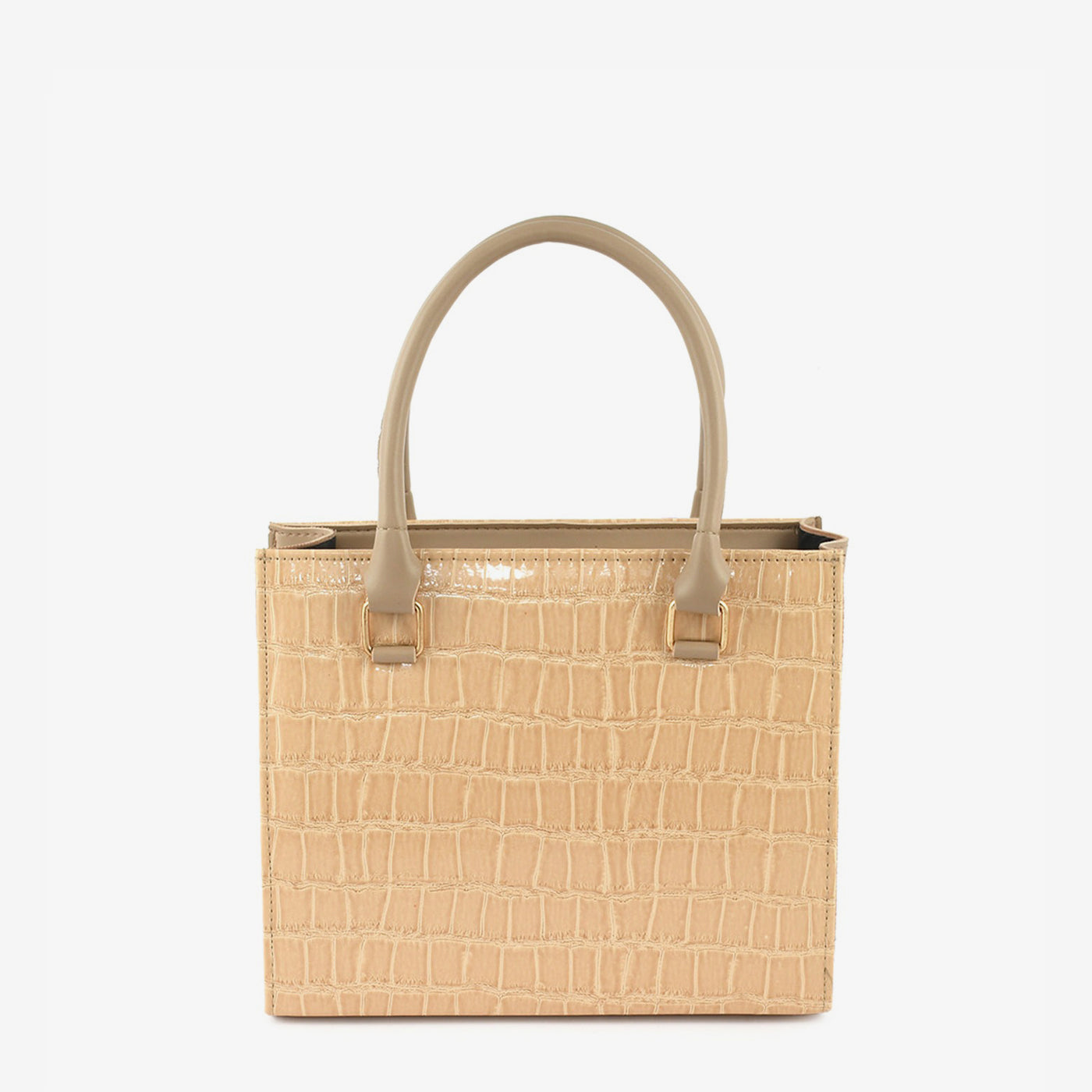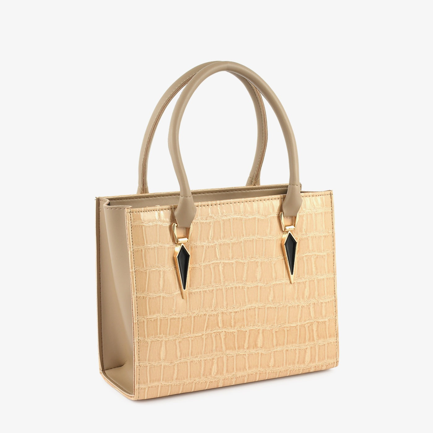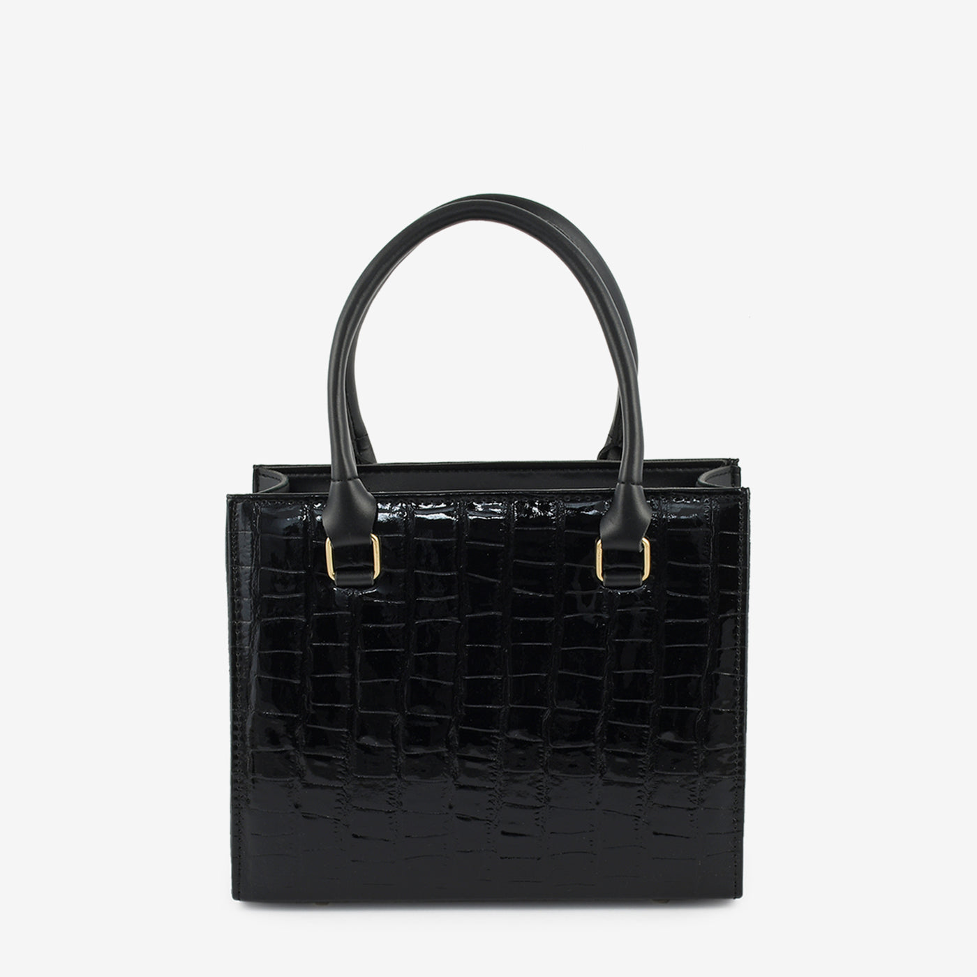 Sophisticated and sleek, the "Arctic Luxe" handbag features a white textured finish with elegant black-and-gold hardware details. A modern staple for work meetings or evening events.
