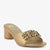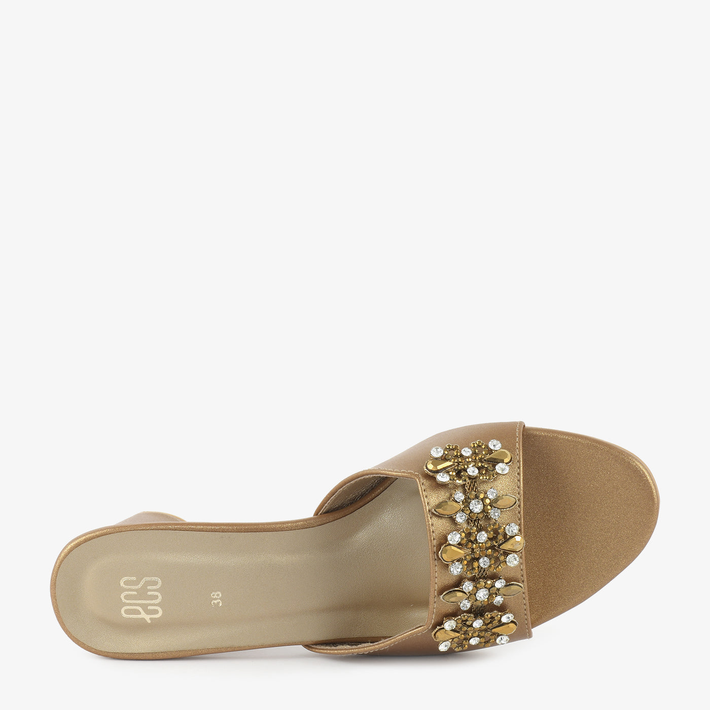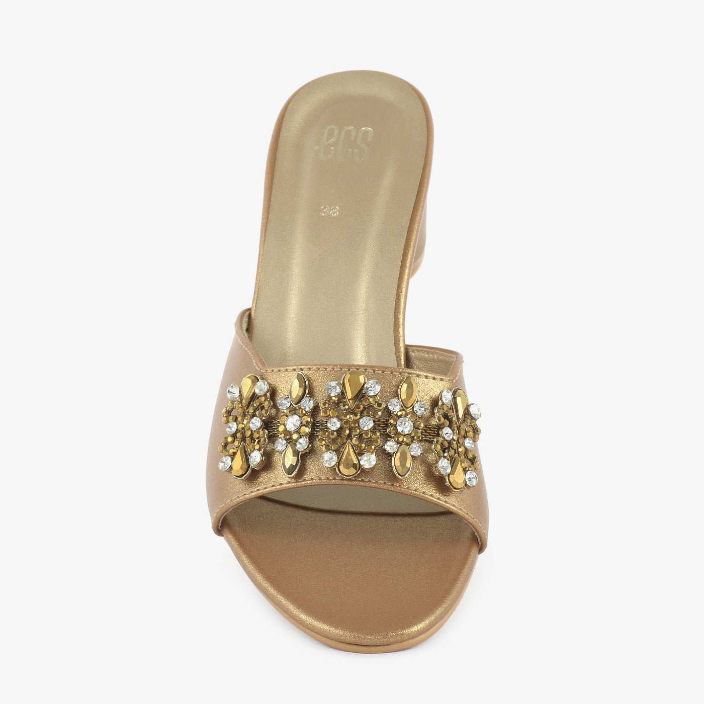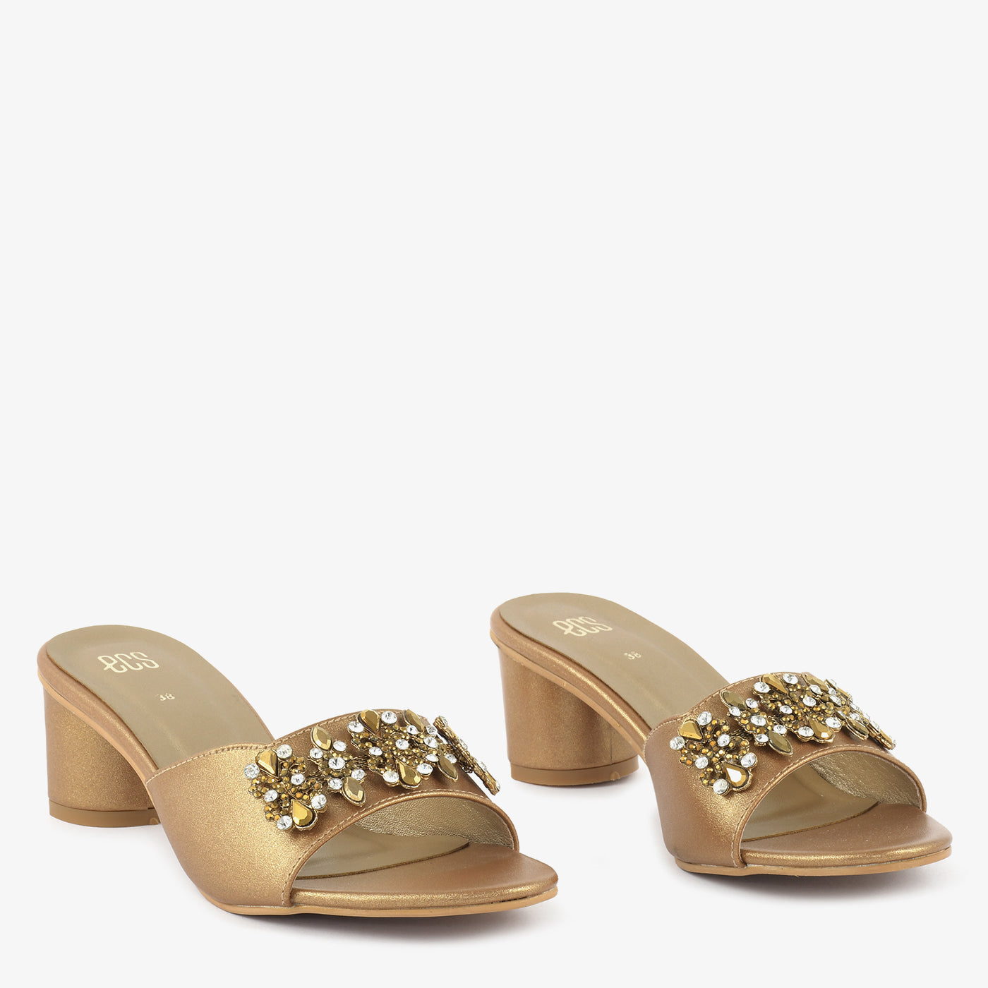 Step into radiant elegance with the Golden Bloom. These gold heeled slipper feature a wide strap adorned with a floral embellishment of gold and crystal details. The block heel offers a touch of elevation while ensuring comfort for various occasions.