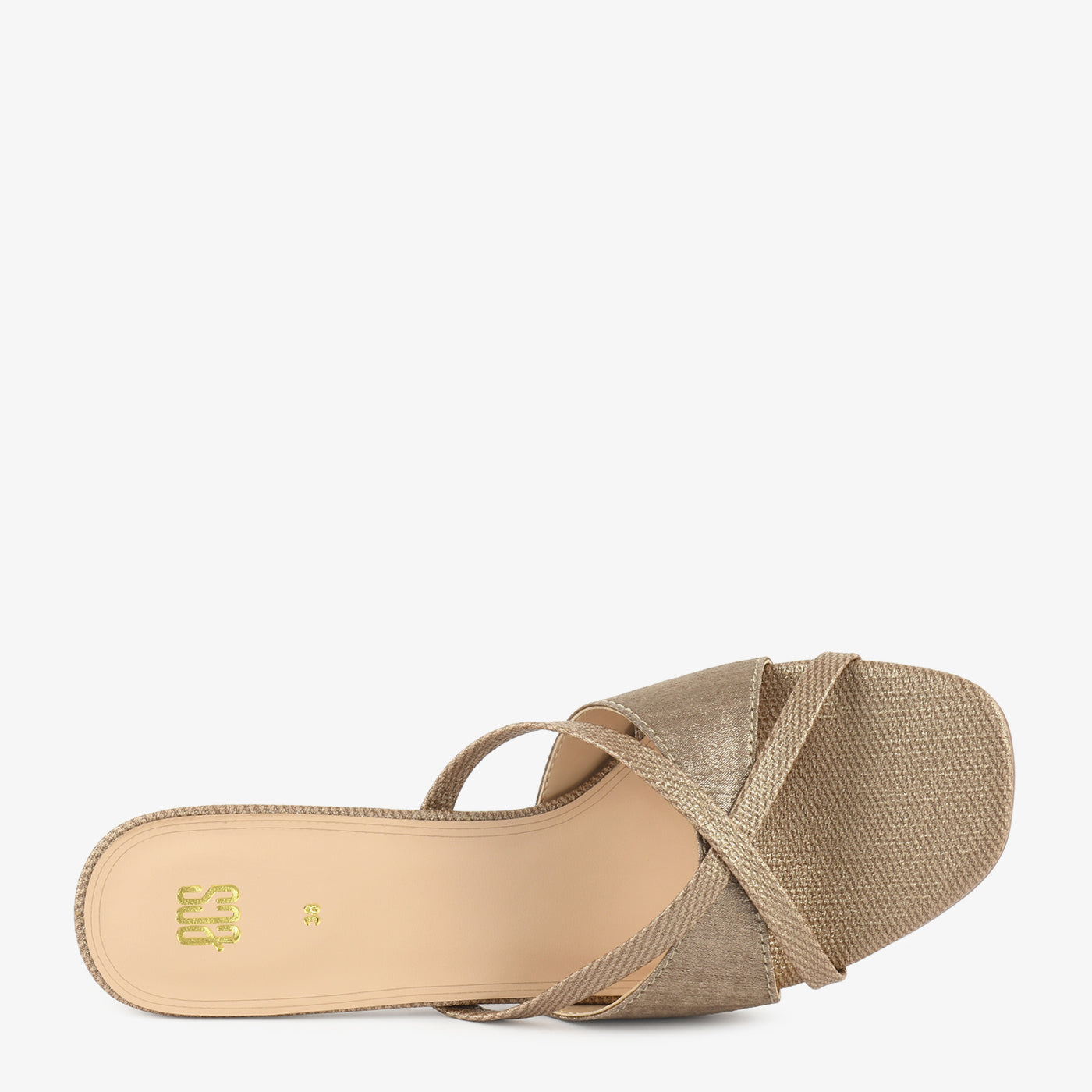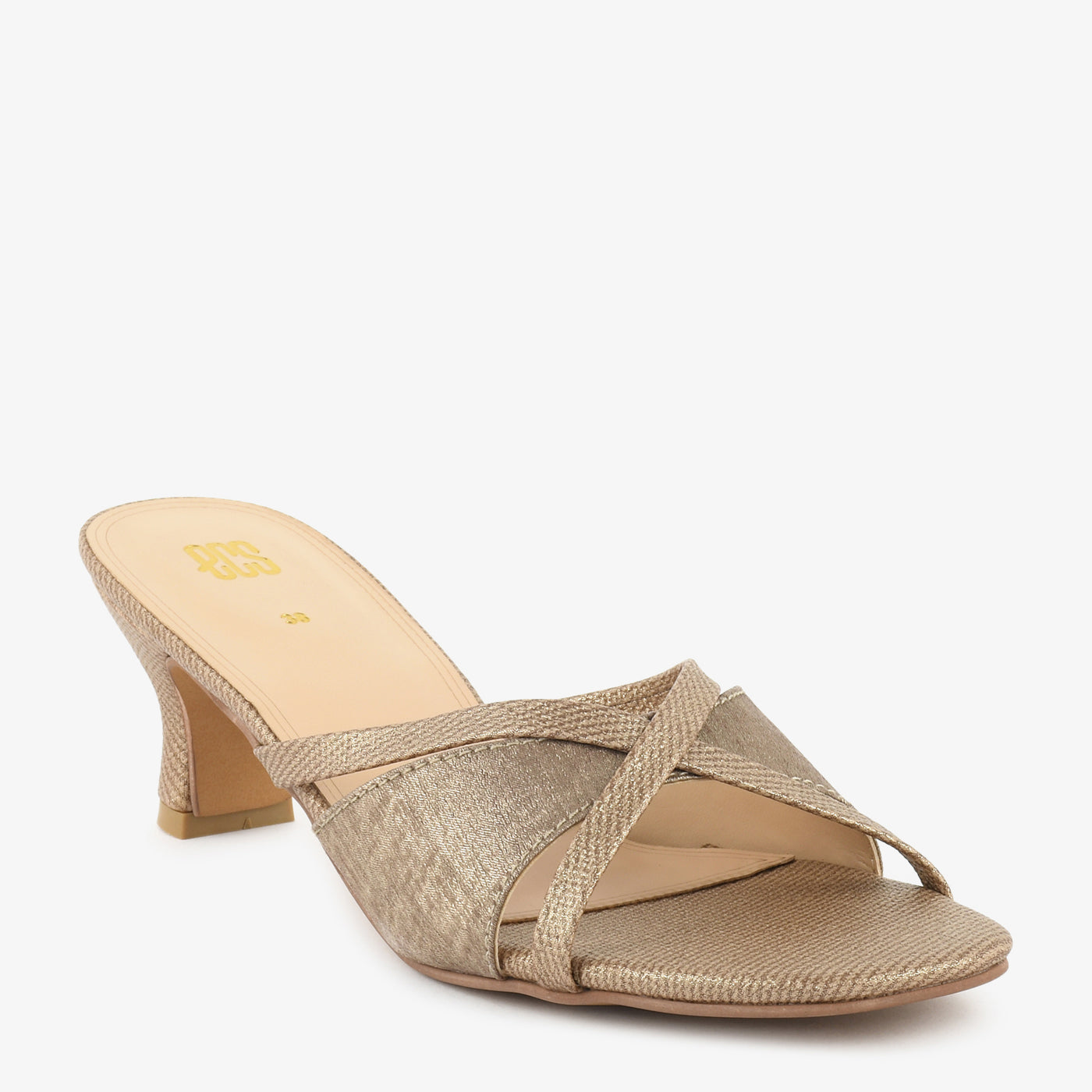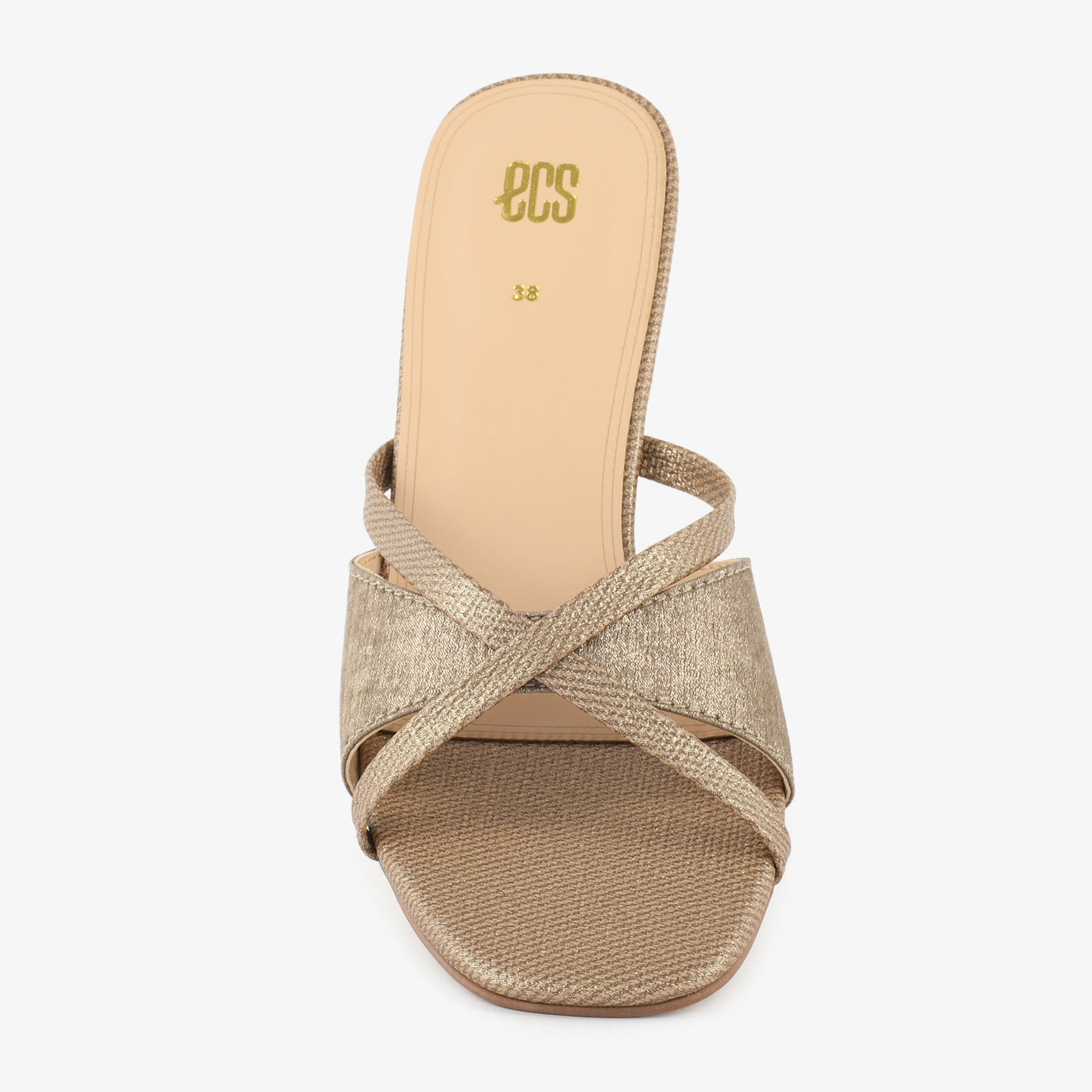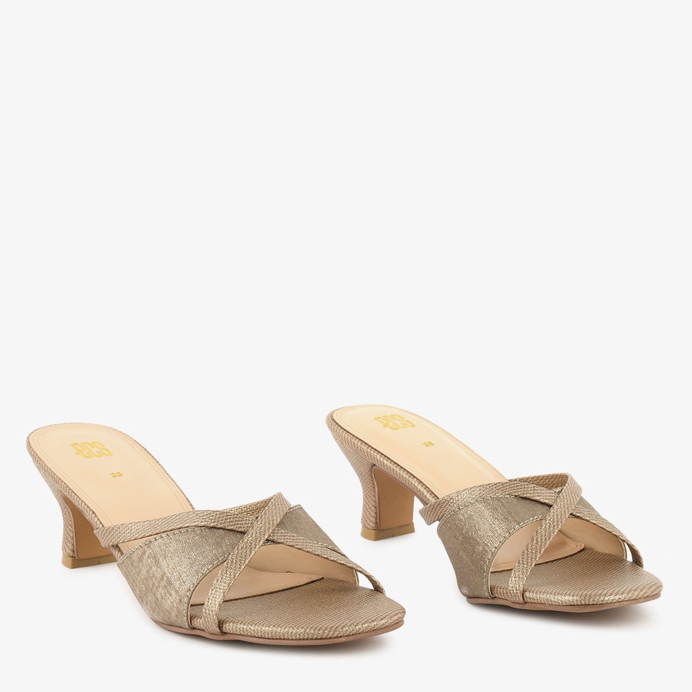An elegant slipper with crossover straps and a slightly curved heel, this piece balances grace and practicality. The subtle texture adds interest without overpowering the design.