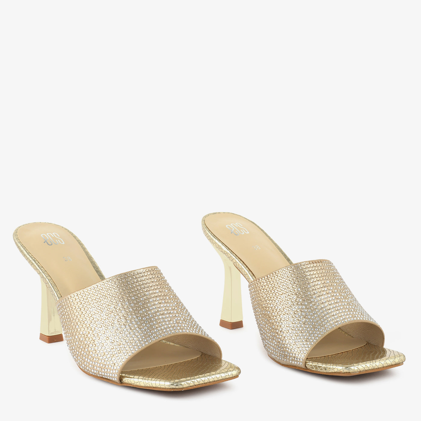 Step into dazzling elegance with these peach high heels. The shimmering straps are fully embellished with iridescent stones, adding a touch of glamorous sparkle to your evening look in Lahore. The unique heel provides a sophisticated lift for special occasions.