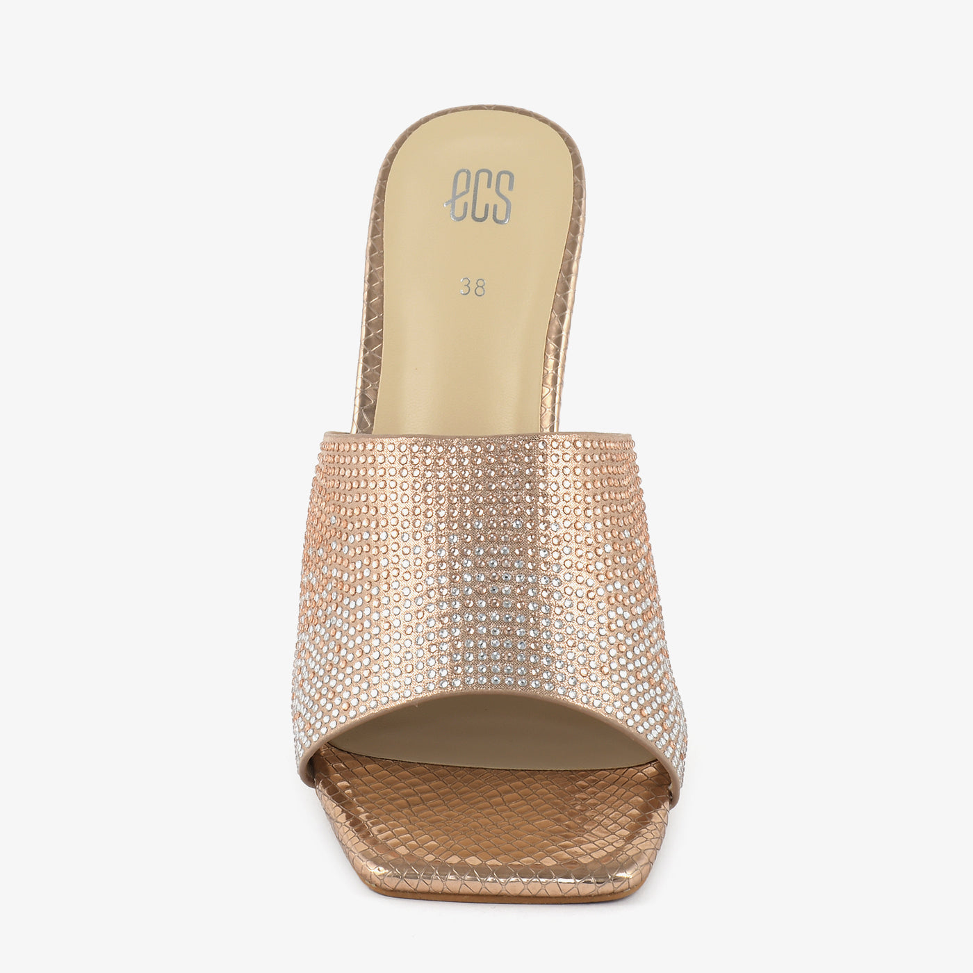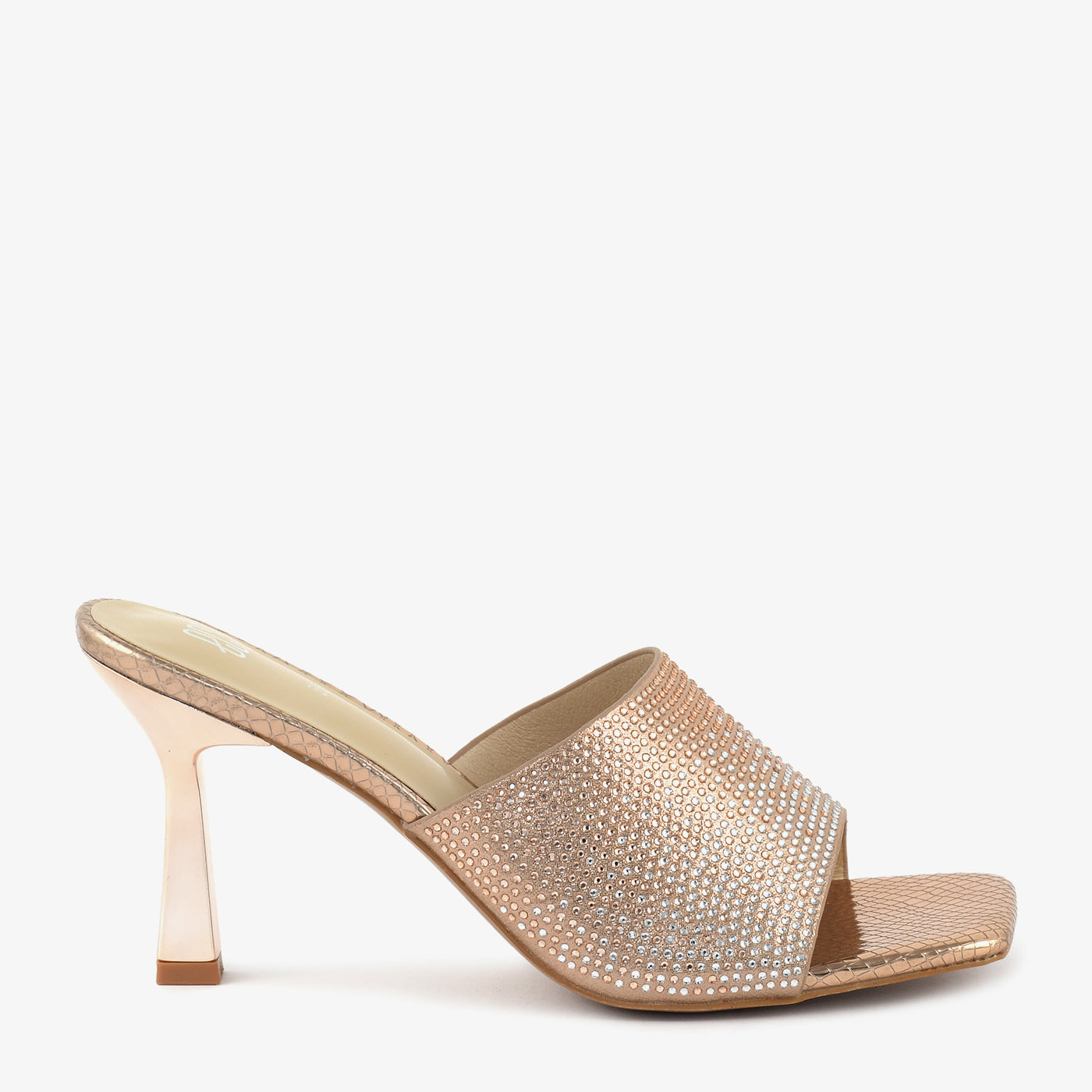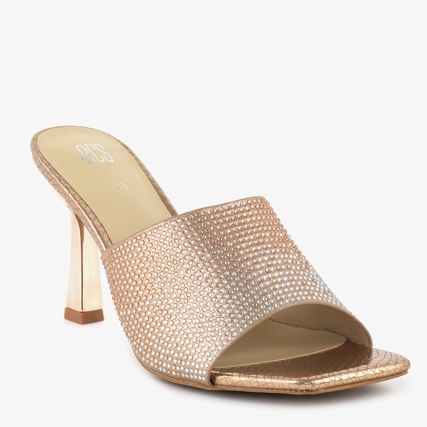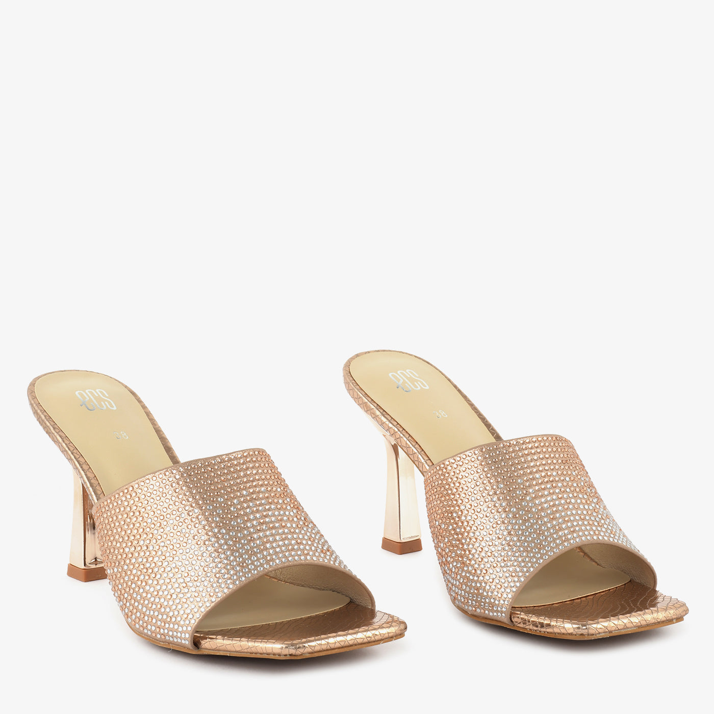 Step into dazzling elegance with these peach high heels. The shimmering straps are fully embellished with iridescent stones, adding a touch of glamorous sparkle to your evening look in...