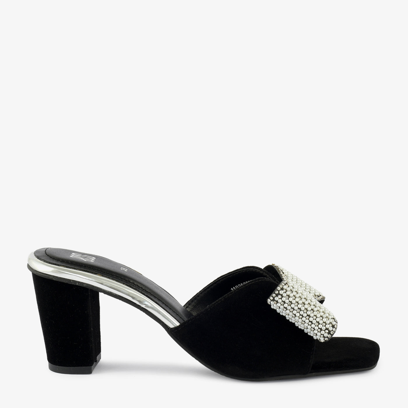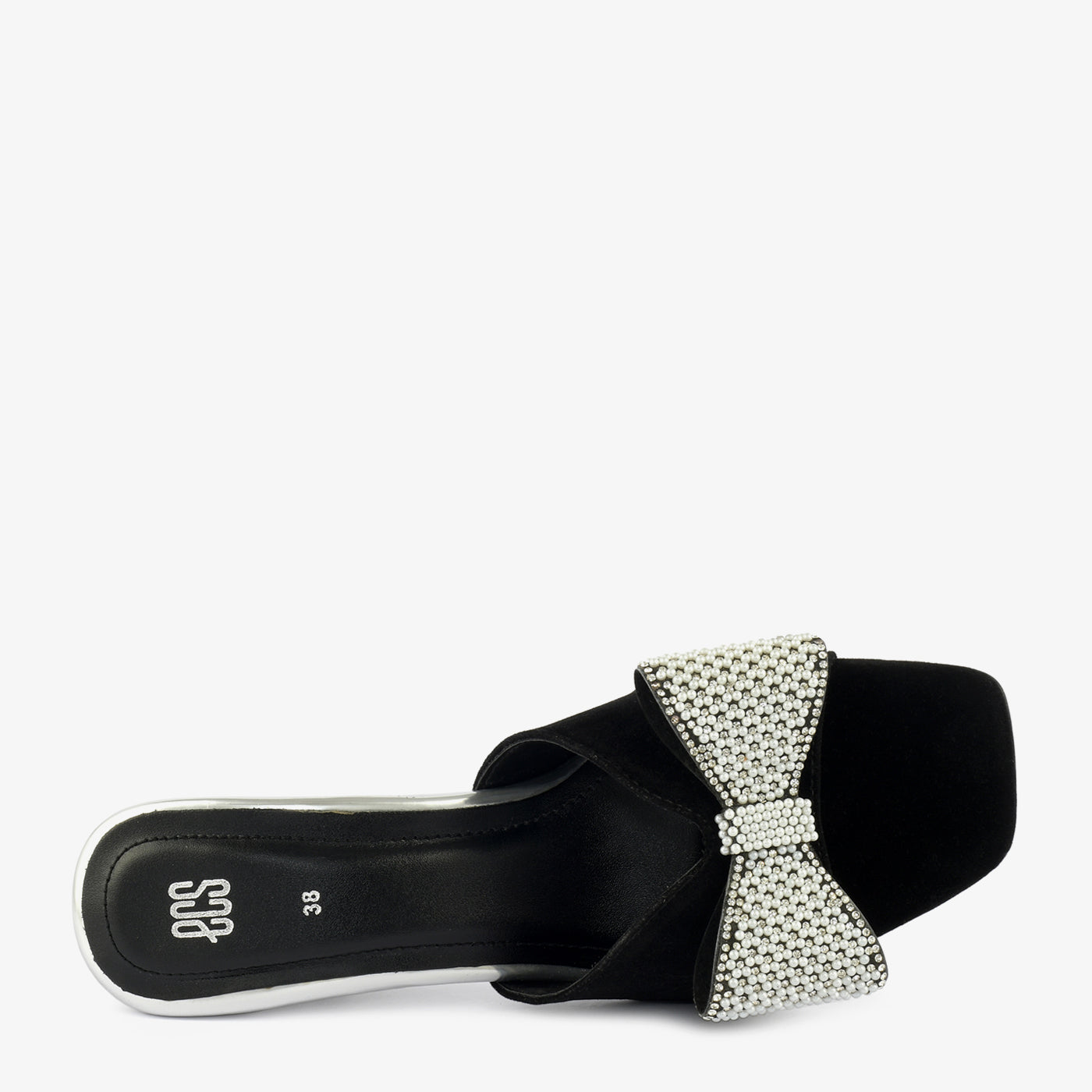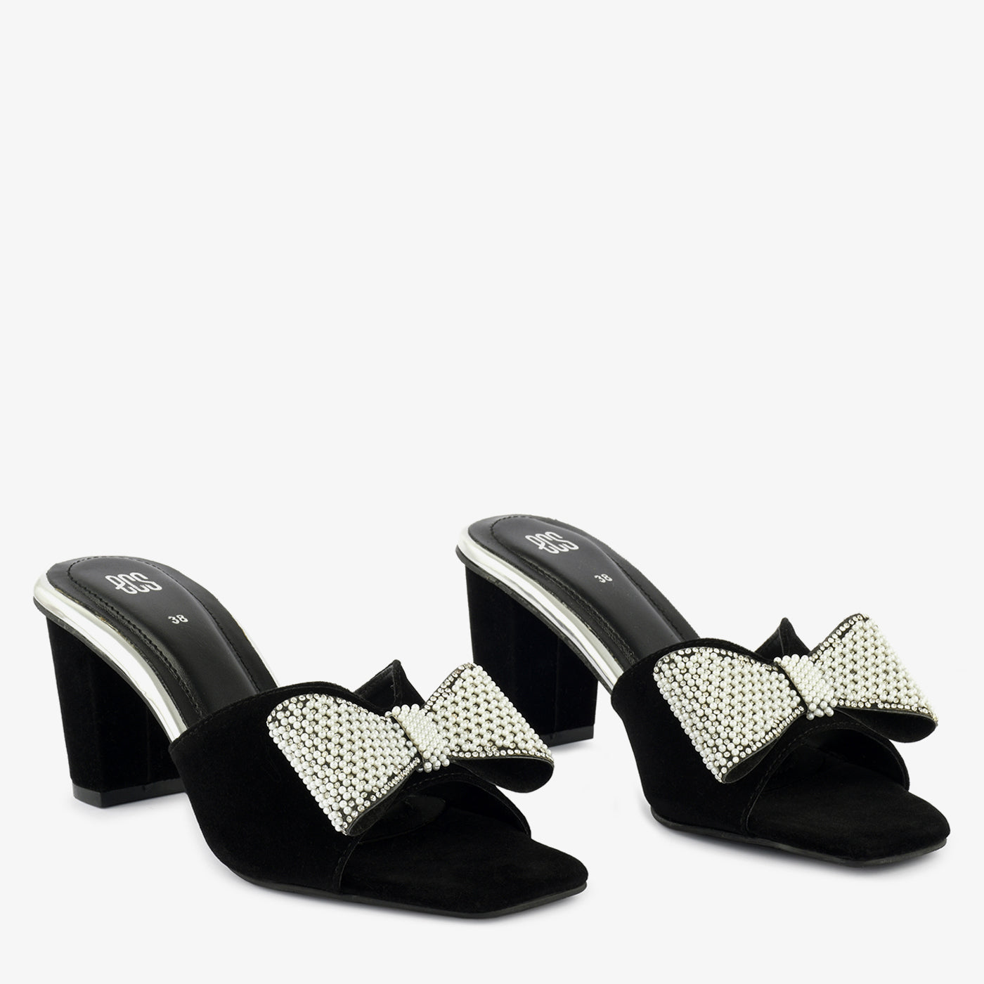 Step into sophisticated comfort with these women's slippers. They feature a plush upper adorned with a prominent bow detail, intricately embellished with pearls, set upon a sturdy block heel....