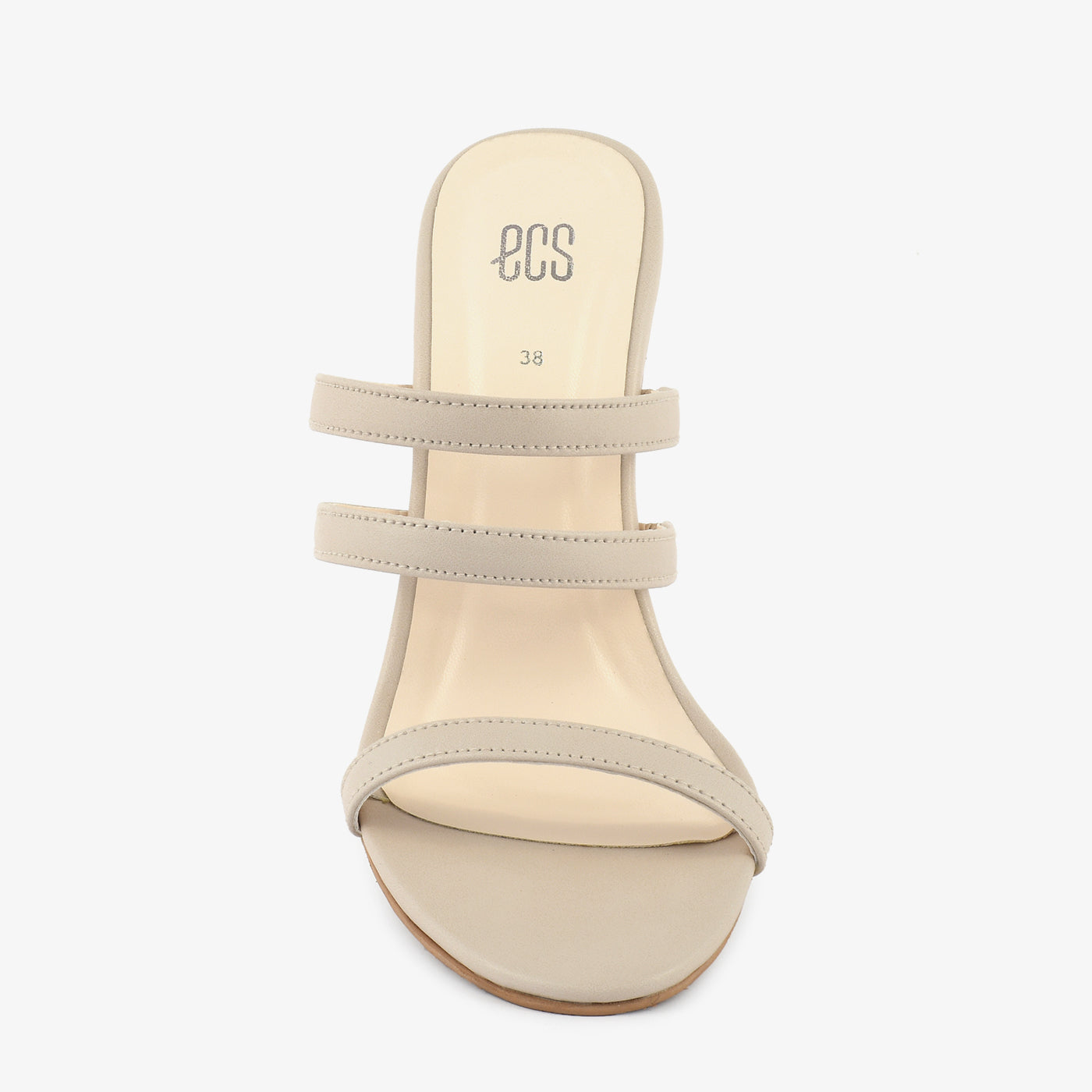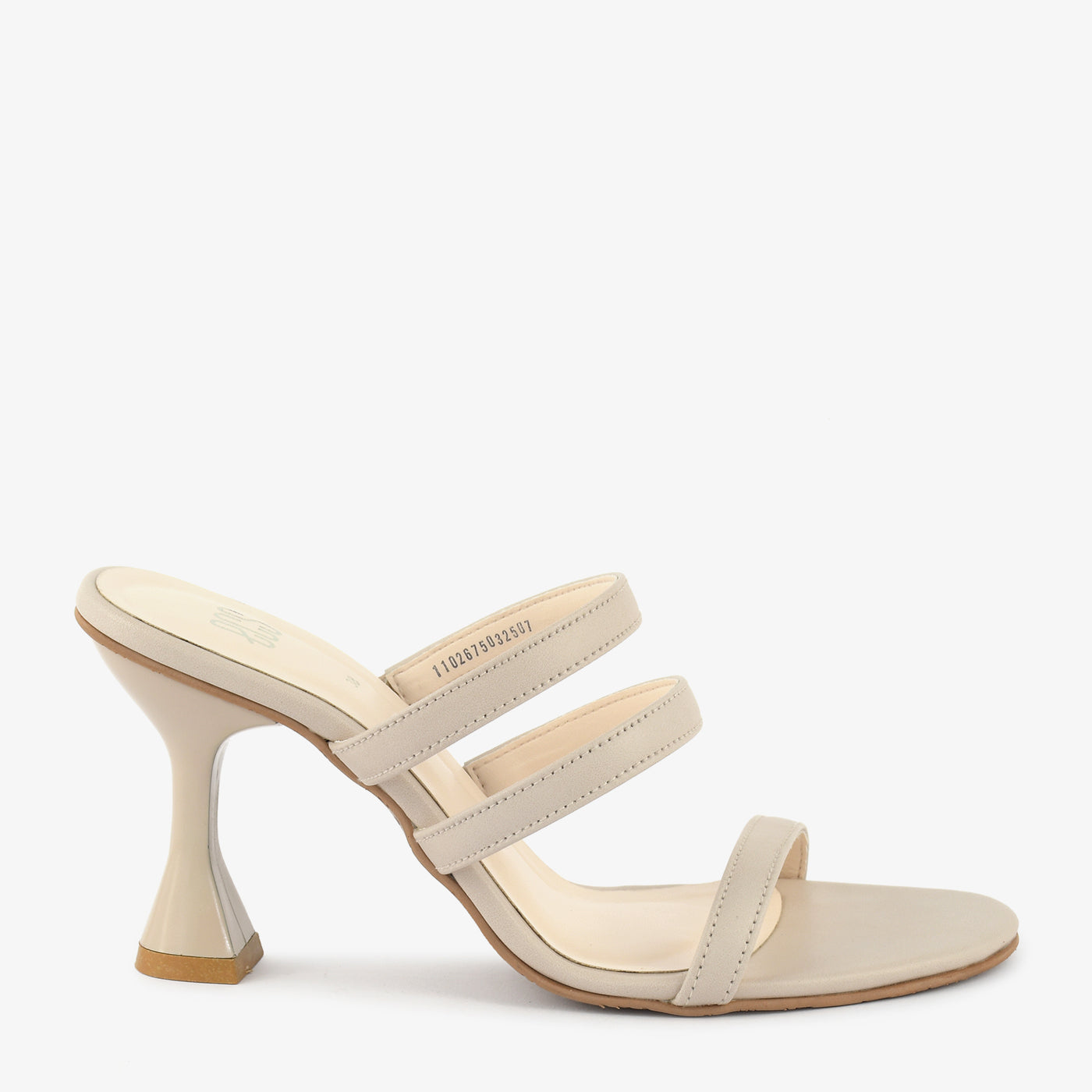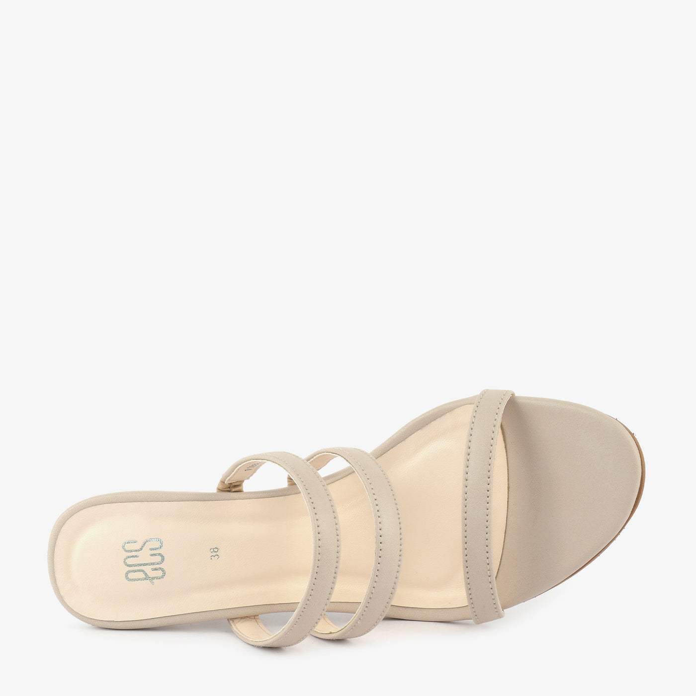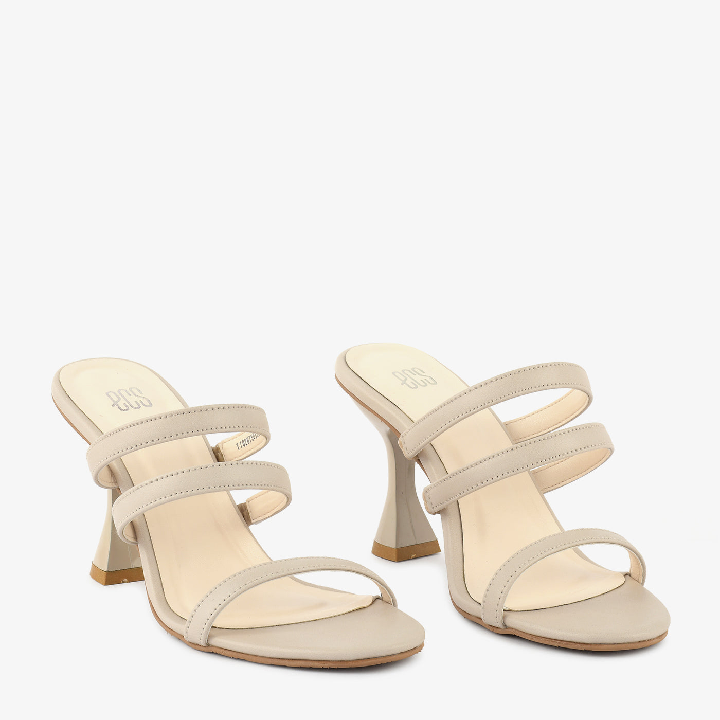 These elegant beige slippers feature a sleek, minimalist design. The three delicate straps offer a secure and stylish fit. A unique geometric heel adds a modern architectural element. Perfect for adding a touch of sophistication to any occasion.