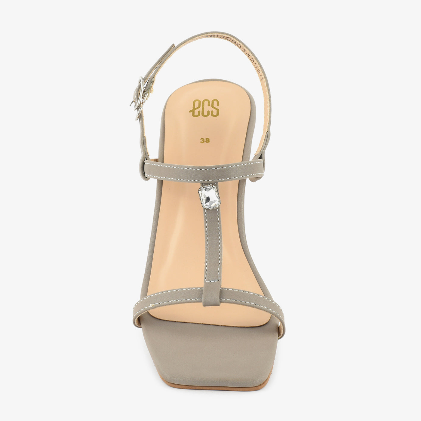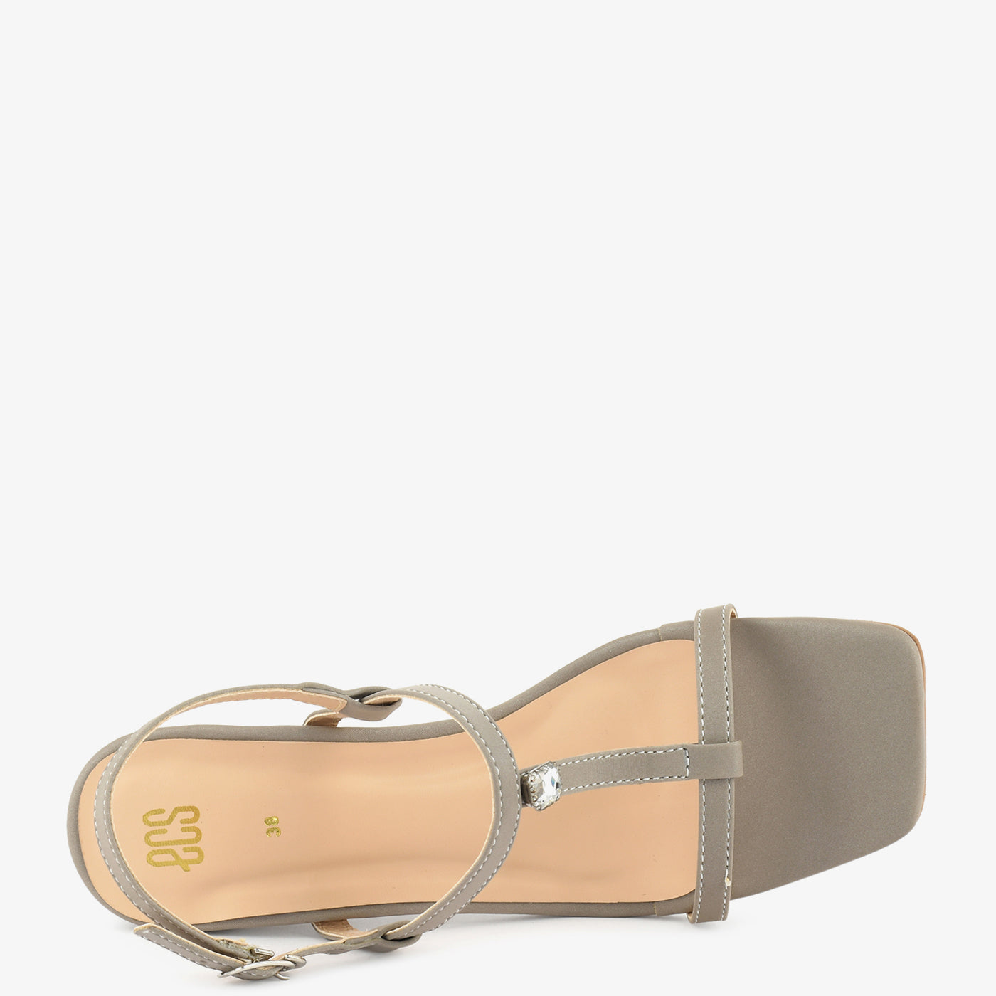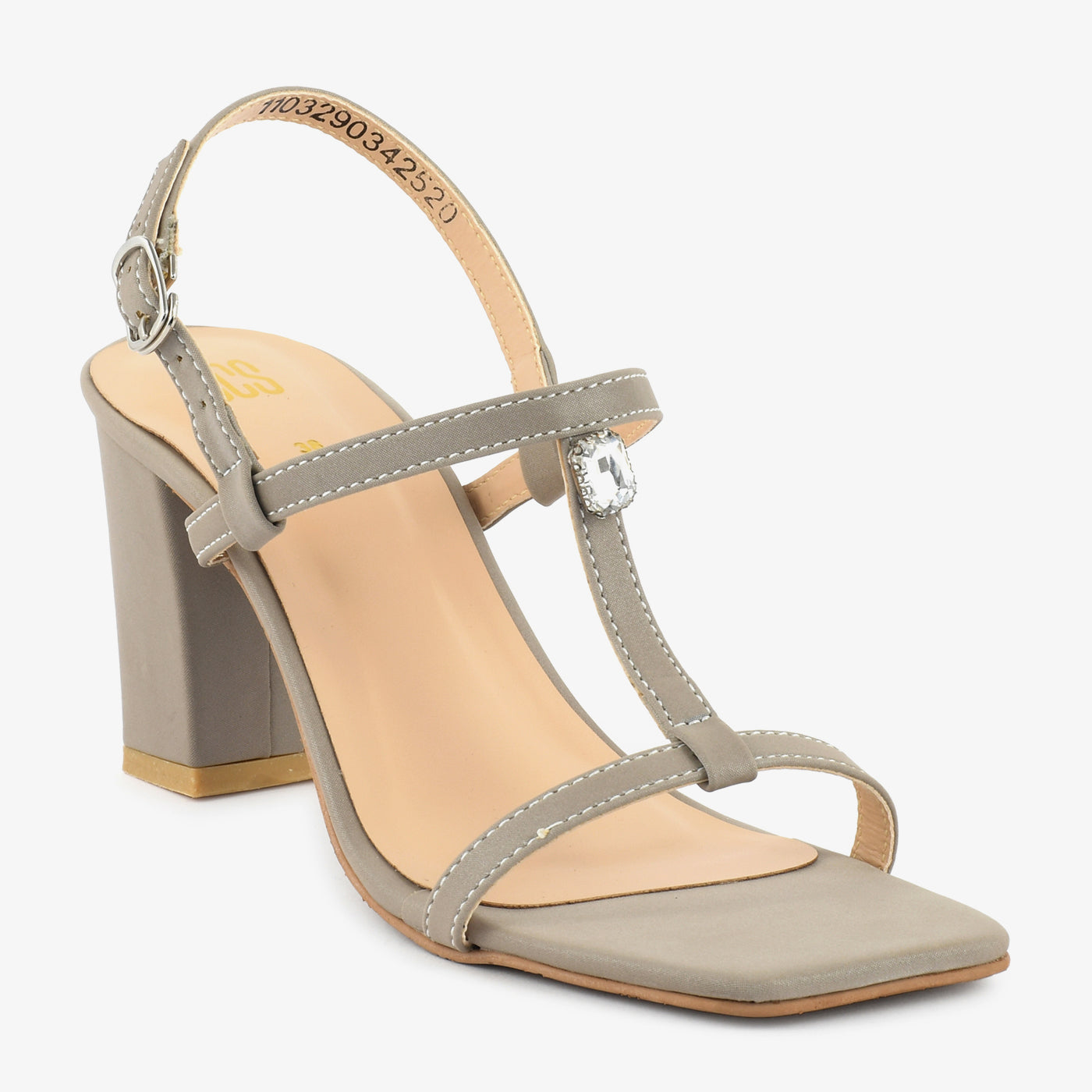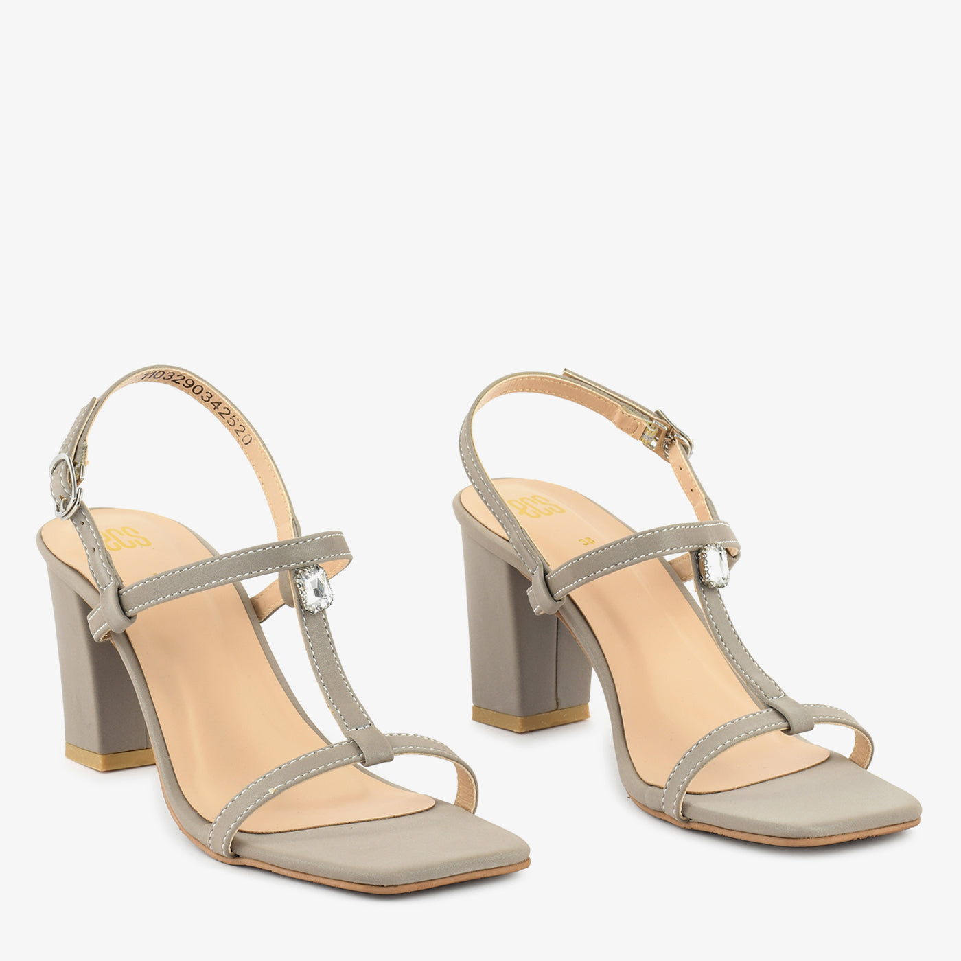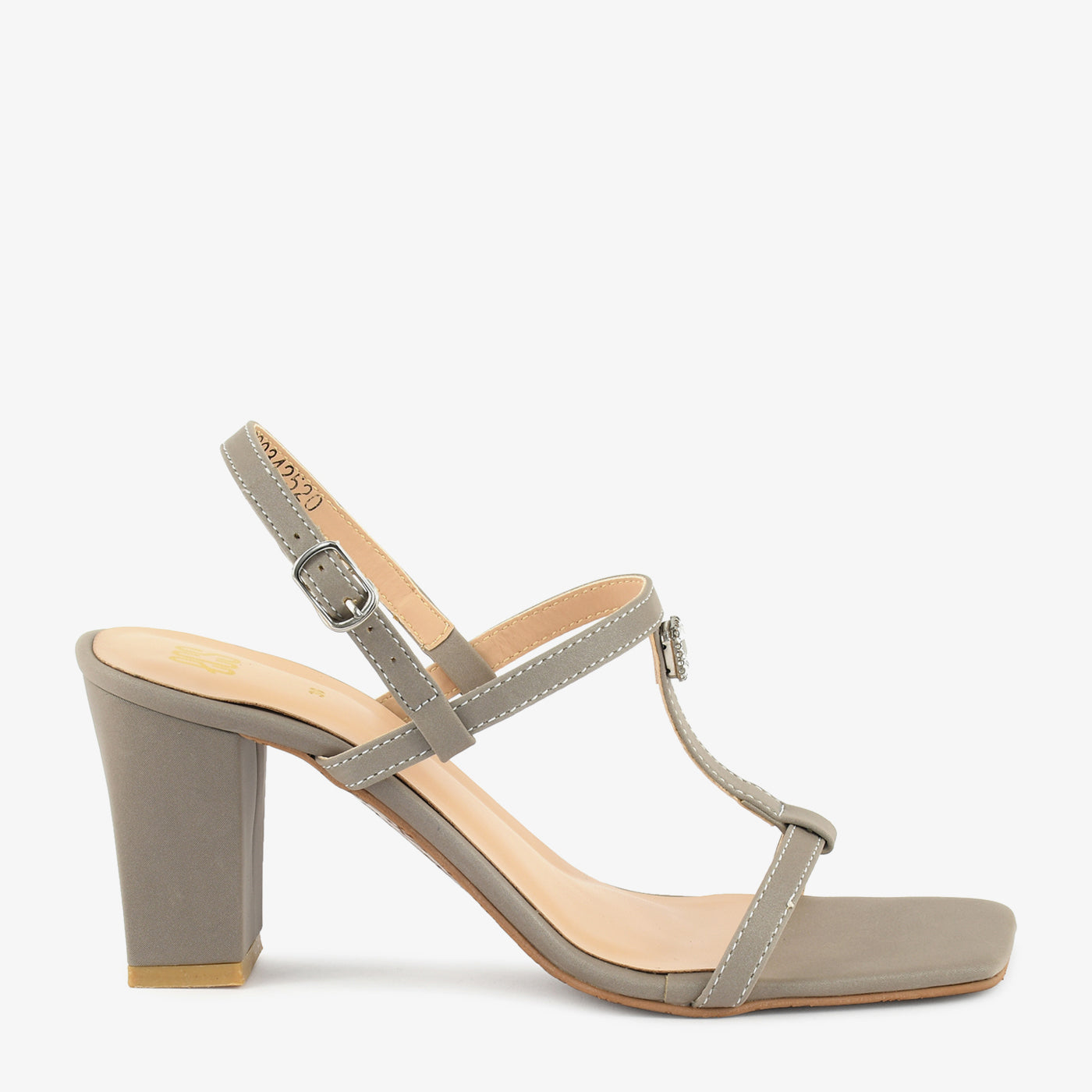 A delicate and minimalistic heel with a thin T-strap design, accented by a single gem embellishment. The sleek silhouette offers both grace and stability.