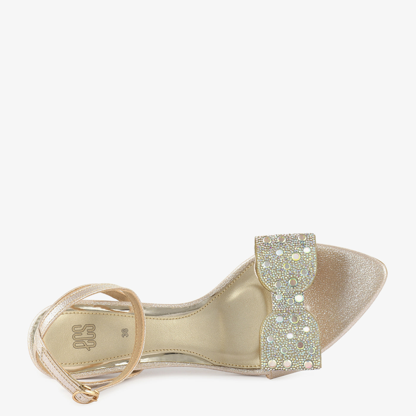Step into delicate sparkle with these gold sandals. The shimmering finish and the charming bow detail, adorned with iridescent stones, add a touch of sweet elegance to your look...