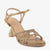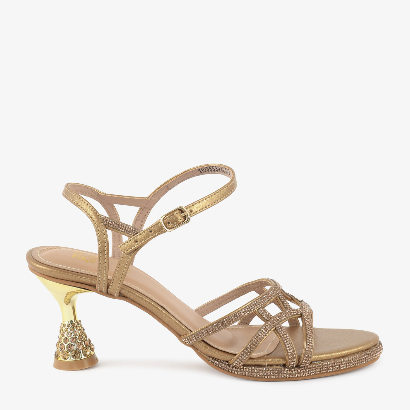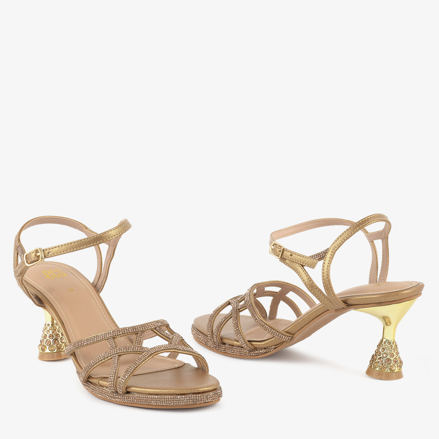 Step into radiant glamour with these gold heels. The delicate, crisscrossing straps are beautifully embellished, and the unique, petal-shaped heel adds a touch of artistic flair to your evening look.