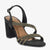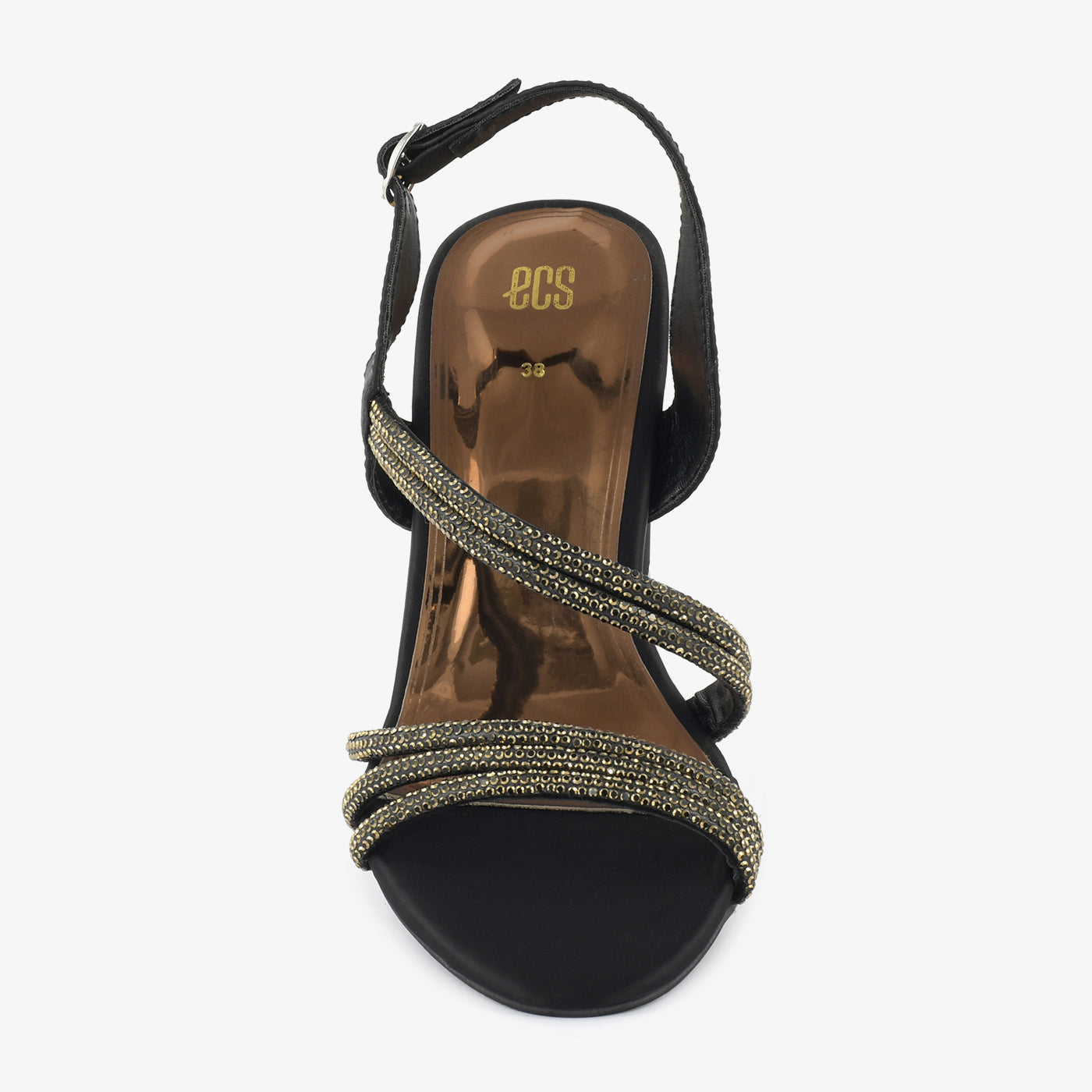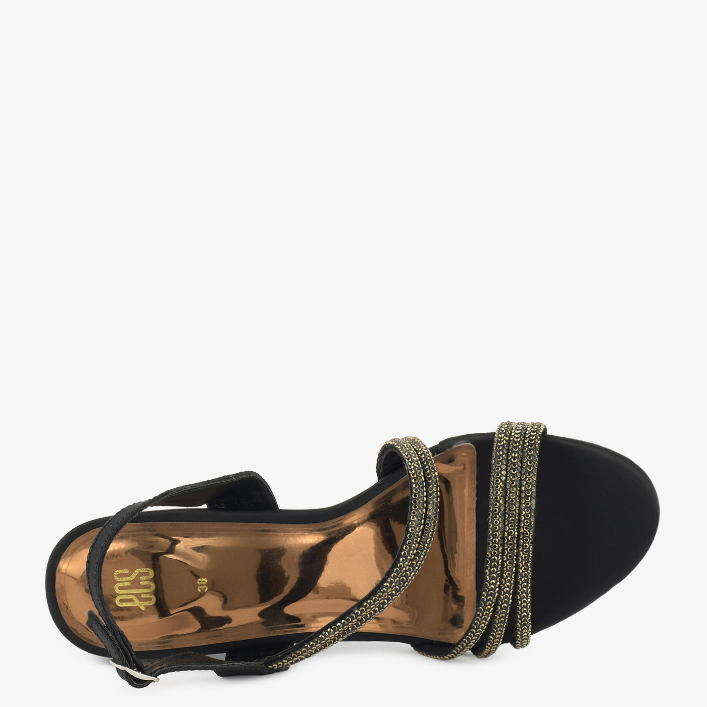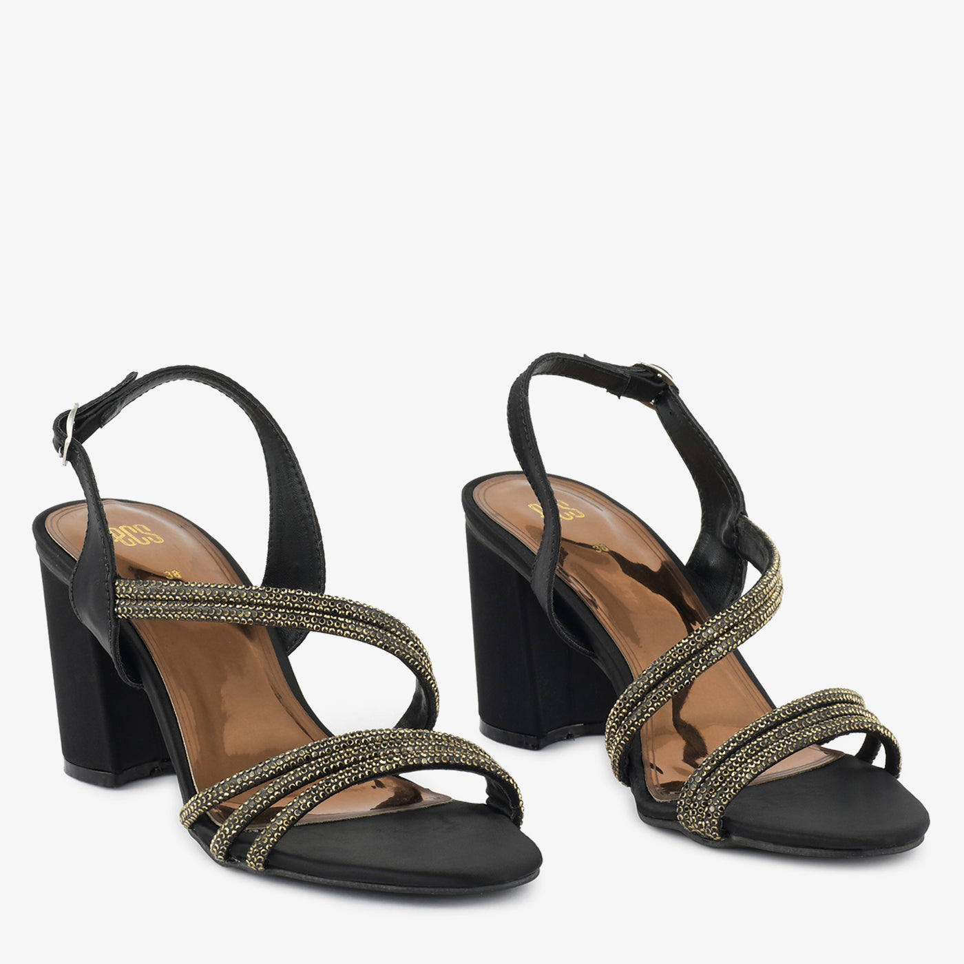 Step into dazzling allure with these black heels featuring interlacing gold embellished straps. The intricate design adds a touch of opulent glamour to your evening look. The high block heel provides a sophisticated and head-turning lift for special occasions.