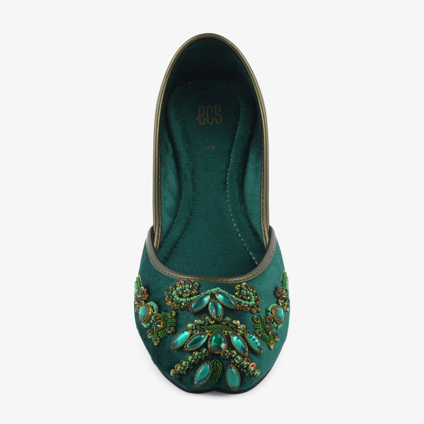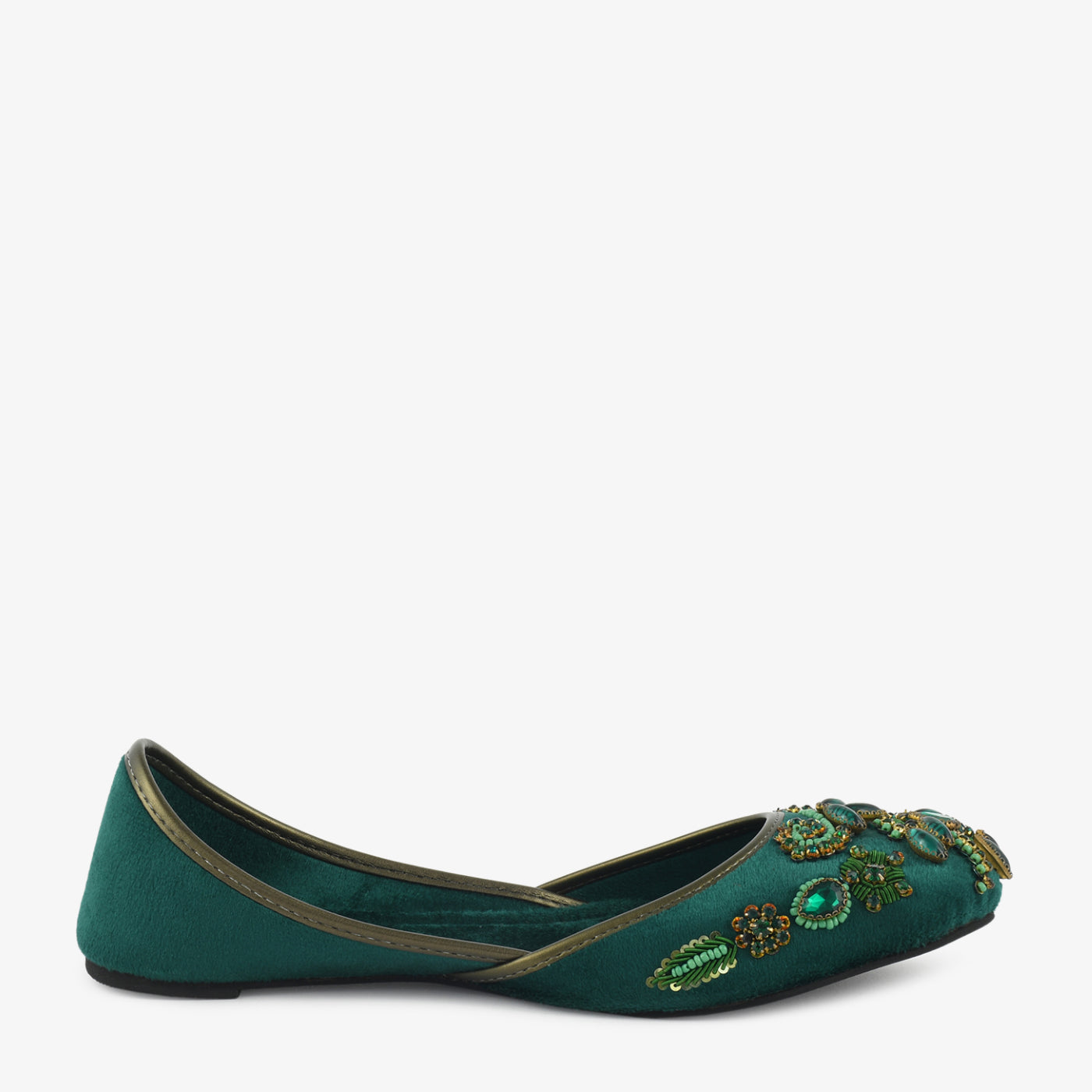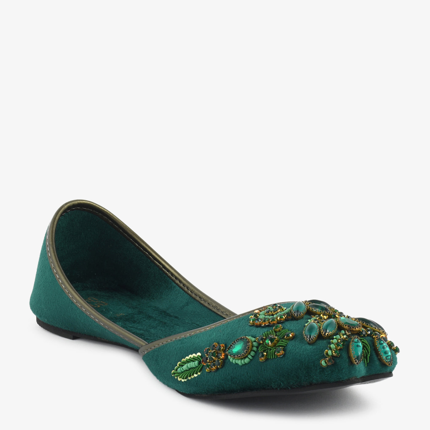 A beautifully crafted traditional khussa featuring intricate hand-style embellishments inspired by classic motifs. The detailed surface work adds a rich, artisanal feel while maintaining a comfortable flat structure. Its closed-front design ensures a snug and secure fit. Ideal for festive wear, cultural events, and special occasions. This khussa effortlessly blends tradition with refined elegance.
