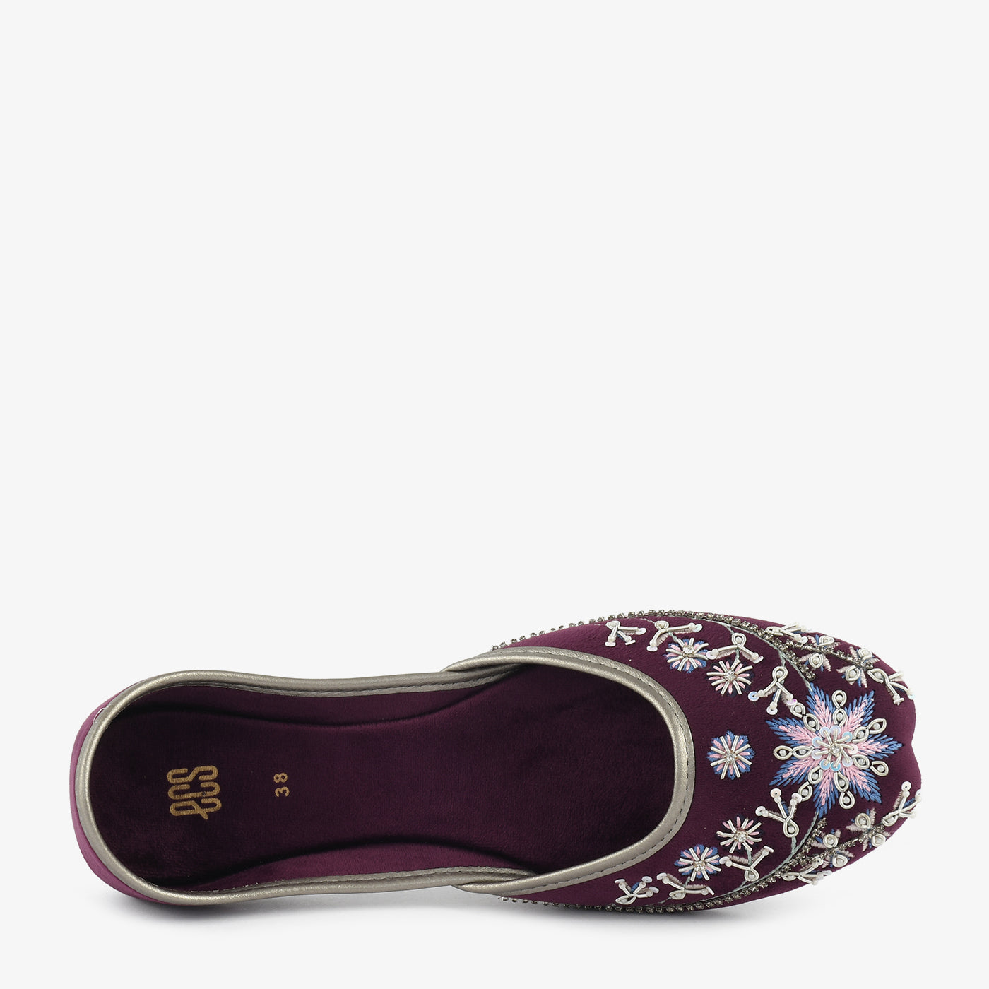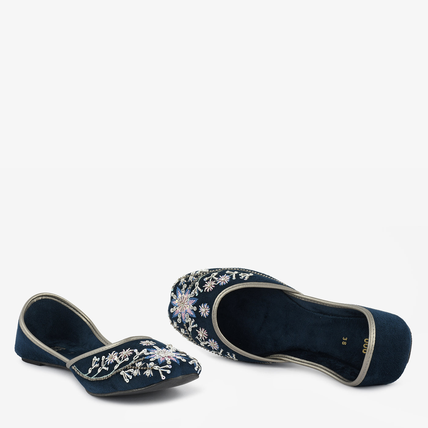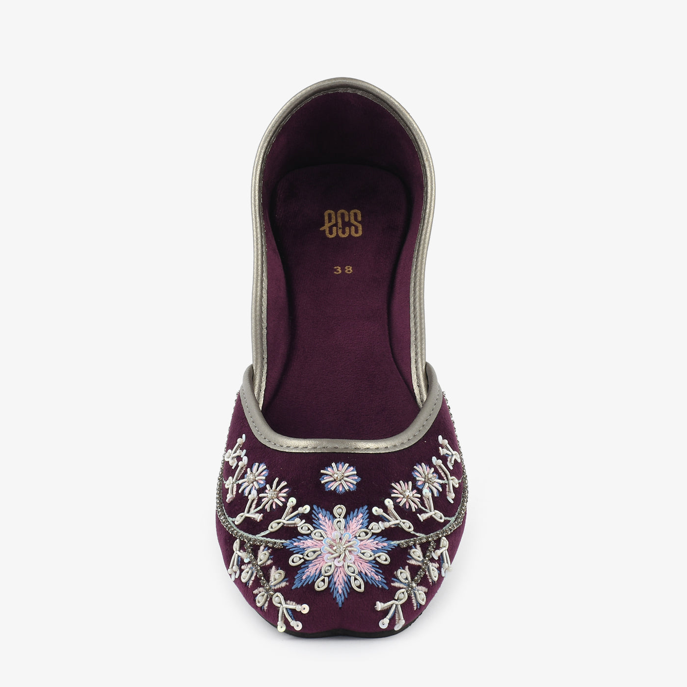 A velvet khussa with delicate silver embroidery and shimmering accents. Designed for comfort with a touch of glamour.