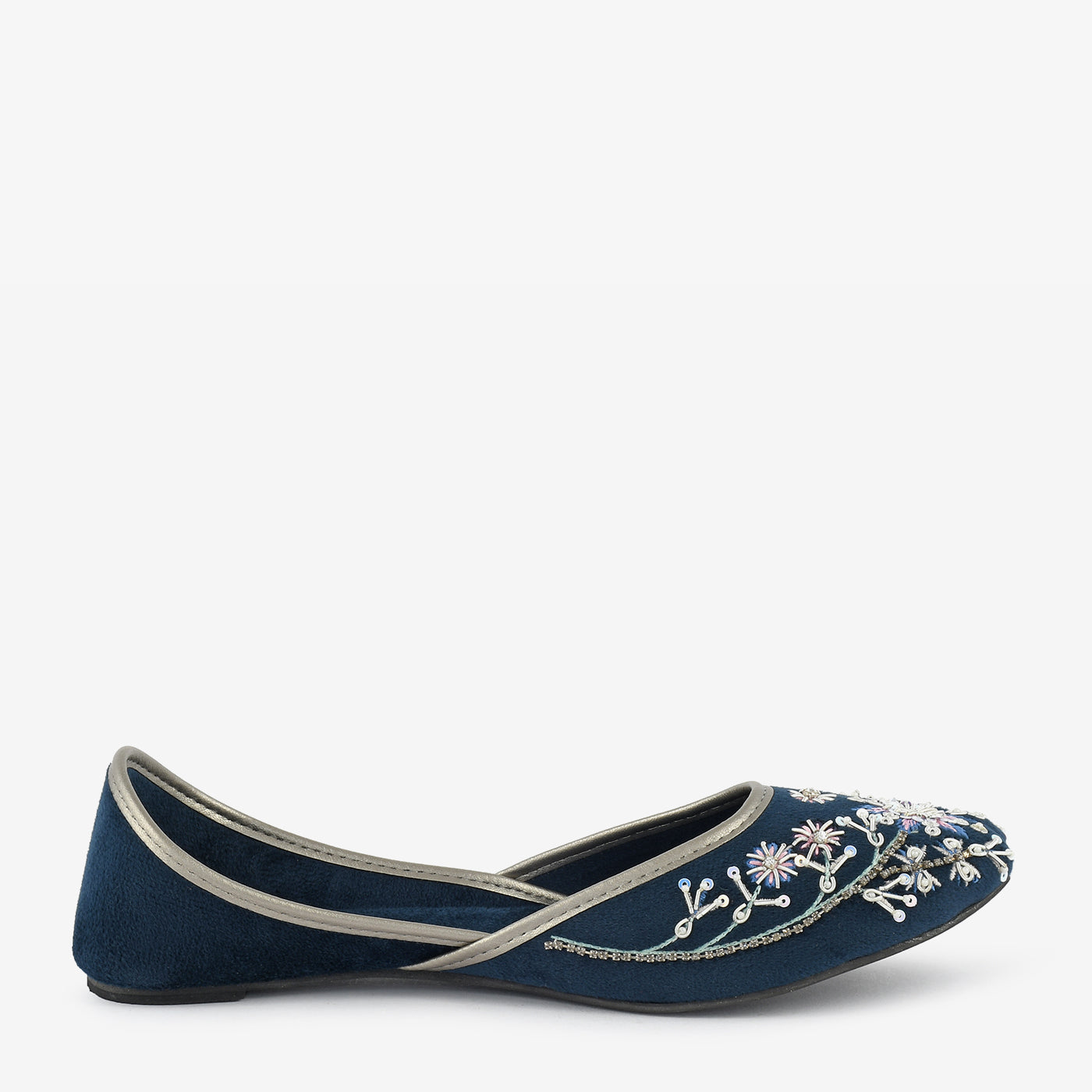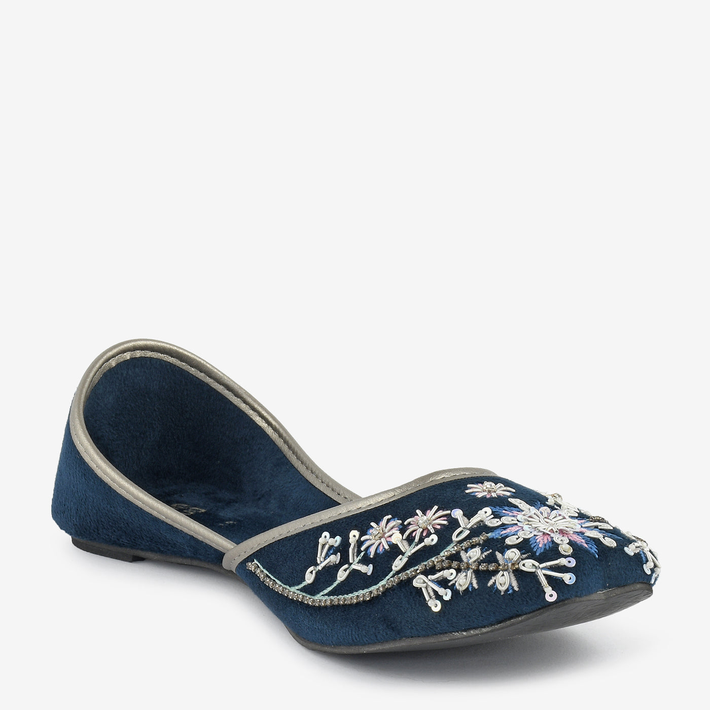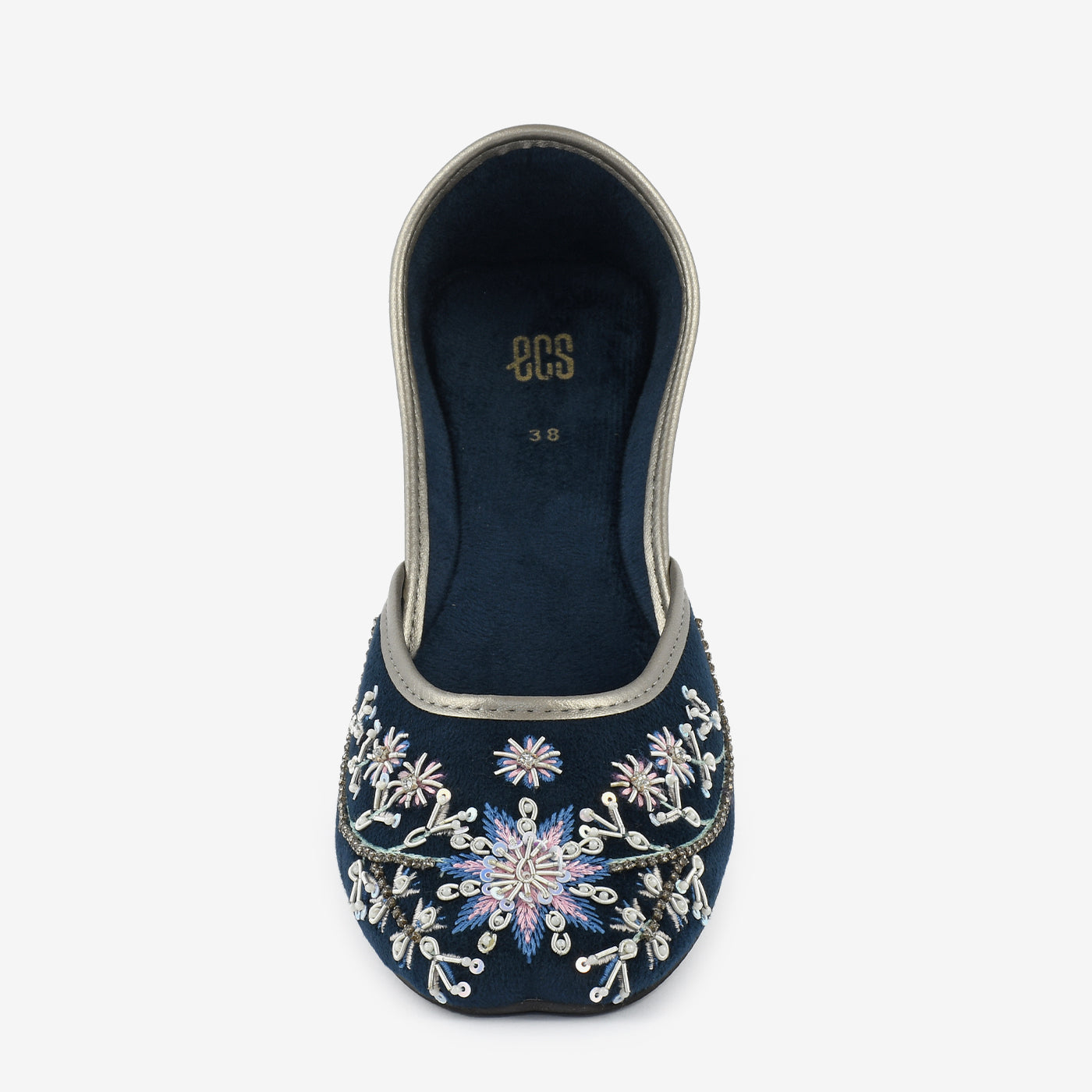 A velvet khussa with delicate silver embroidery and shimmering accents. Designed for comfort with a touch of glamour.