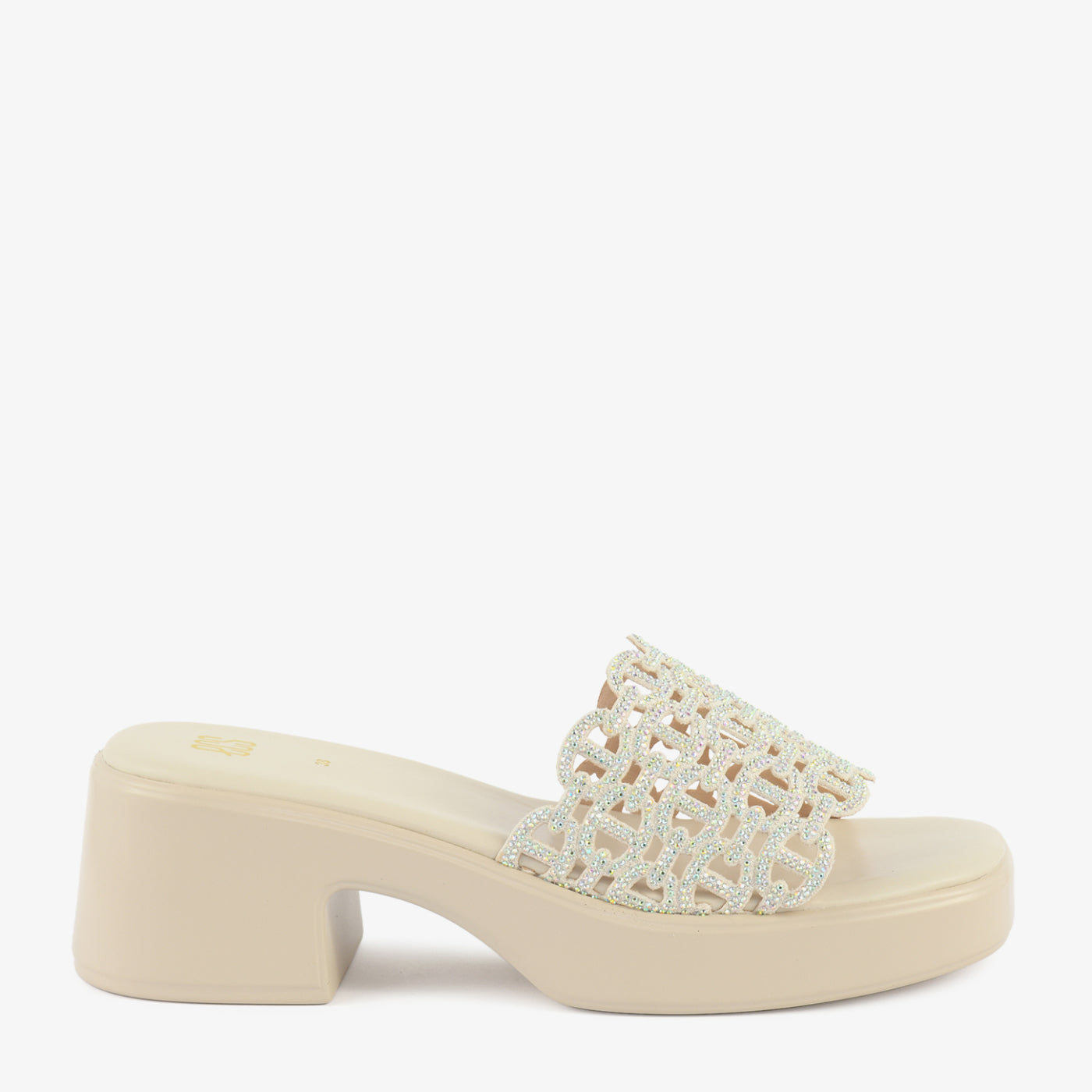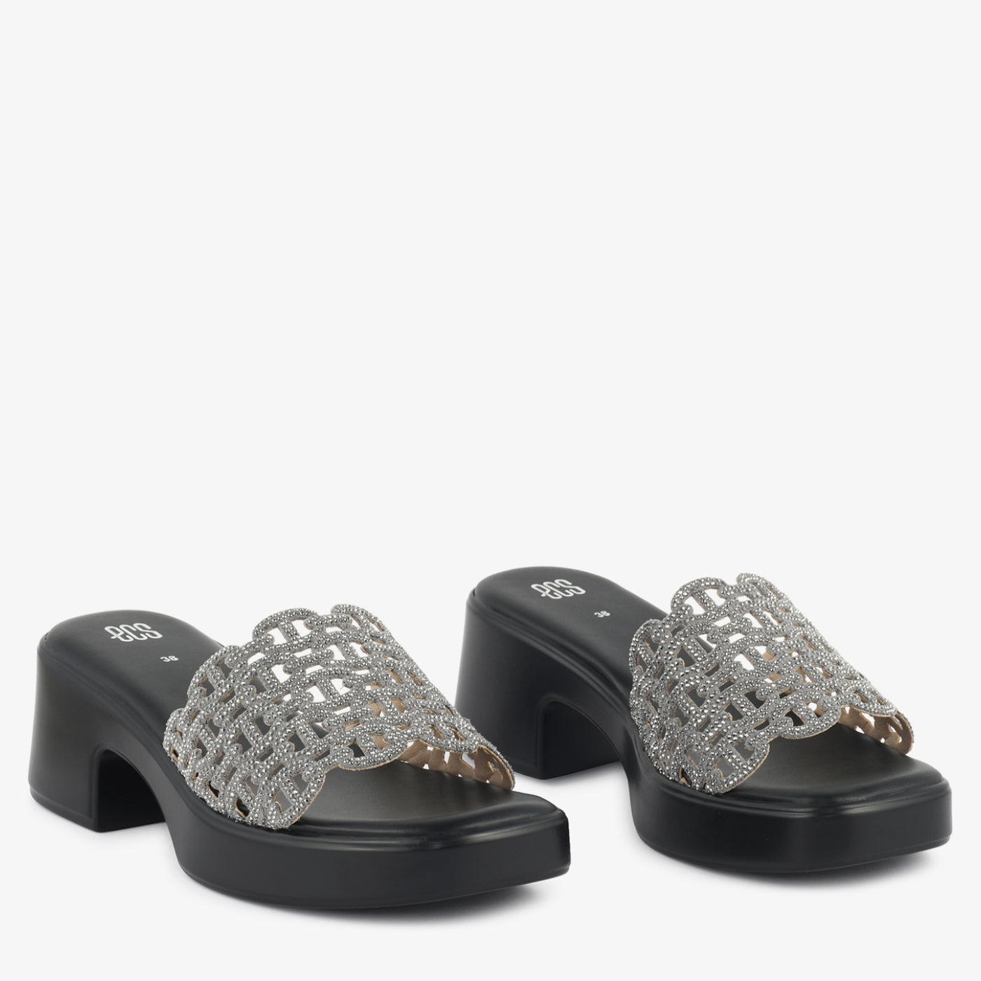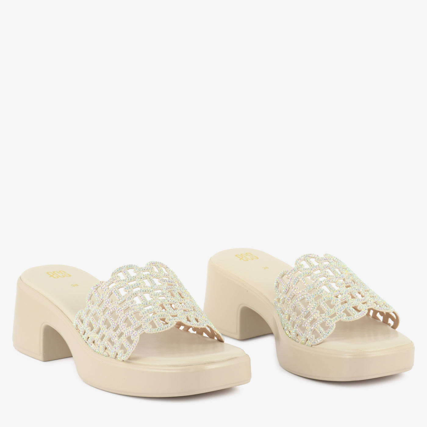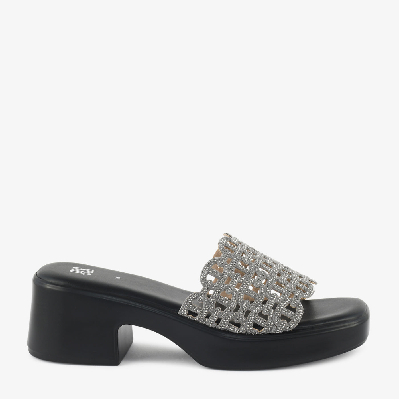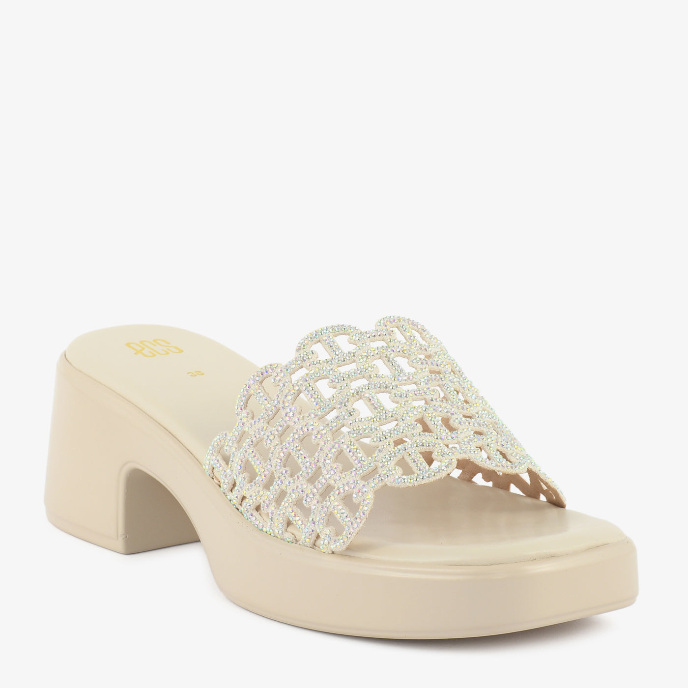 Striking in silhouette and refined in detail, this heeled slipper is designed to make a lasting impression. The elevated block heel offers balanced height and stable support, while the smooth footbed ensures comfortable wear. A beautifully embellished lattice strap is adorned with shimmering crystal accents, creating a radiant textured effect. The scalloped edges enhance its graceful structure, adding dimension to the overall design. Crafted to transition effortlessly from evening gatherings to special occasions, this slipper blends glamour with modern elegance. Its bold profile and intricate detailing make it a standout addition to any contemporary footwear collection. Perfect for those who appreciate statement style with confident comfort.