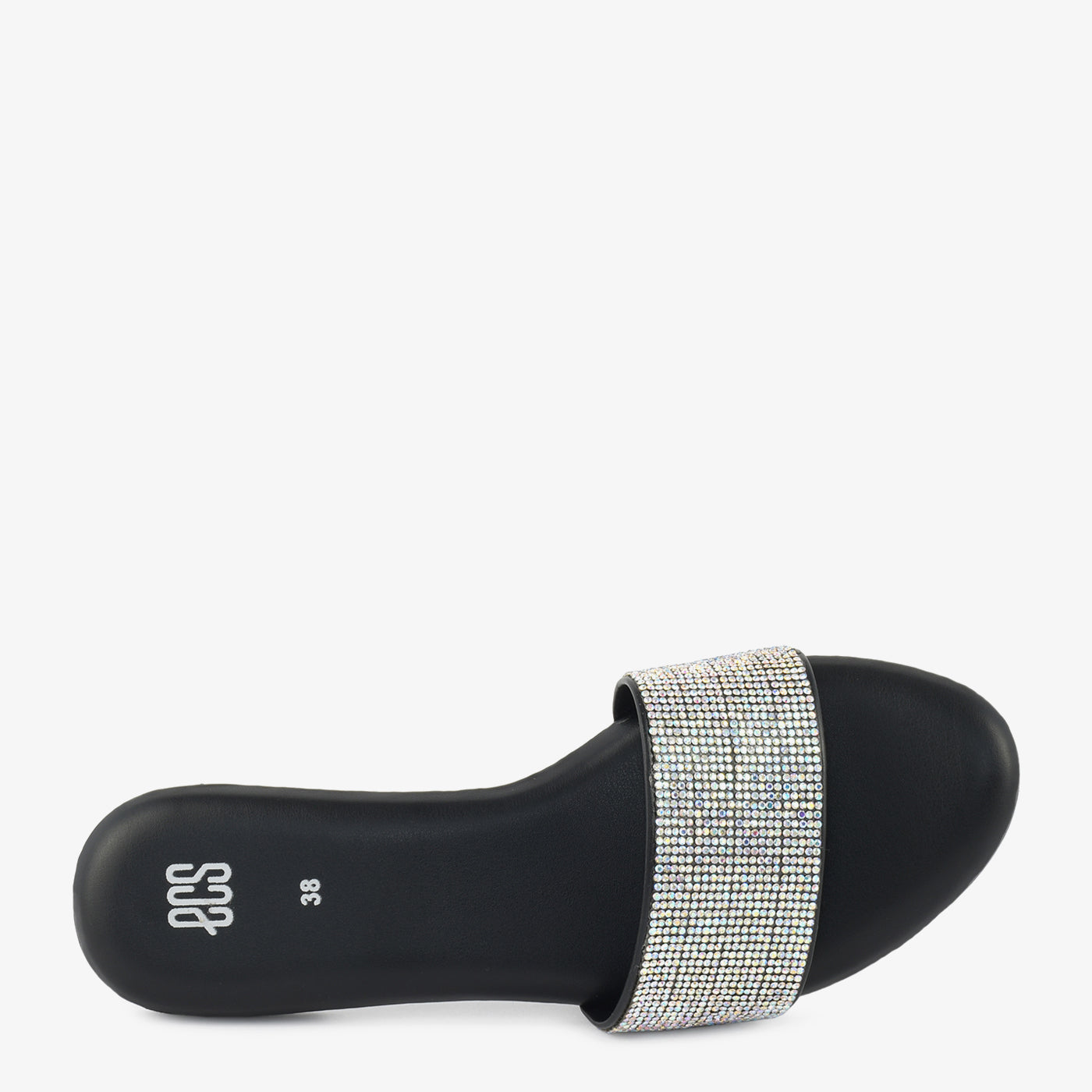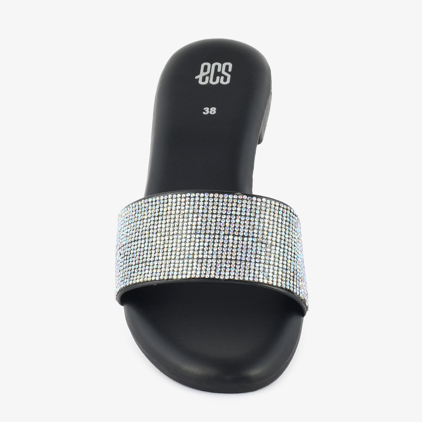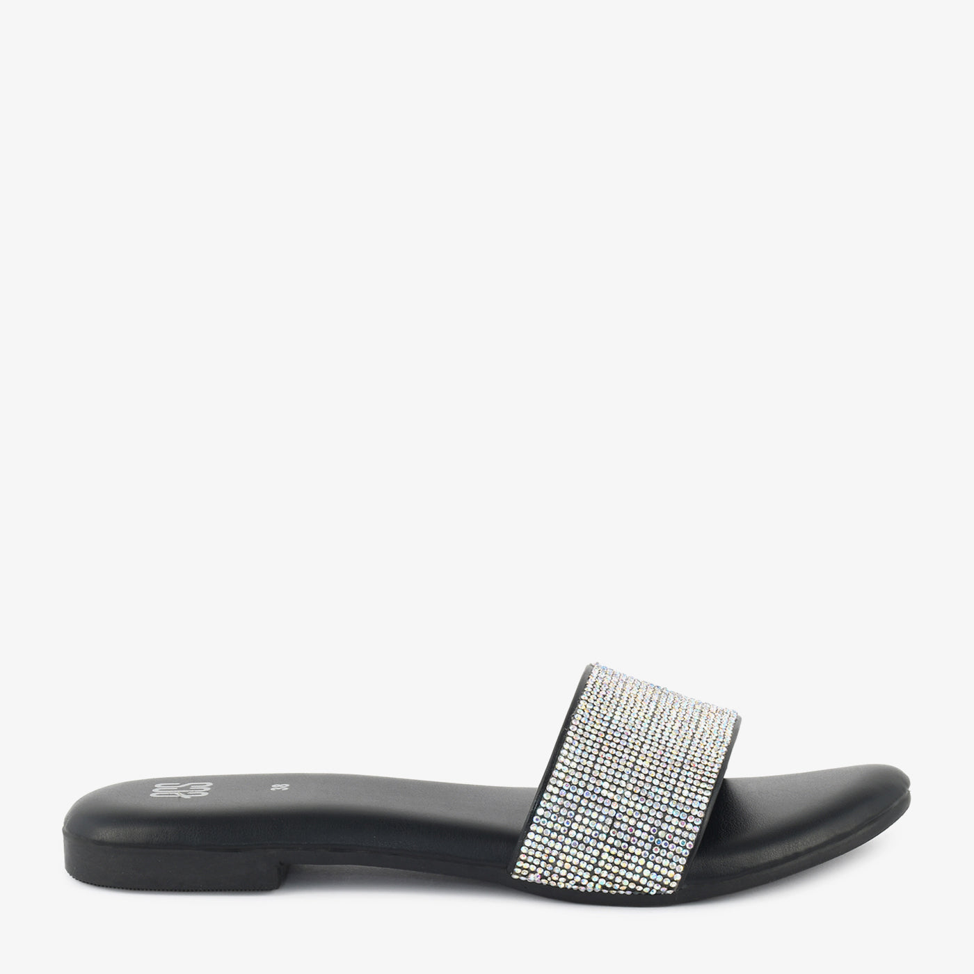 Step into glamorous comfort with these flat slides. The wide strap is fully embellished with shimmering rhinestones, adding a touch of dazzling sparkle to your look. The flat sole ensures comfortable wear for any occasion.