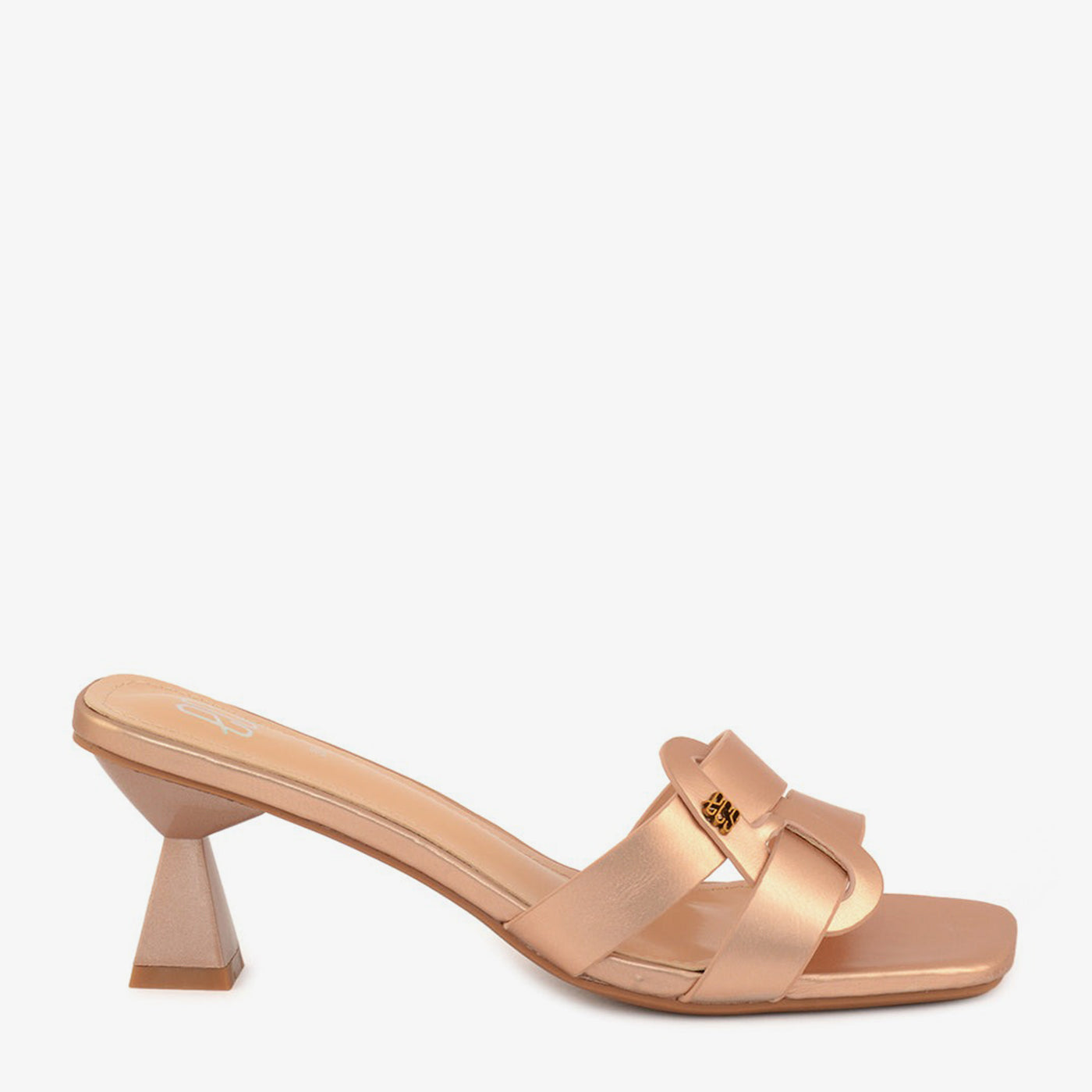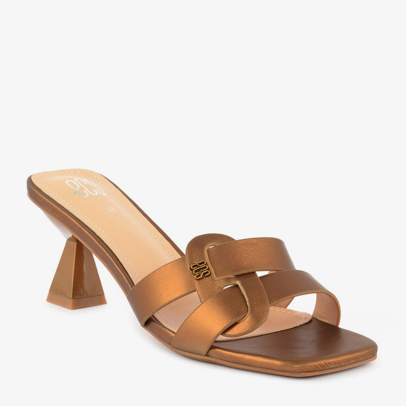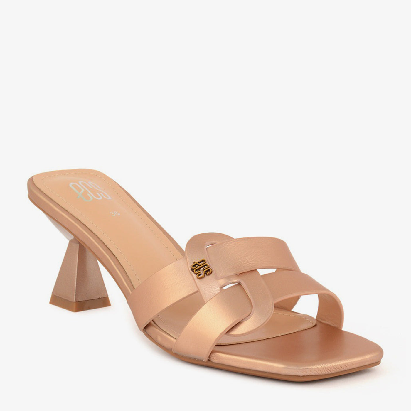 Designed with interlocked broad straps and a signature logo accent, this minimal heel offers a polished silhouette and balanced elevation through its geometric heel.