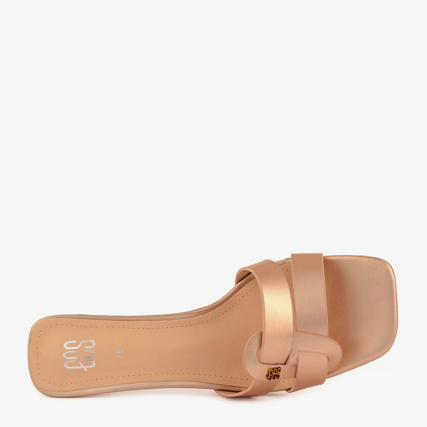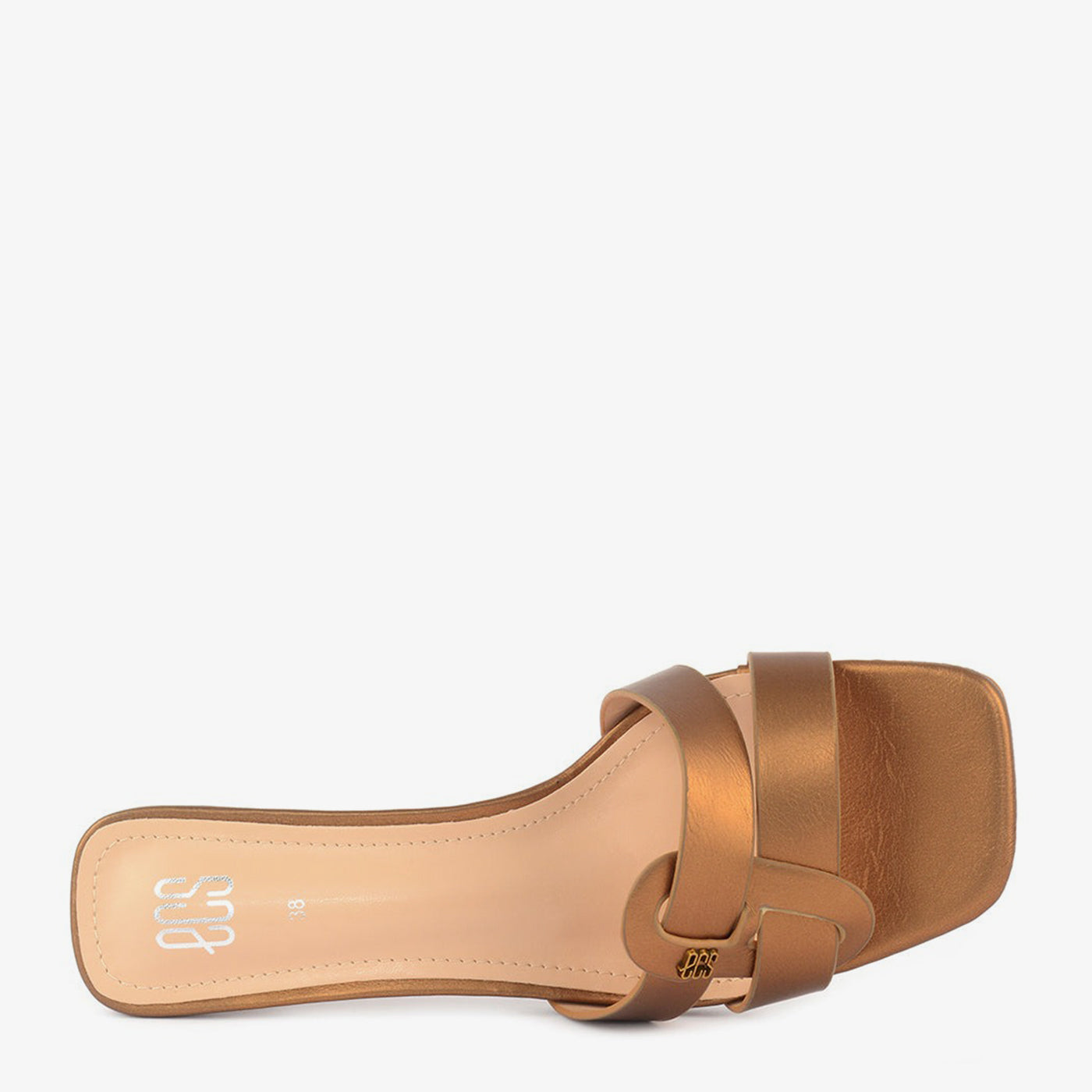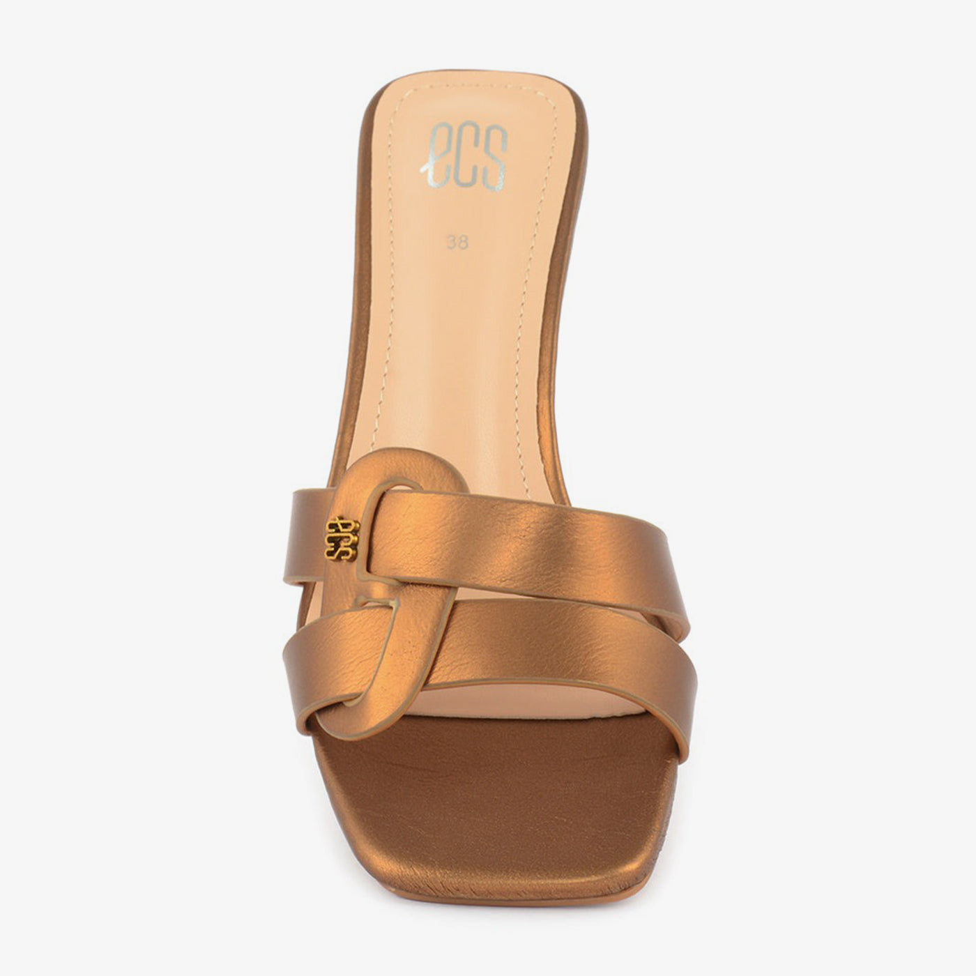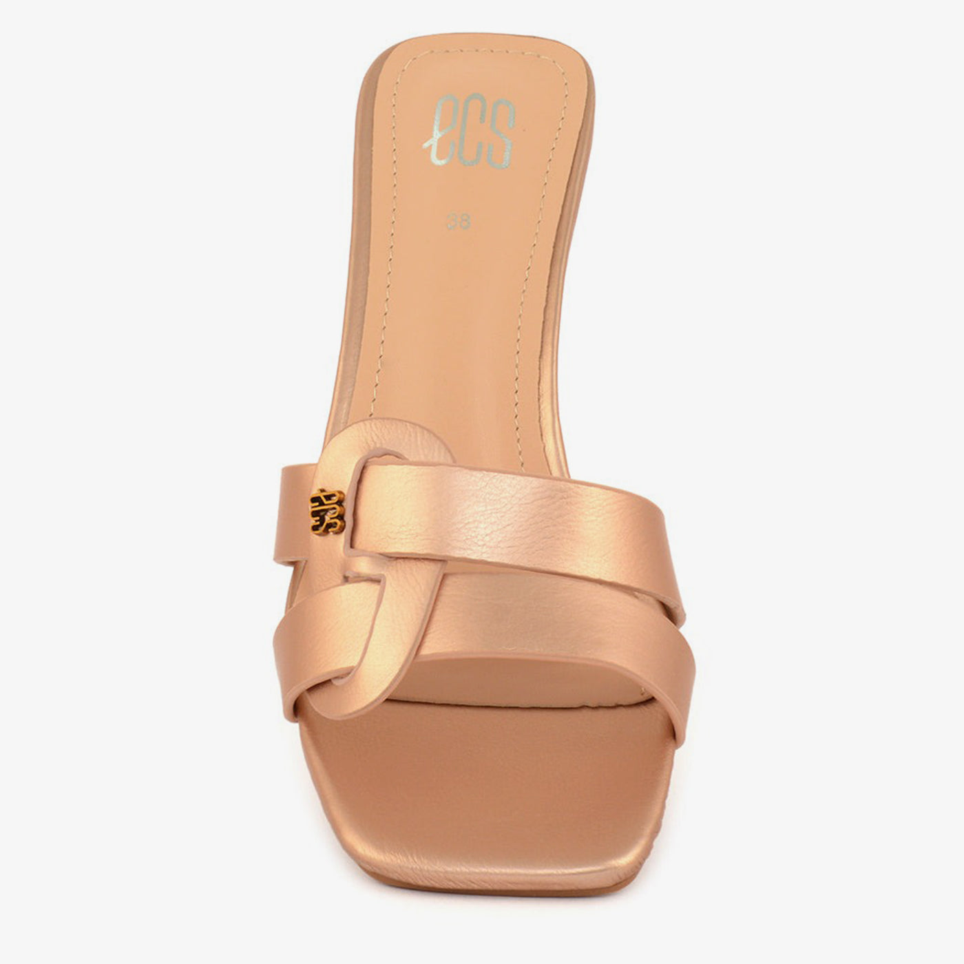 Designed with interlocked broad straps and a signature logo accent, this minimal heel offers a polished silhouette and balanced elevation through its geometric heel.