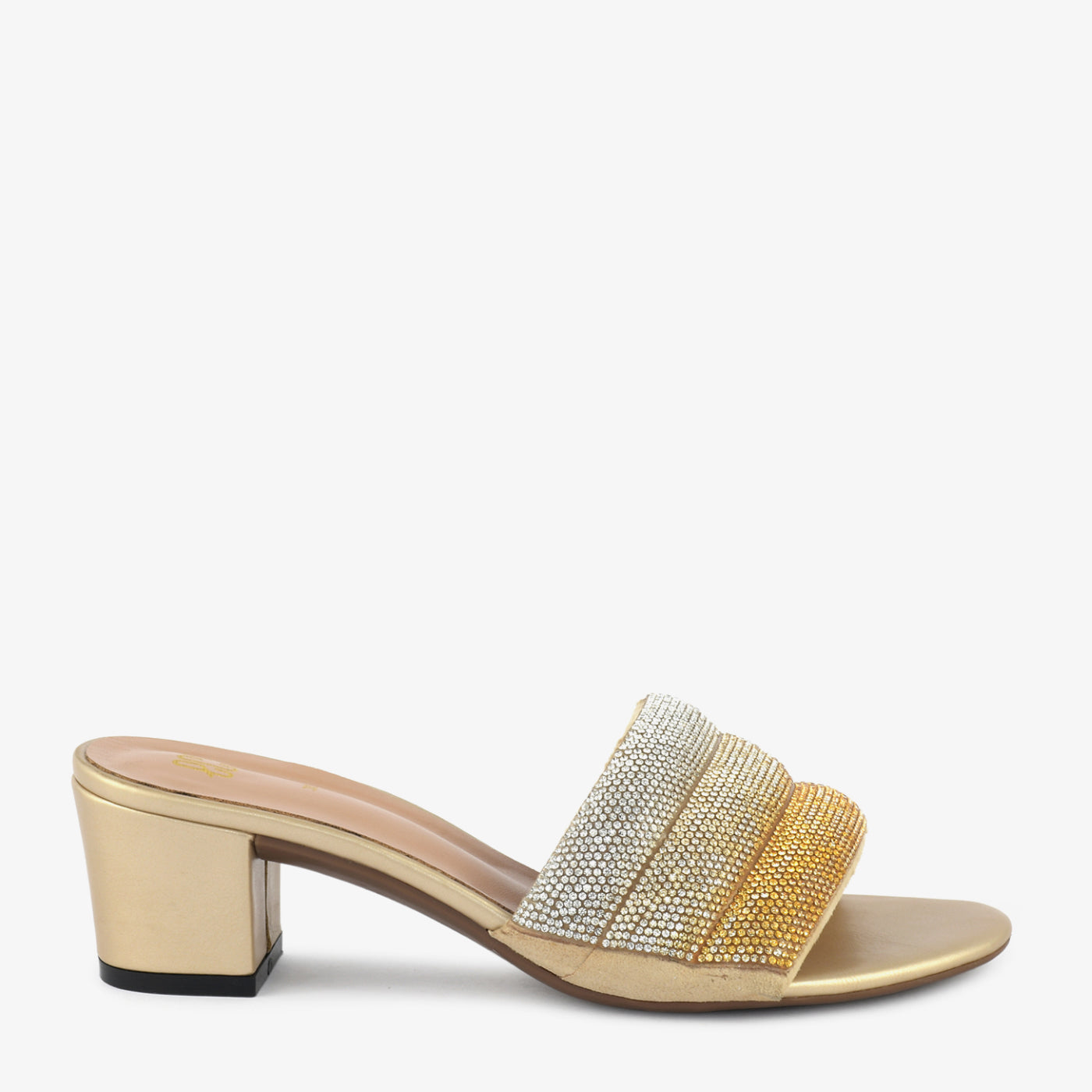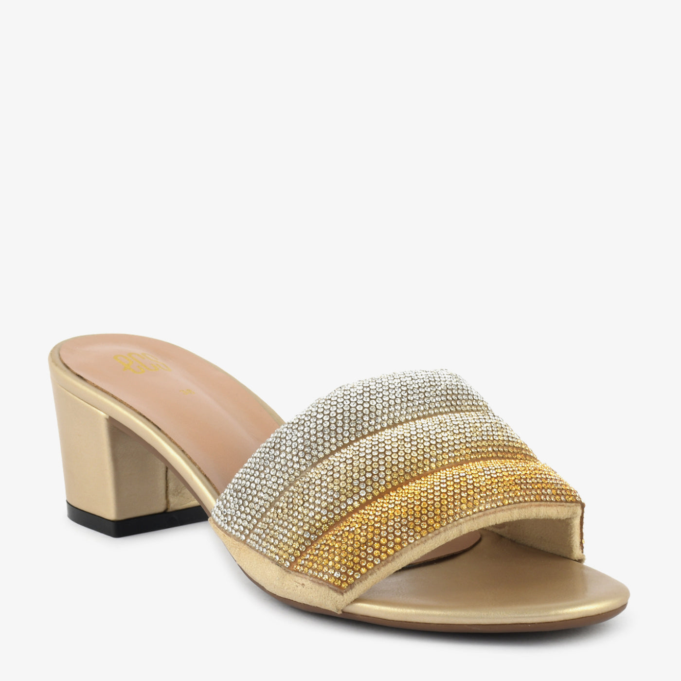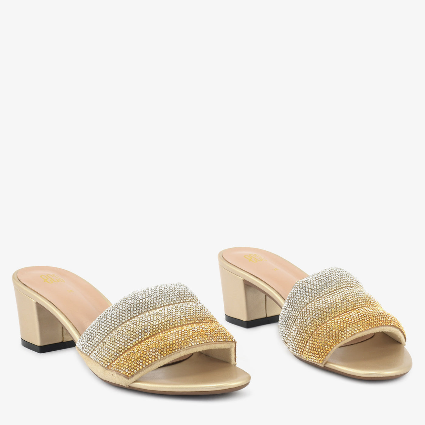 Shimmer and shine with the "Golden Hour" Embellished Heel Slippers. These radiant slippers feature a gradient of dazzling embellishments across the straps, creating a look that's both glamorous and captivating. The comfortable block heel offers subtle lift and all-day wearability, making them perfect for adding a touch of sparkle to any special occasion.