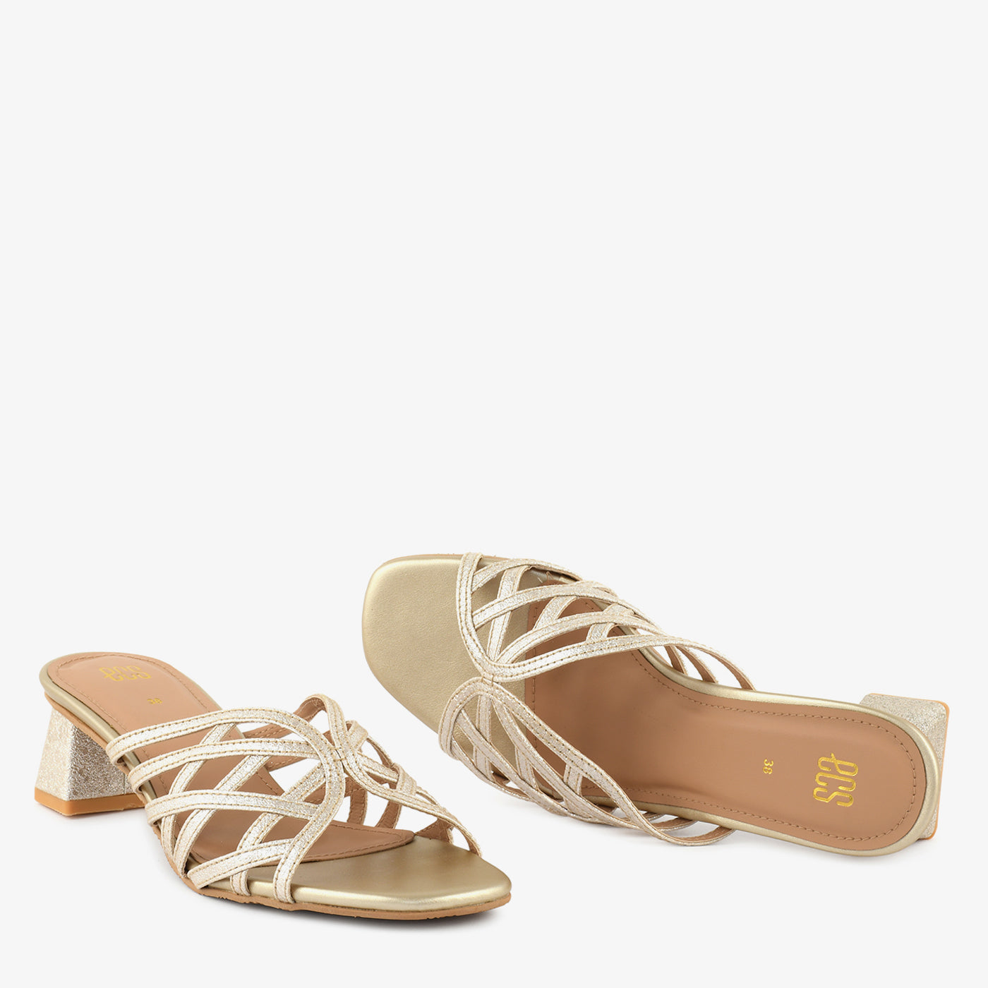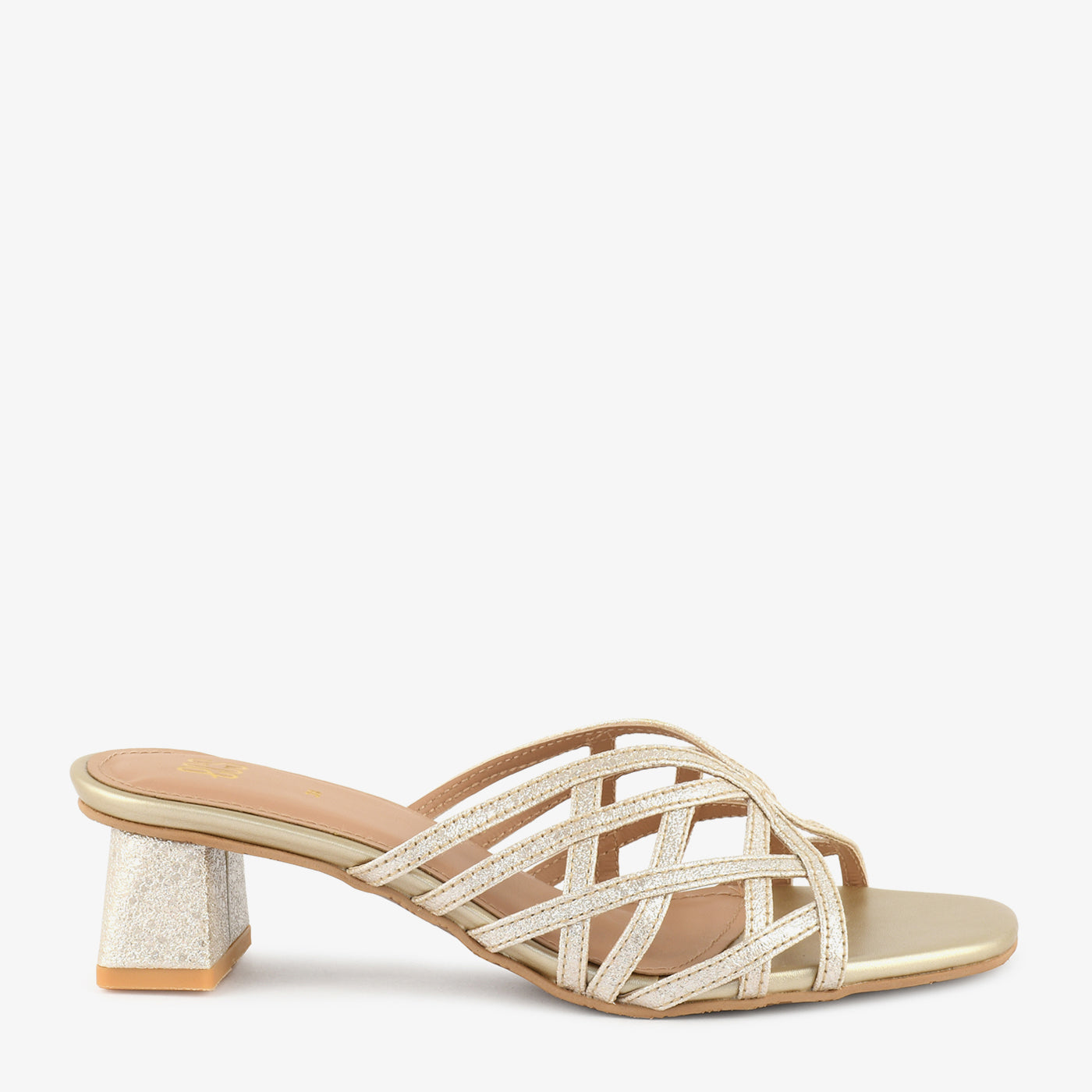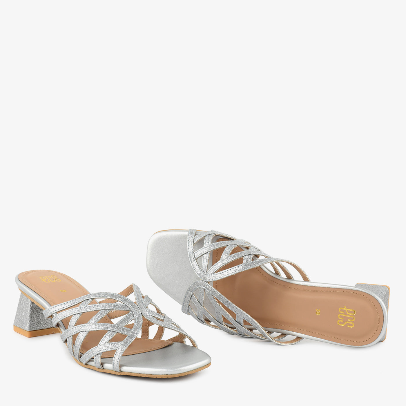 A sparkling showcase of contemporary finesse, these block heel slippers feature a multi-strap upper with a glittering finish, offering structure and shine in one. The geometric heel adds a subtle twist, making it perfect for elevating casual or formal looks.
