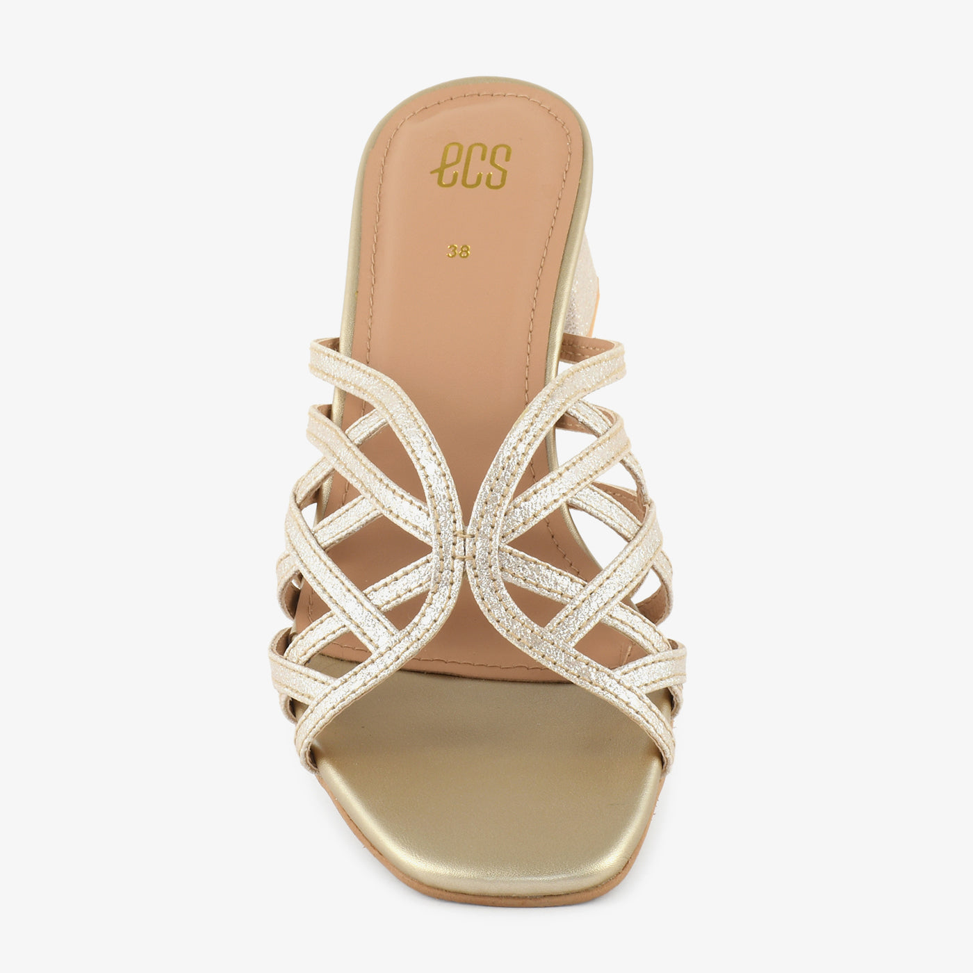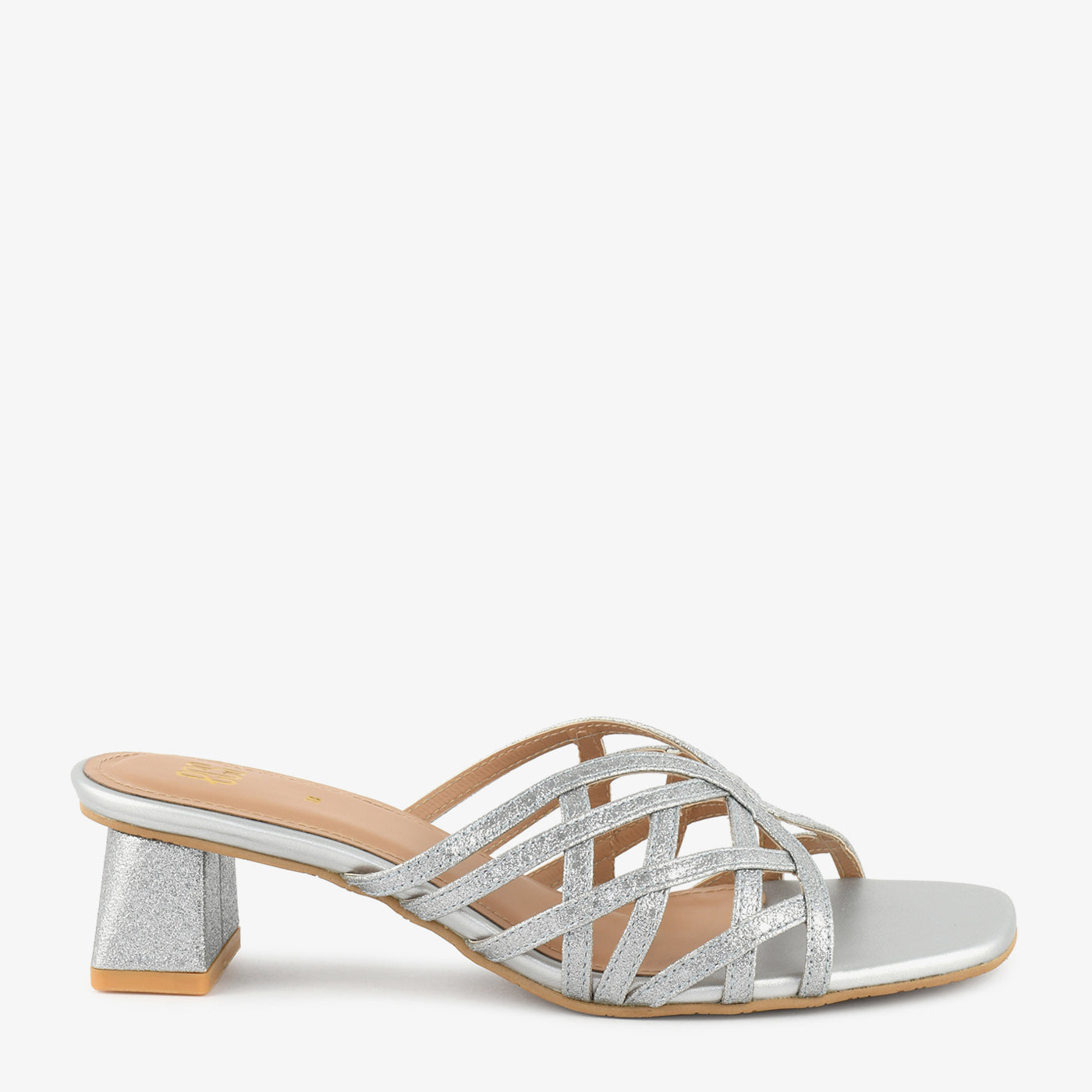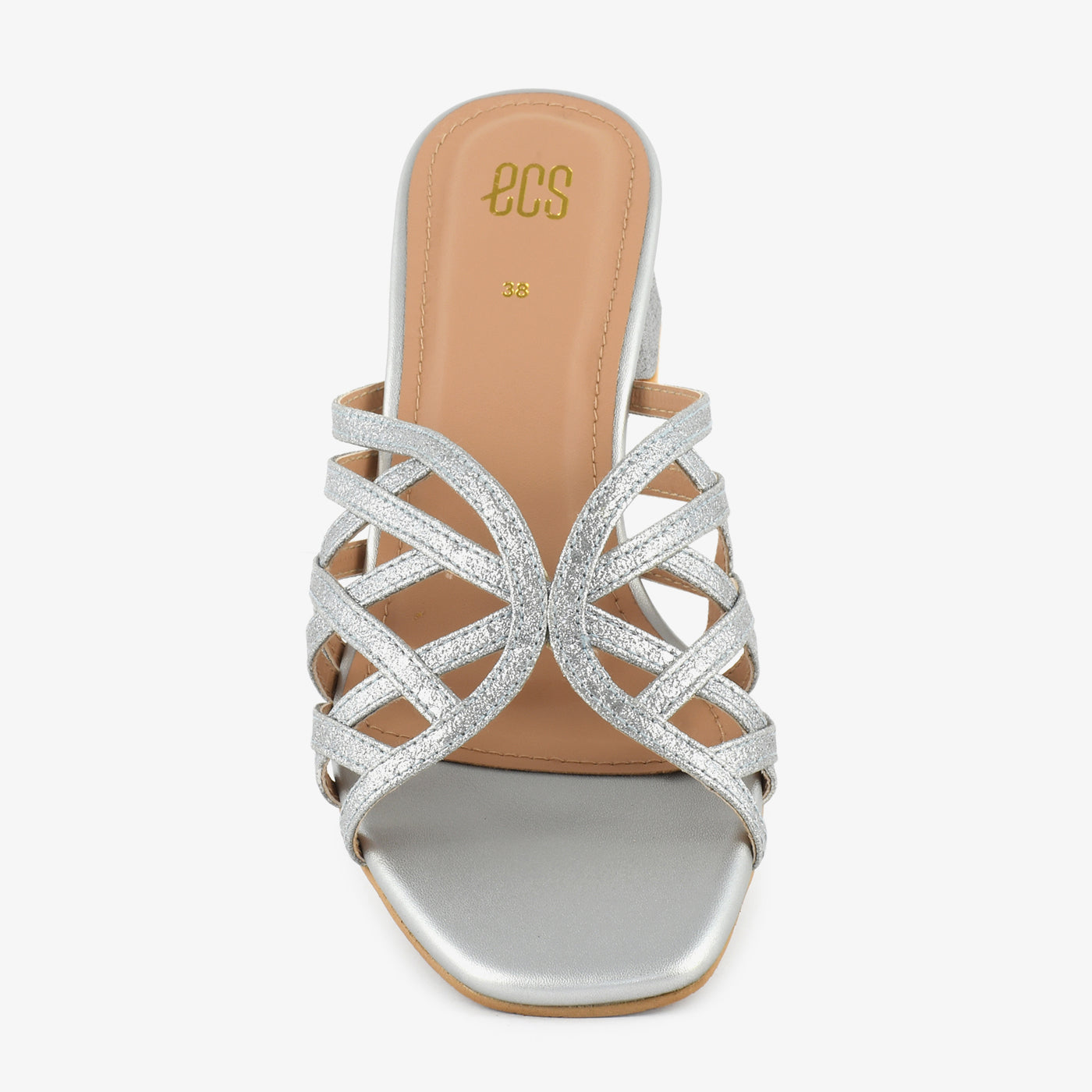 A sparkling showcase of contemporary finesse, these block heel slippers feature a multi-strap upper with a glittering finish, offering structure and shine in one. The geometric heel adds a subtle twist, making it perfect for elevating casual or formal looks.