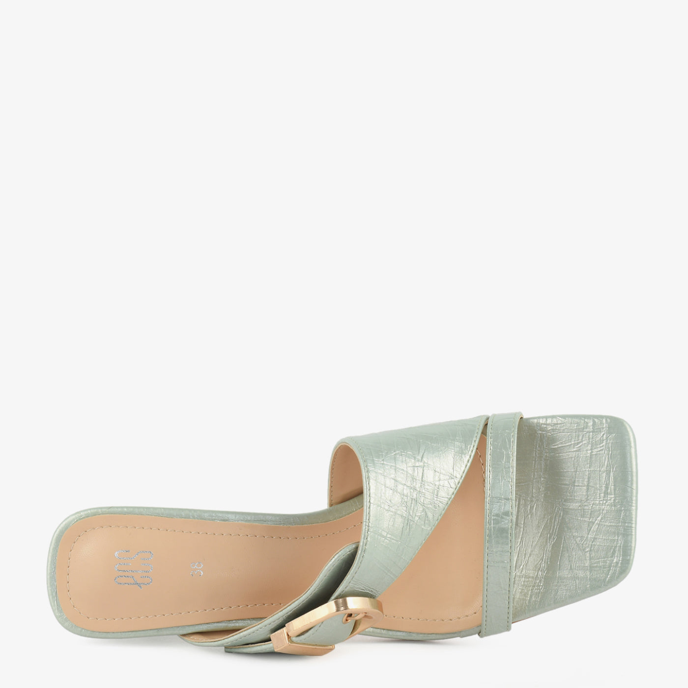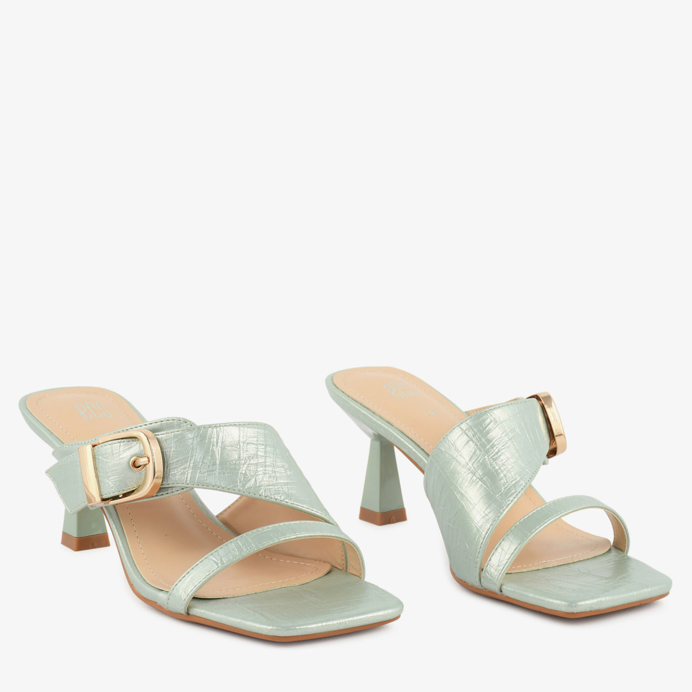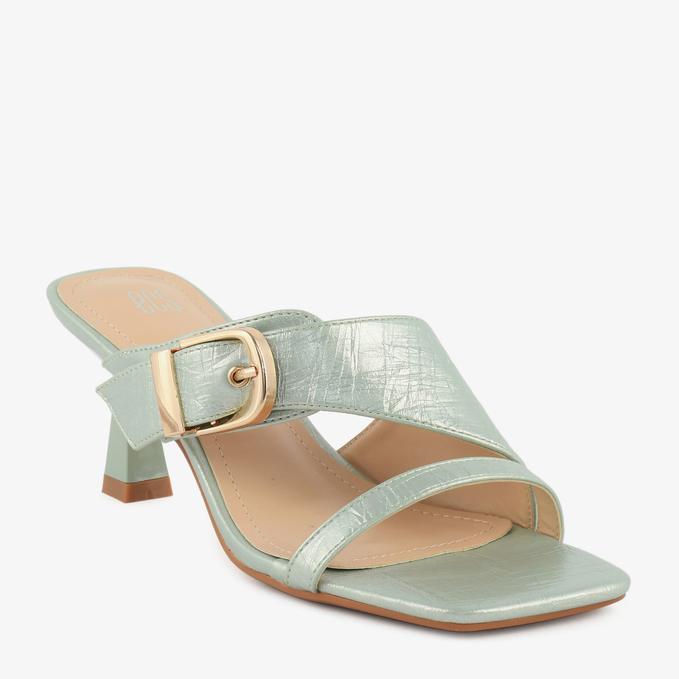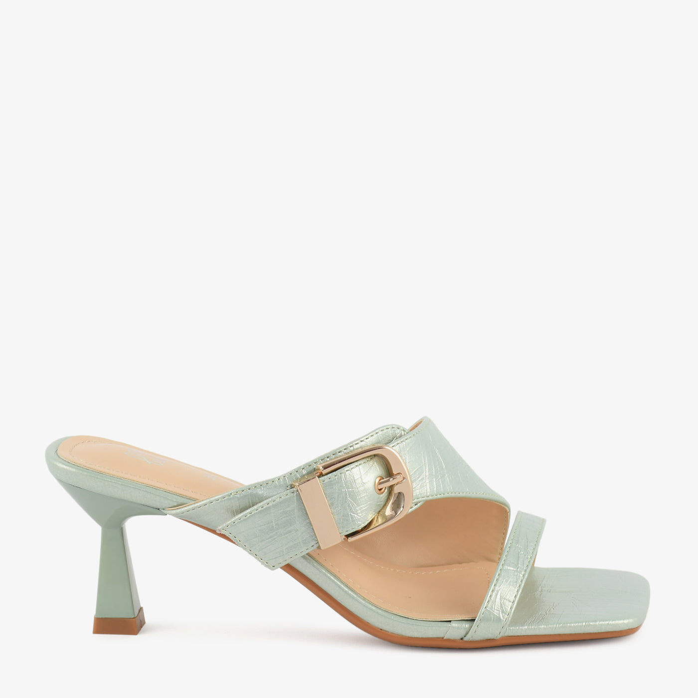 • Design: Open-toe heel with wide front strap and decorative buckle