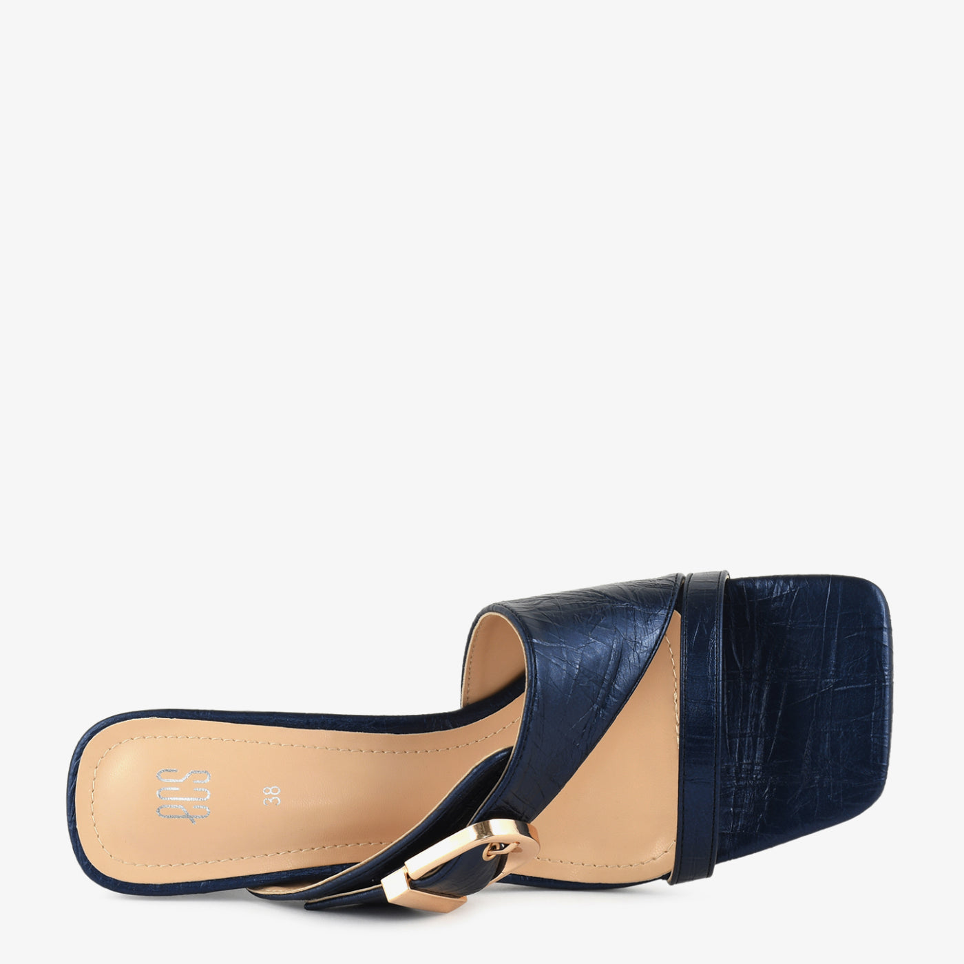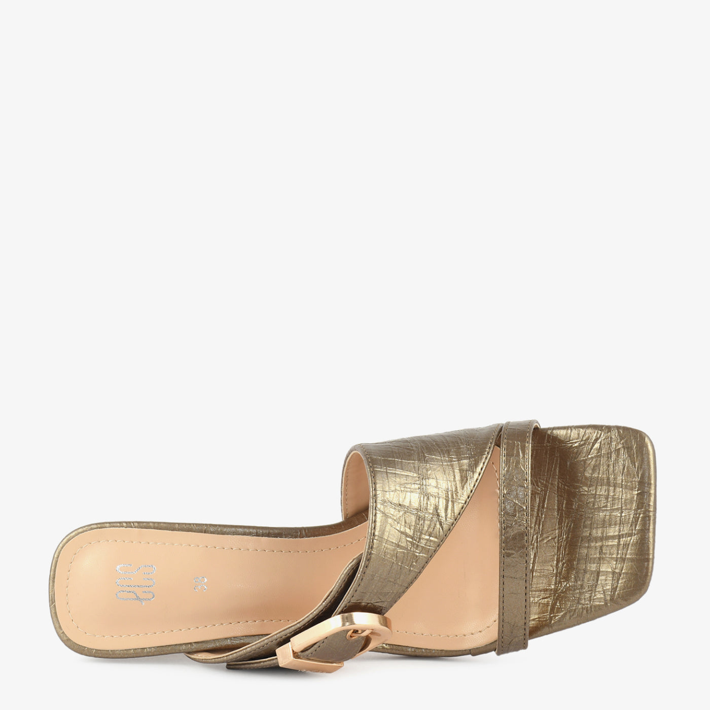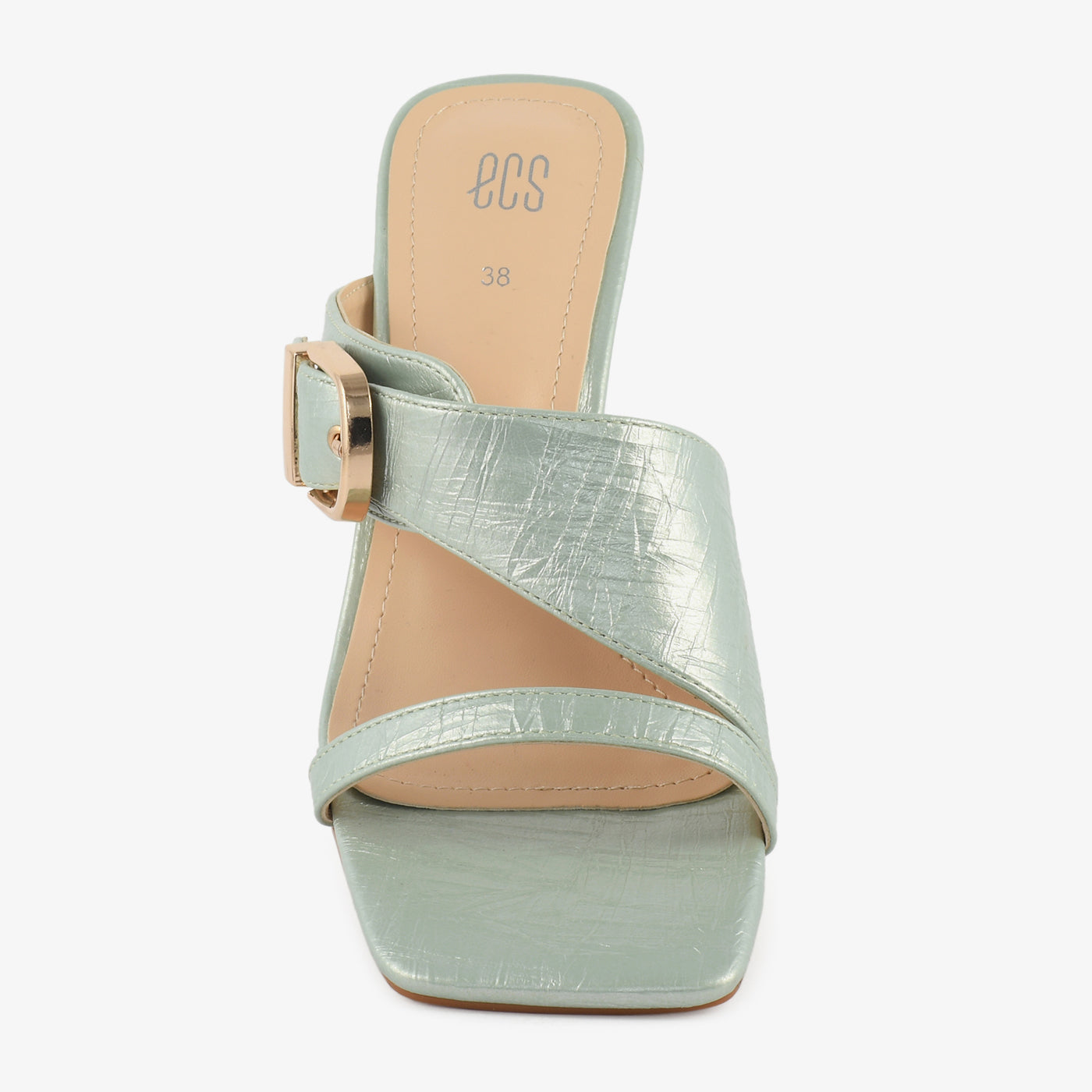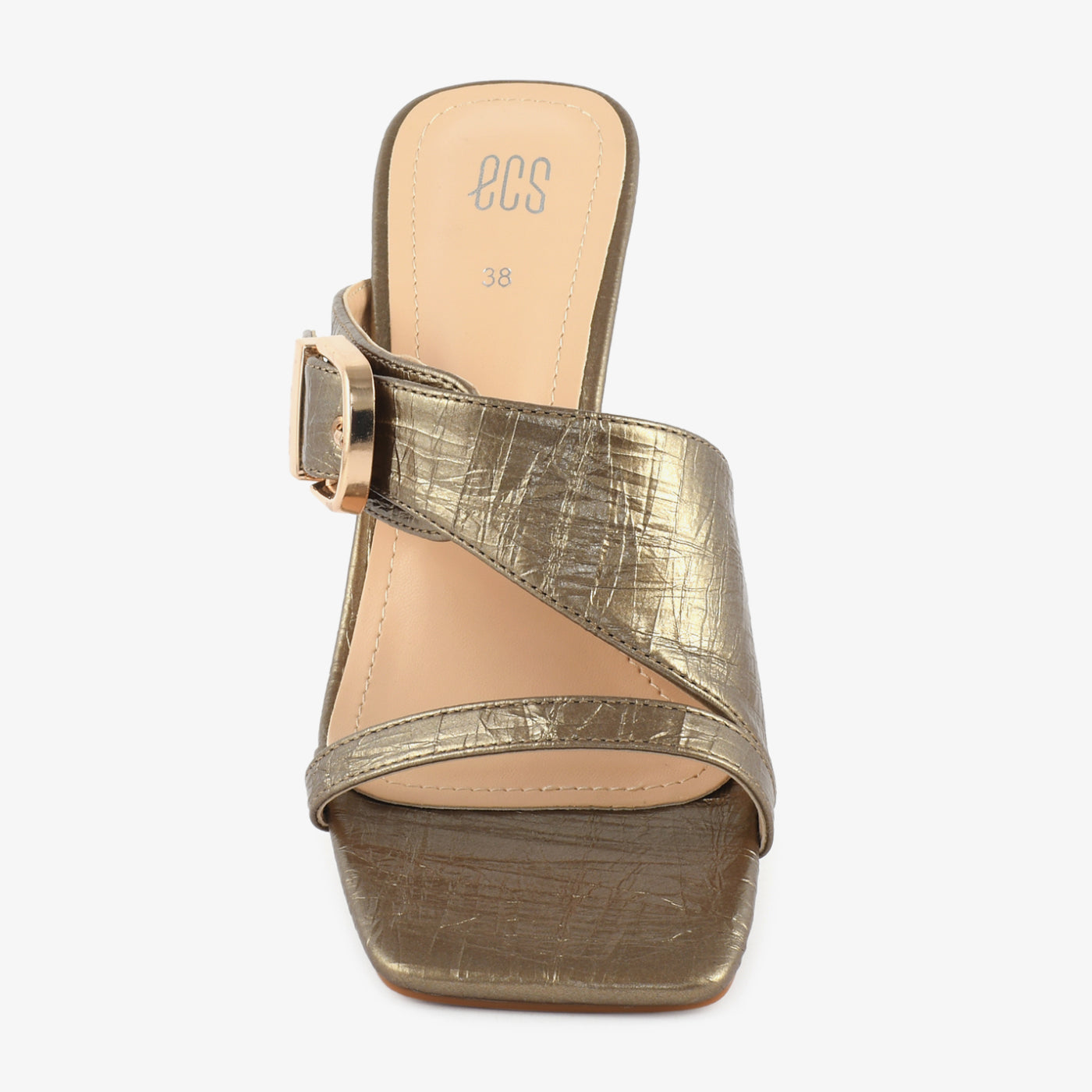 • Design: Open-toe heel with wide front strap and decorative buckle