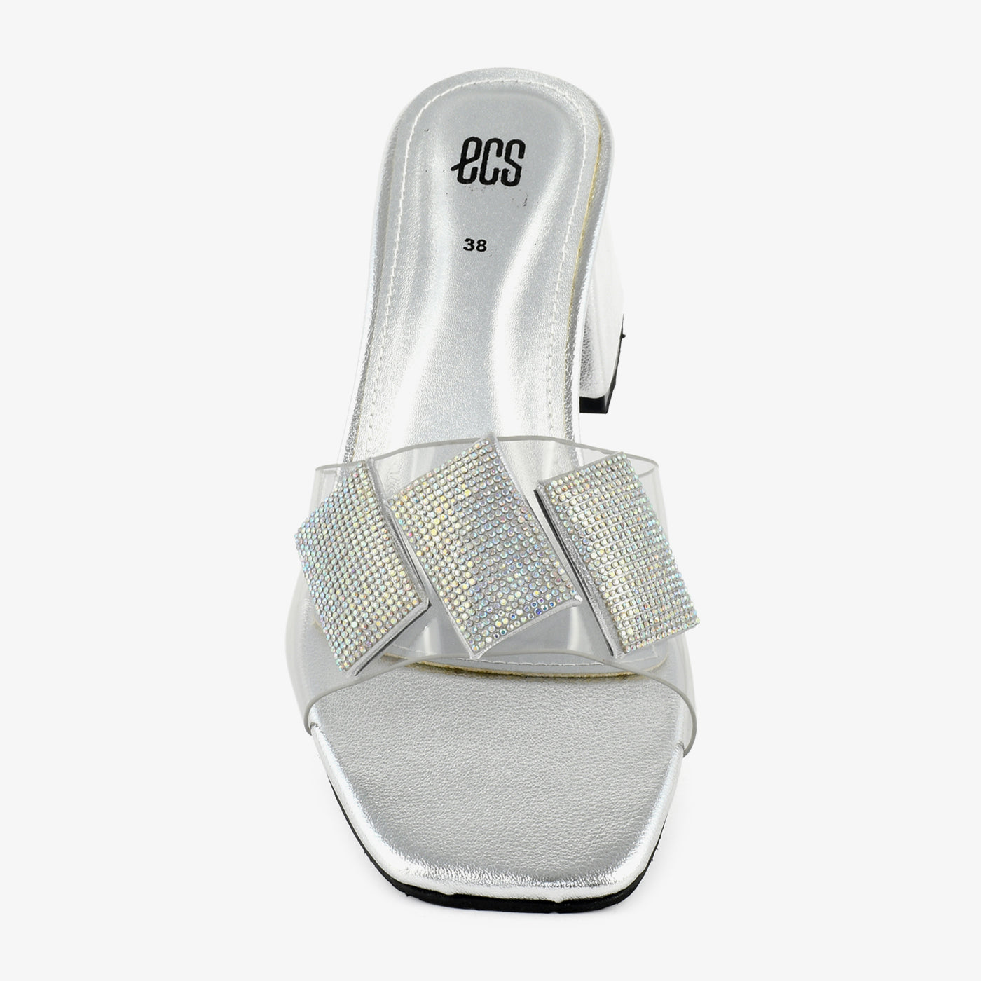 This stylish heeled slipper features a modern open-toe design enhanced with sparkling stone embellishments for a glamorous look. The transparent strap adds a trendy touch while providing a secure and...