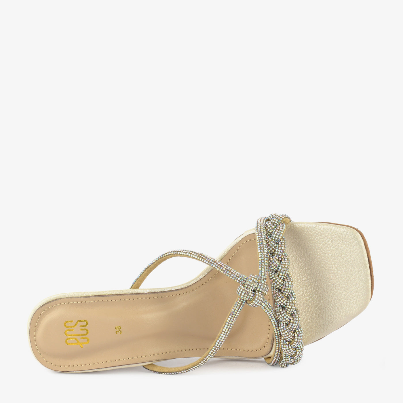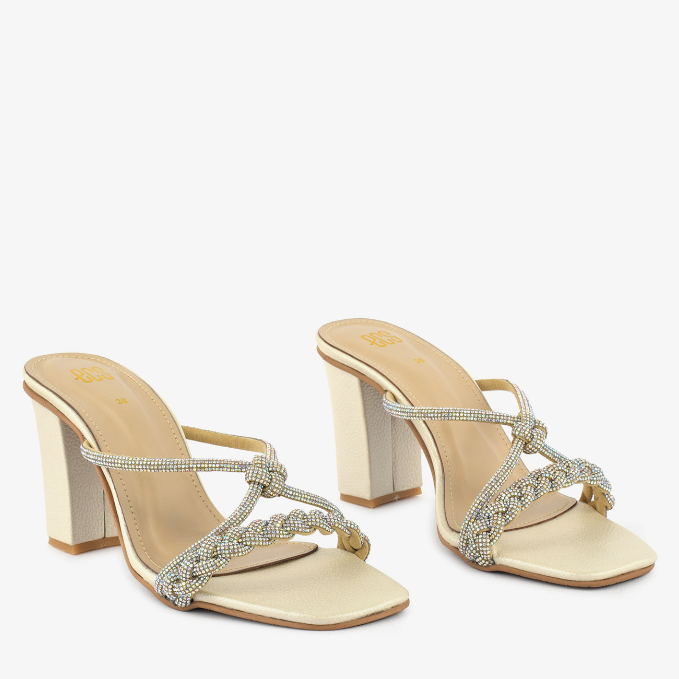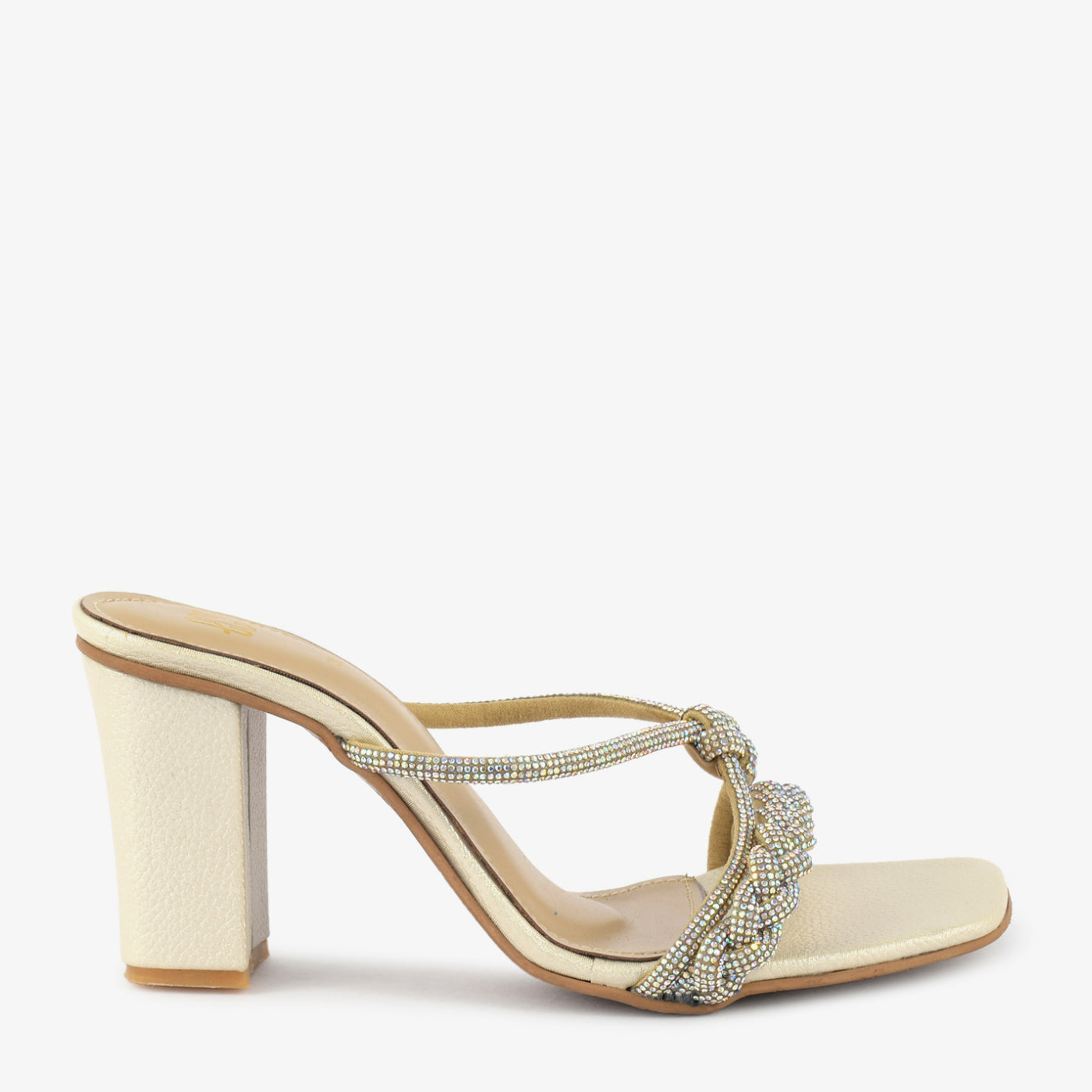 Ivory Knot Glam Heels offer a blend of modern style and dazzling detail. These ivory heels feature a chic square toe and a comfortable block heel, complemented by intricately knotted straps adorned with sparkling embellishments. The backless design adds ease and elegance, making them perfect for dressy occasions or adding a touch of glamour to your evening look.