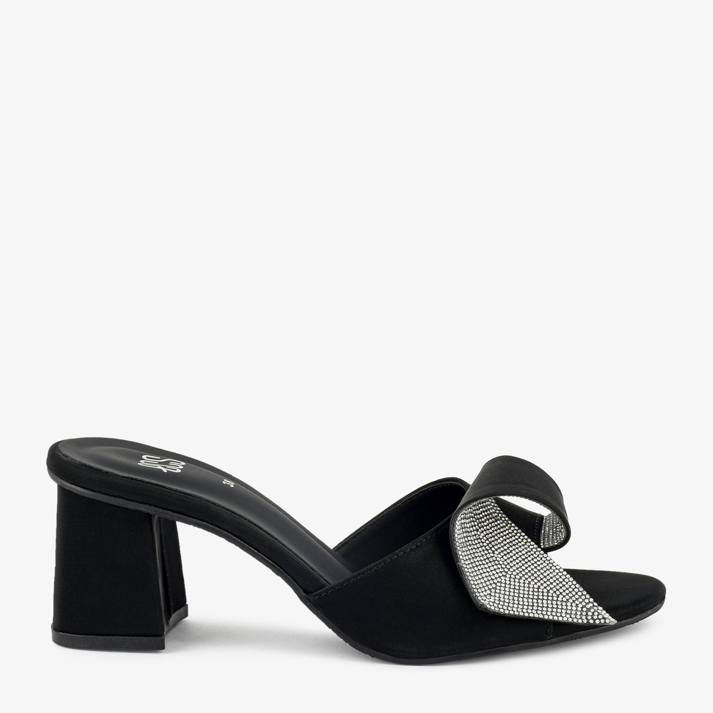 These sophisticated black heels showcase a striking rhinestone flap detail over a satin base, perfect for upscale soirées. The block heel offers all-day comfort with a touch of drama.