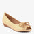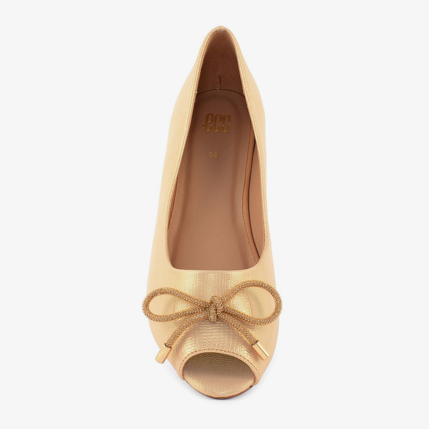 This low-wedge pump is adorned with a glossy bow and a pearl-studded circle for a festive flair.