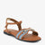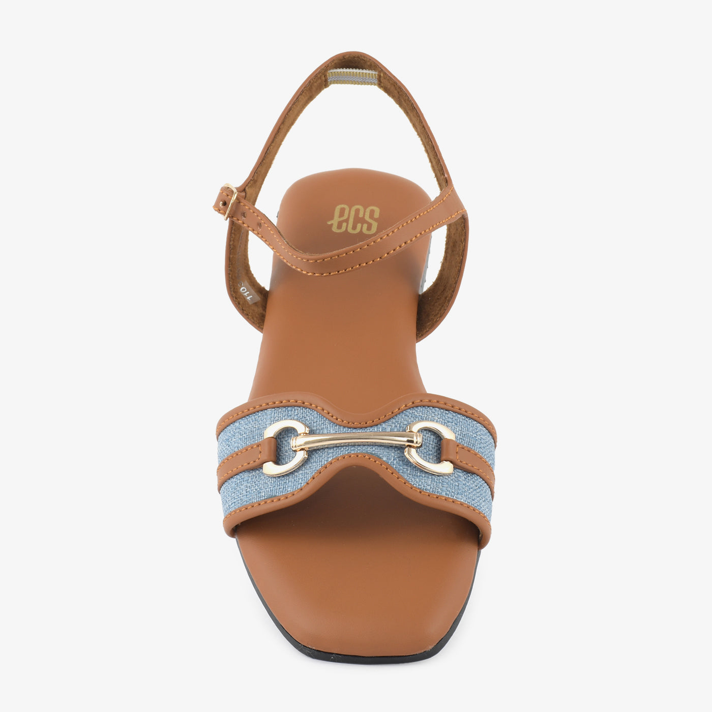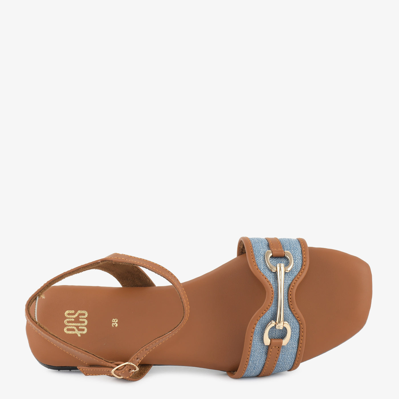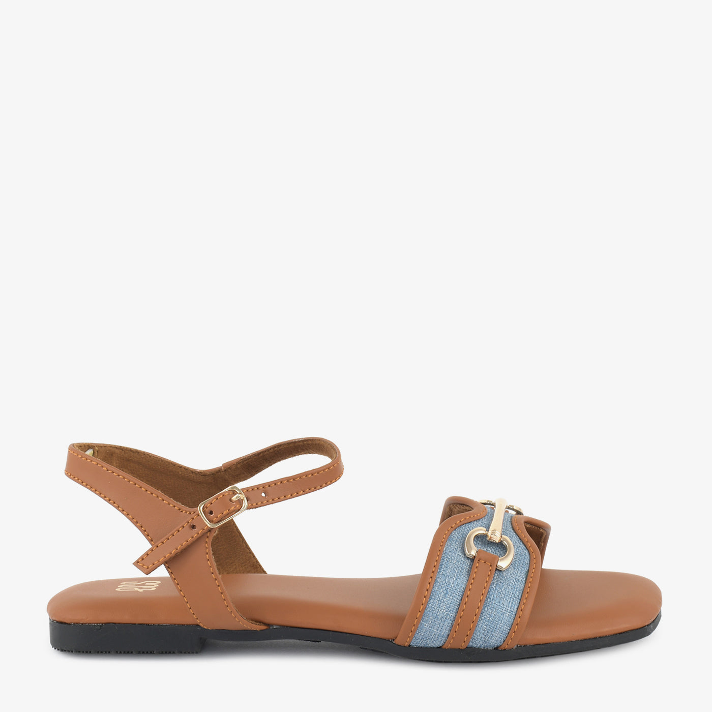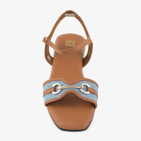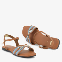Step into casual sophistication with these sandals. The design features a blend of a warm tone with a denim-like strap and a prominent metallic embellishment, offering a stylish and comfortable look for everyday wear. The flat sole provides comfortable support.