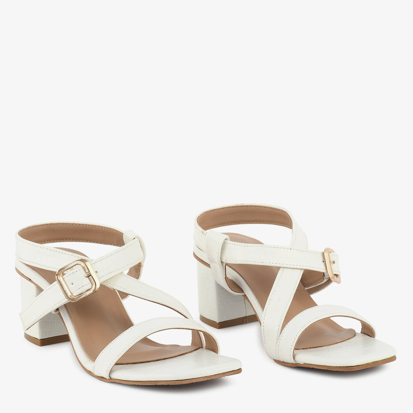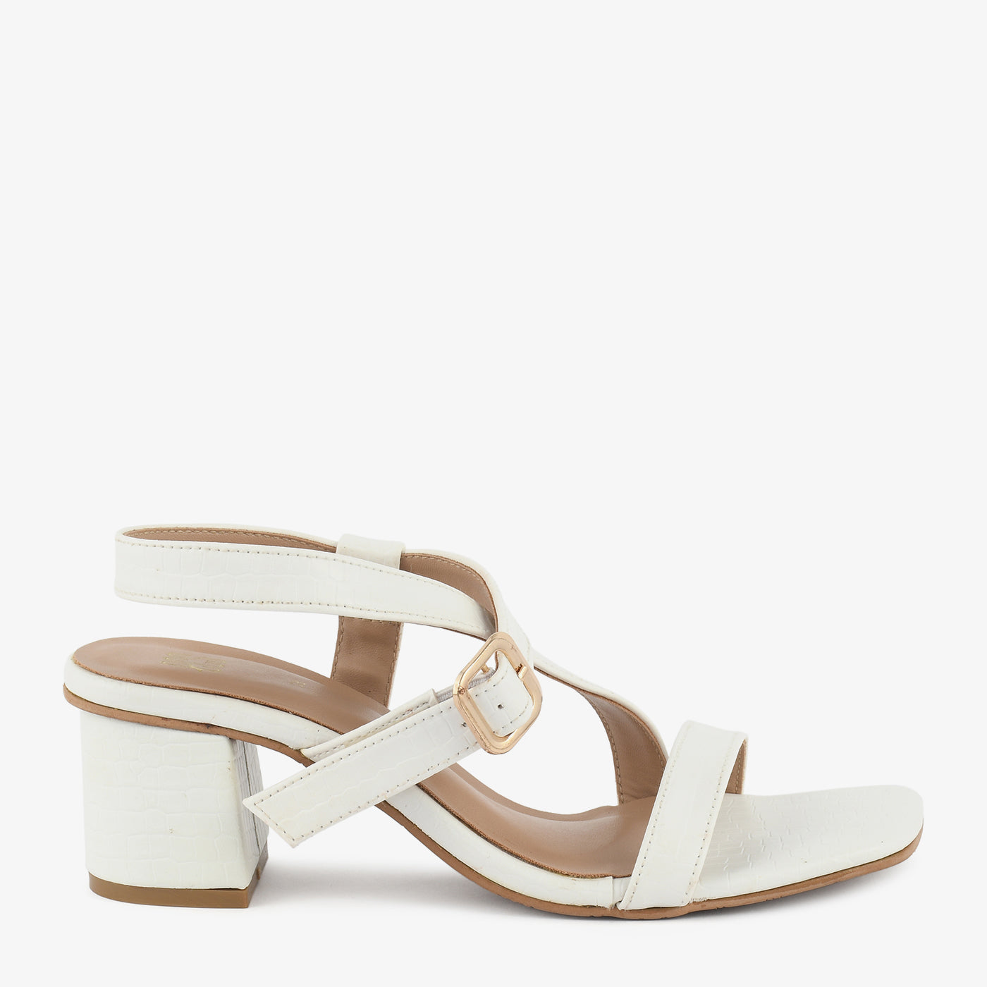 A strappy sandal with a block heel and metallic buckle closure. Perfect for both workwear and evening outings.