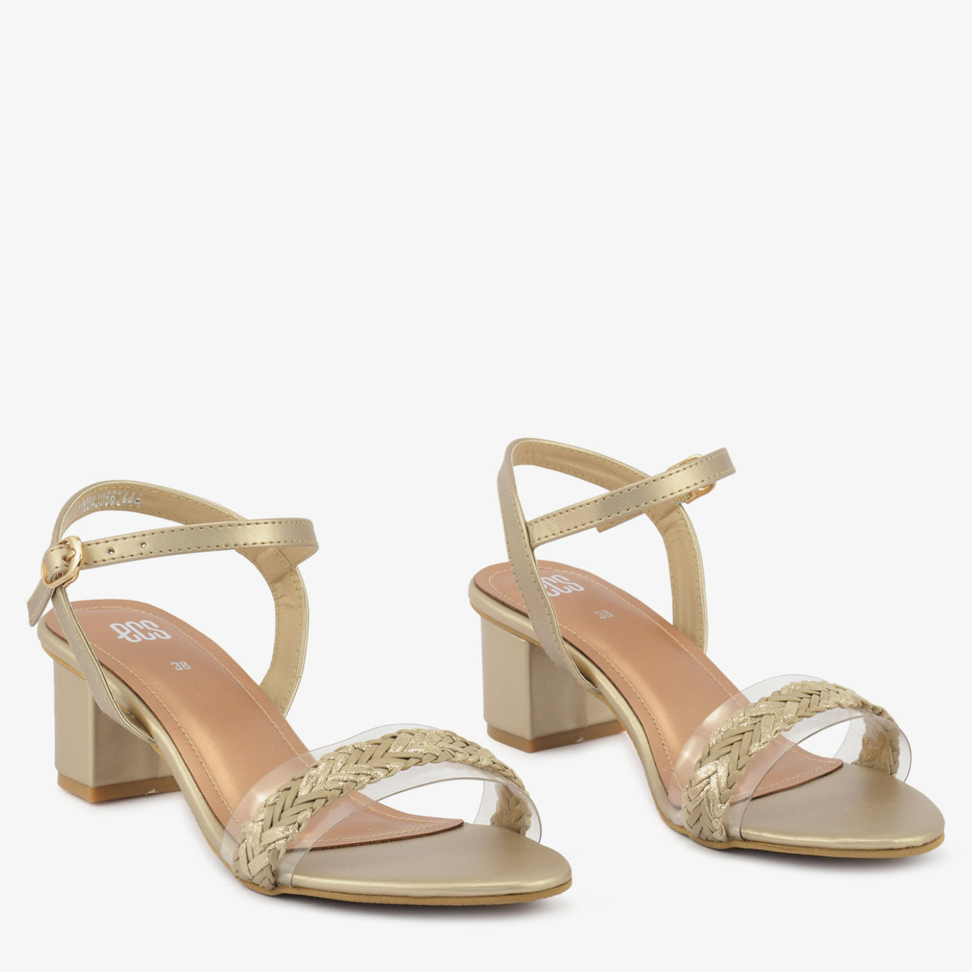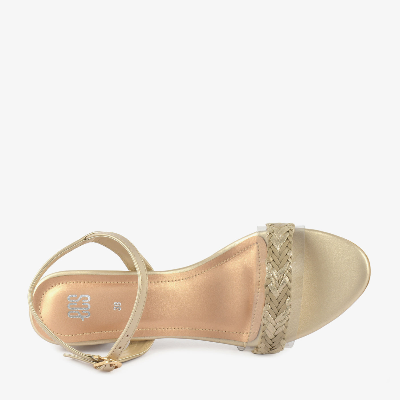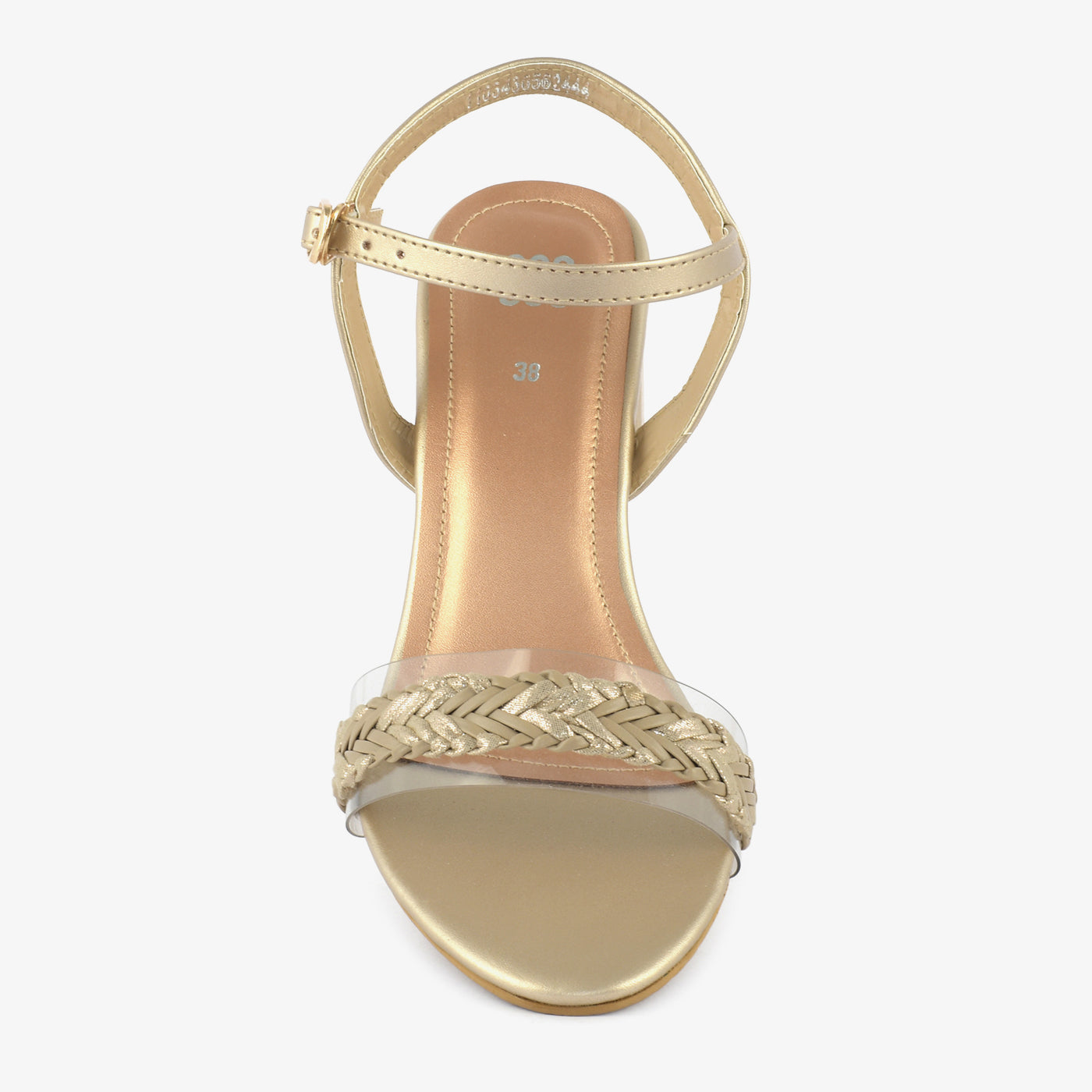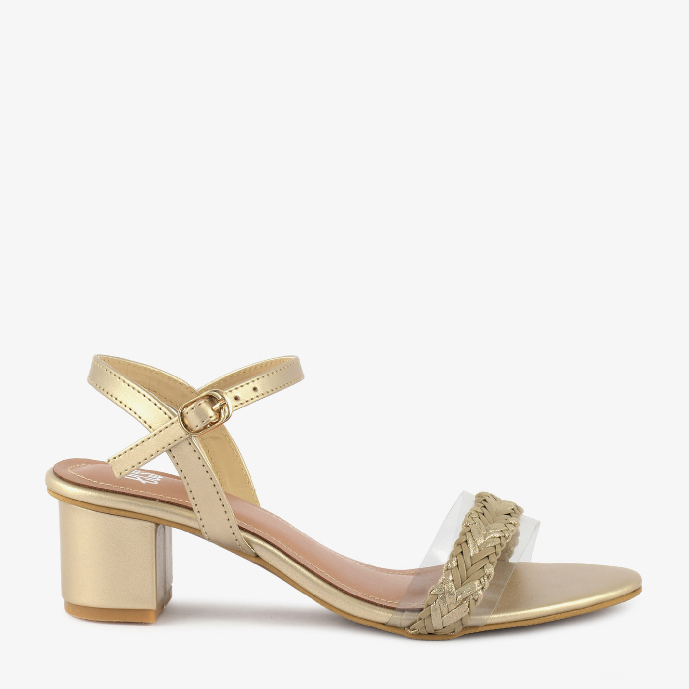 Add a touch of refined glamour to your look with these Golden Braided Block Heels. Featuring a braided strap detail and a transparent panel, these heels offer a modern and elegant appeal. The comfortable block heel provides stability and height for all-day wear.