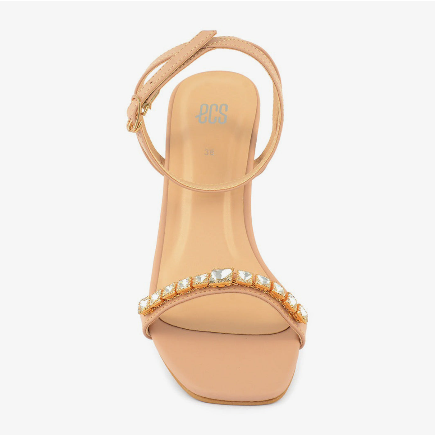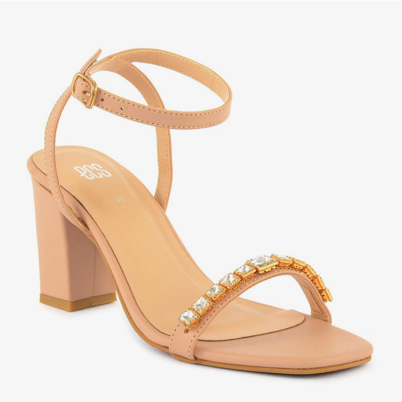 Step into subtle elegance with these blush-toned heeled sandals, featuring a comfortable block heel and two delicate straps. The strap across the toes is adorned with sparkling jewels, adding a touch of refined glamour to your look in Lahore.
