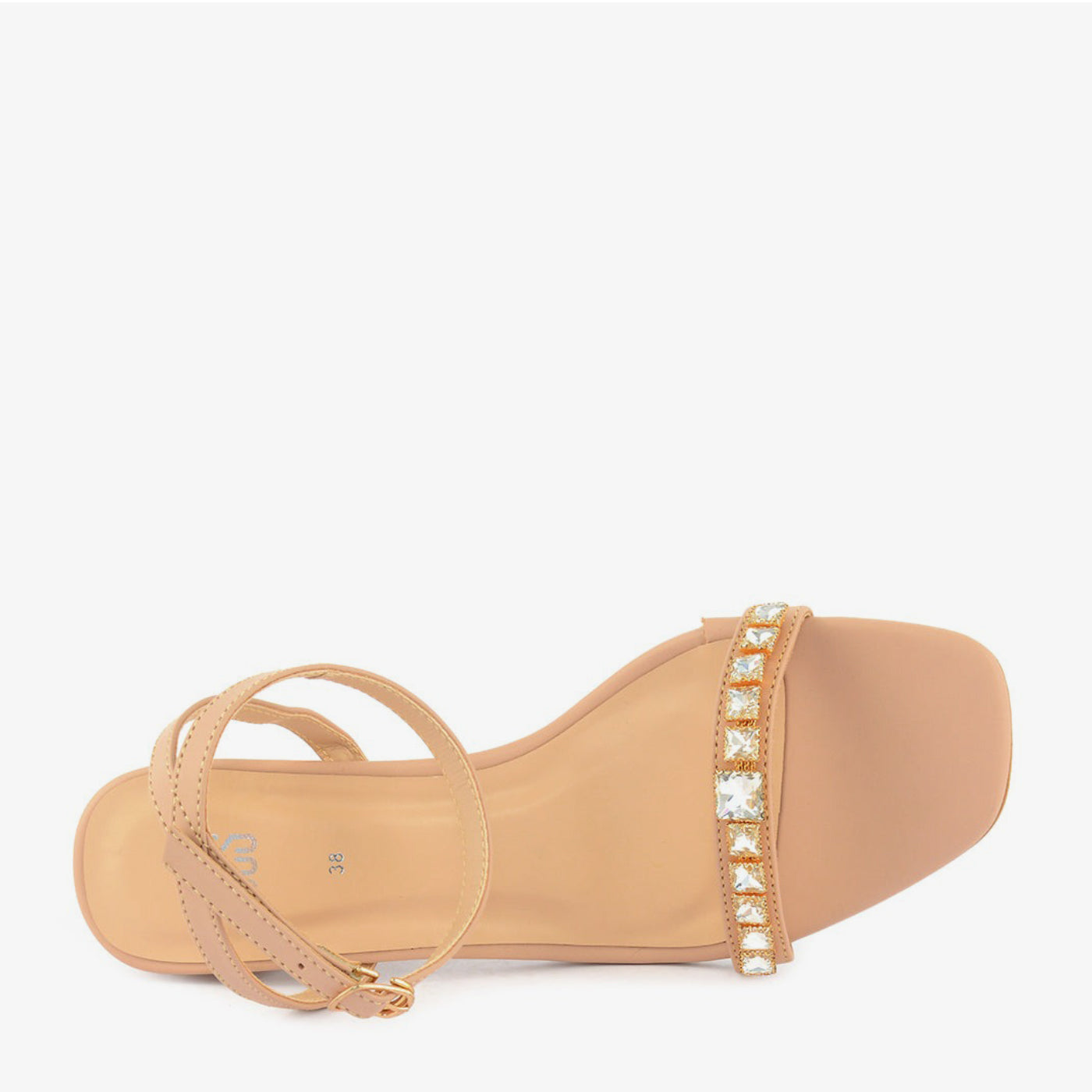 - Design: Open toe, Two thin straps, Jewel embellishment on toe strap, Adjustable ankle strap