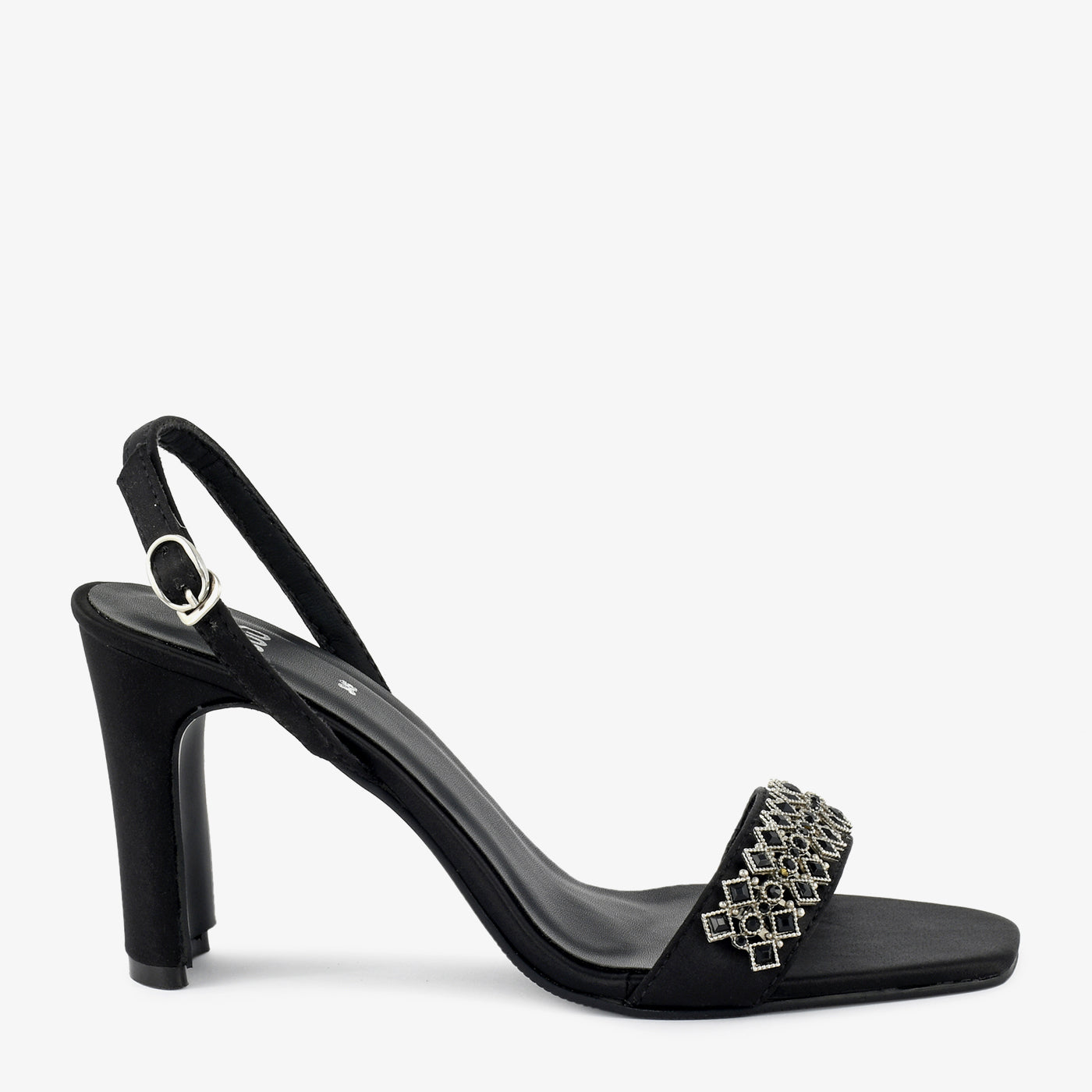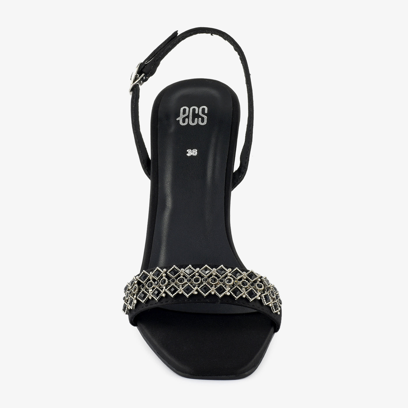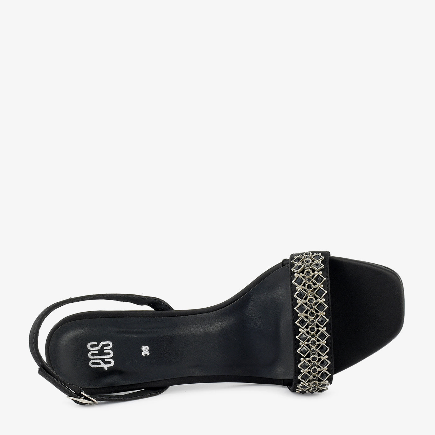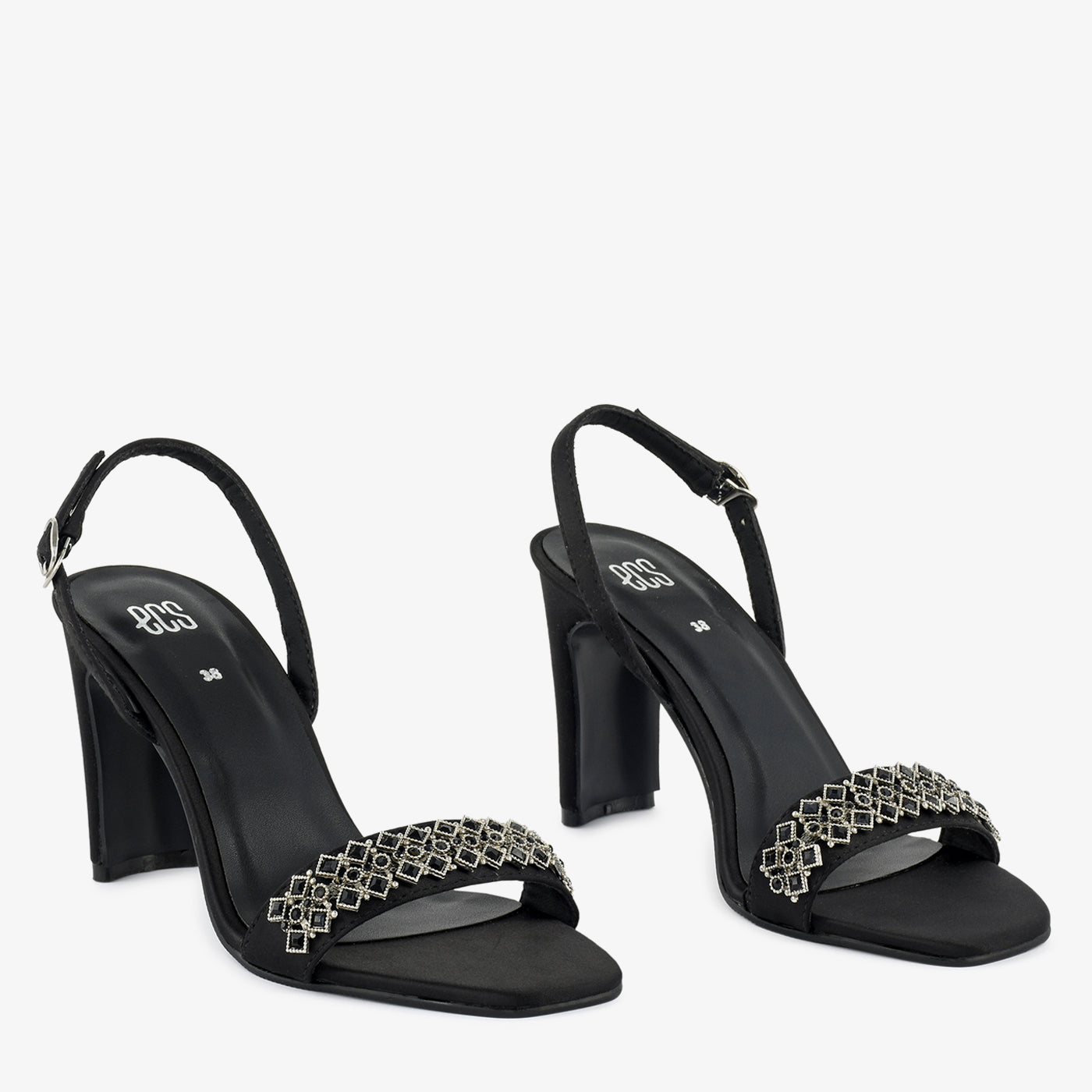A fusion of elegance and edge, these heels feature a structured high heel and a bold front strap adorned with intricate square embellishments. Designed for standout sophistication, they transition effortlessly from formal to festive.